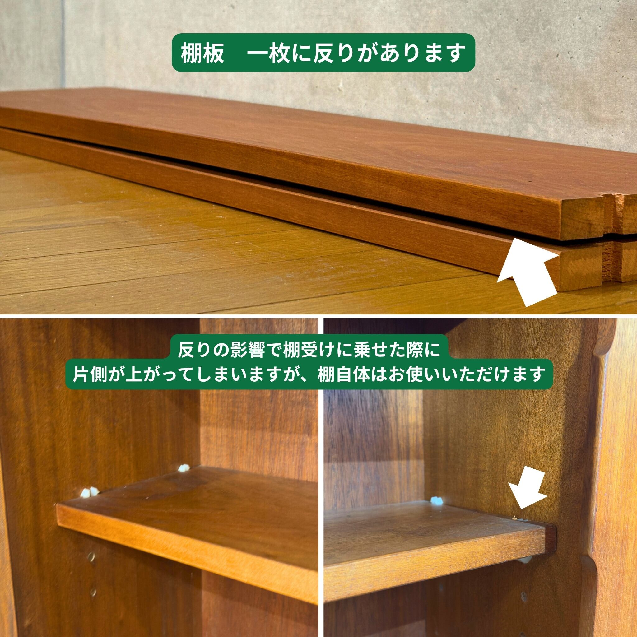 ガラス引戸内の棚板一枚に経年による軽度な反りがございます。棚受けに乗せた際に片側がわずかに浮き上がってしまいますが、棚板自体はご使用いただけます。