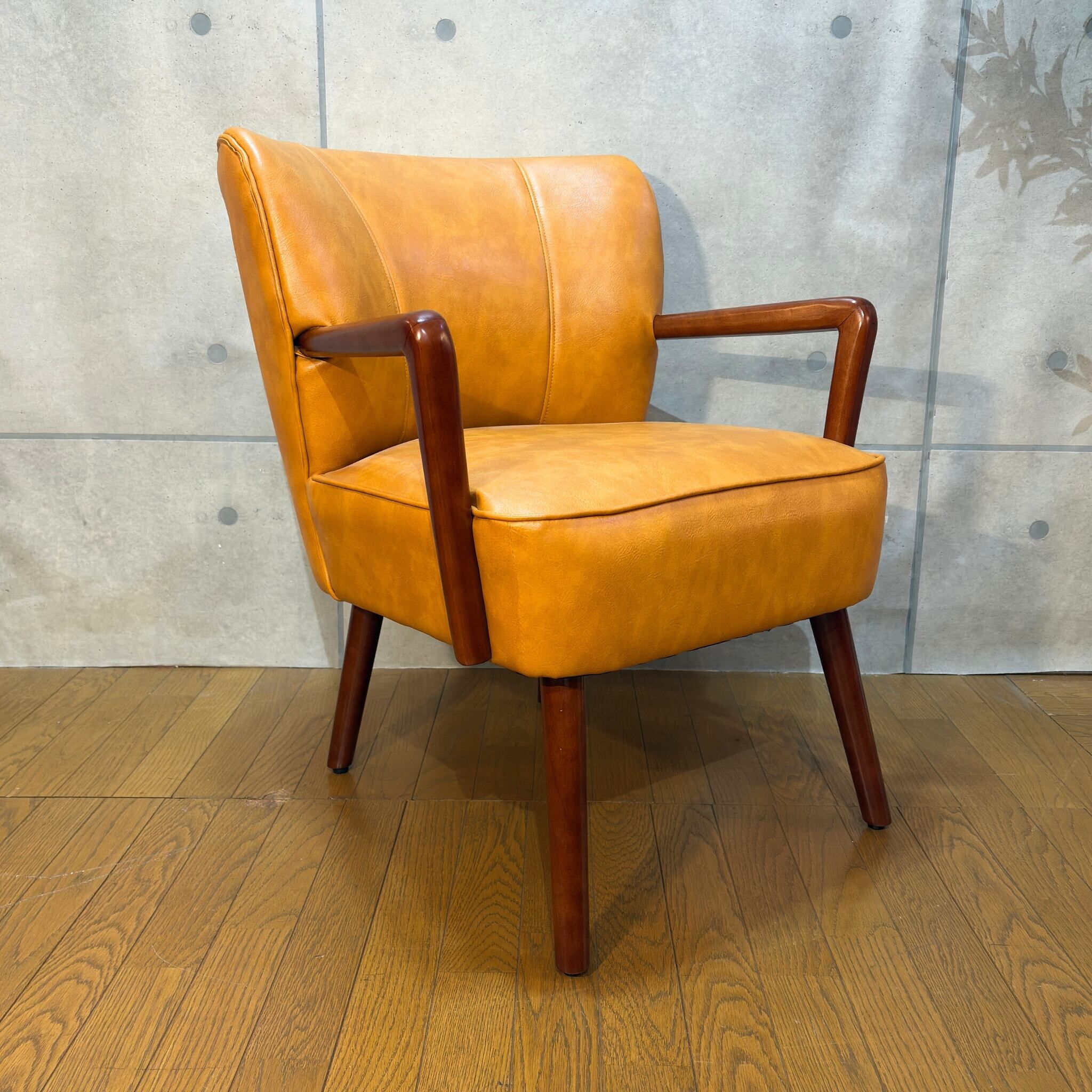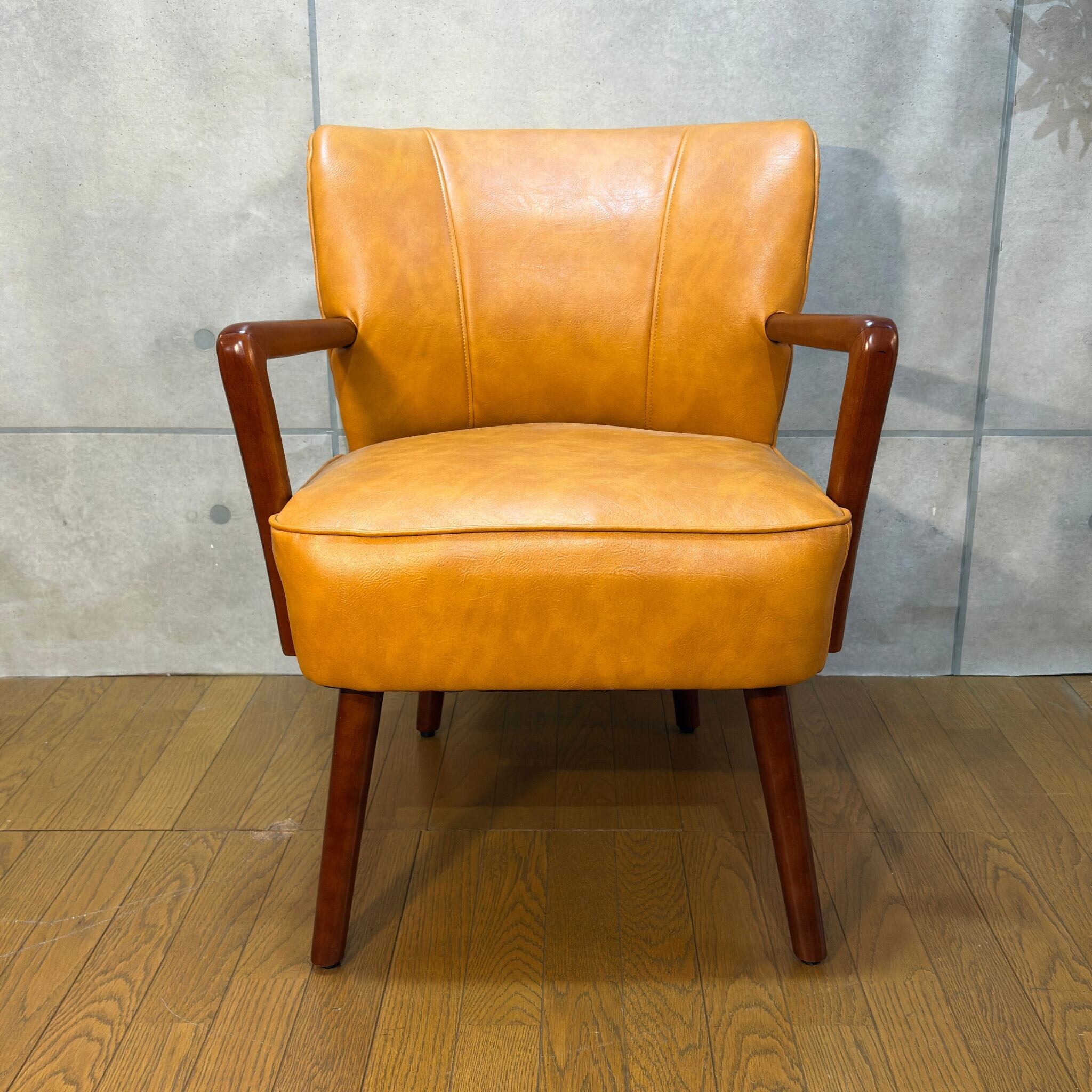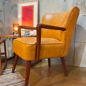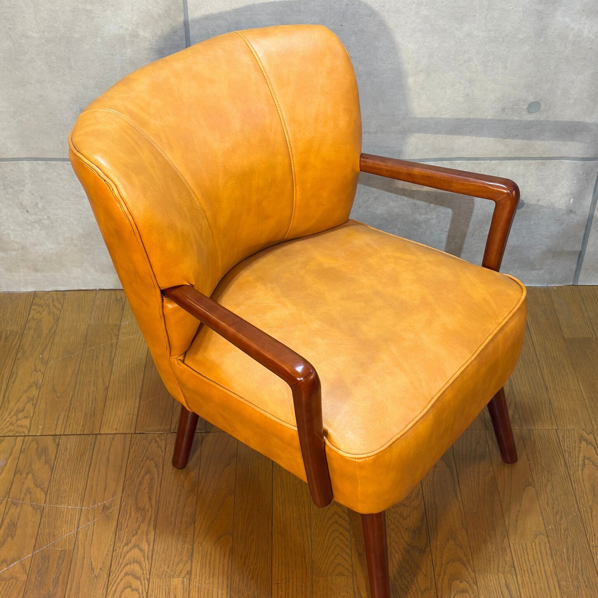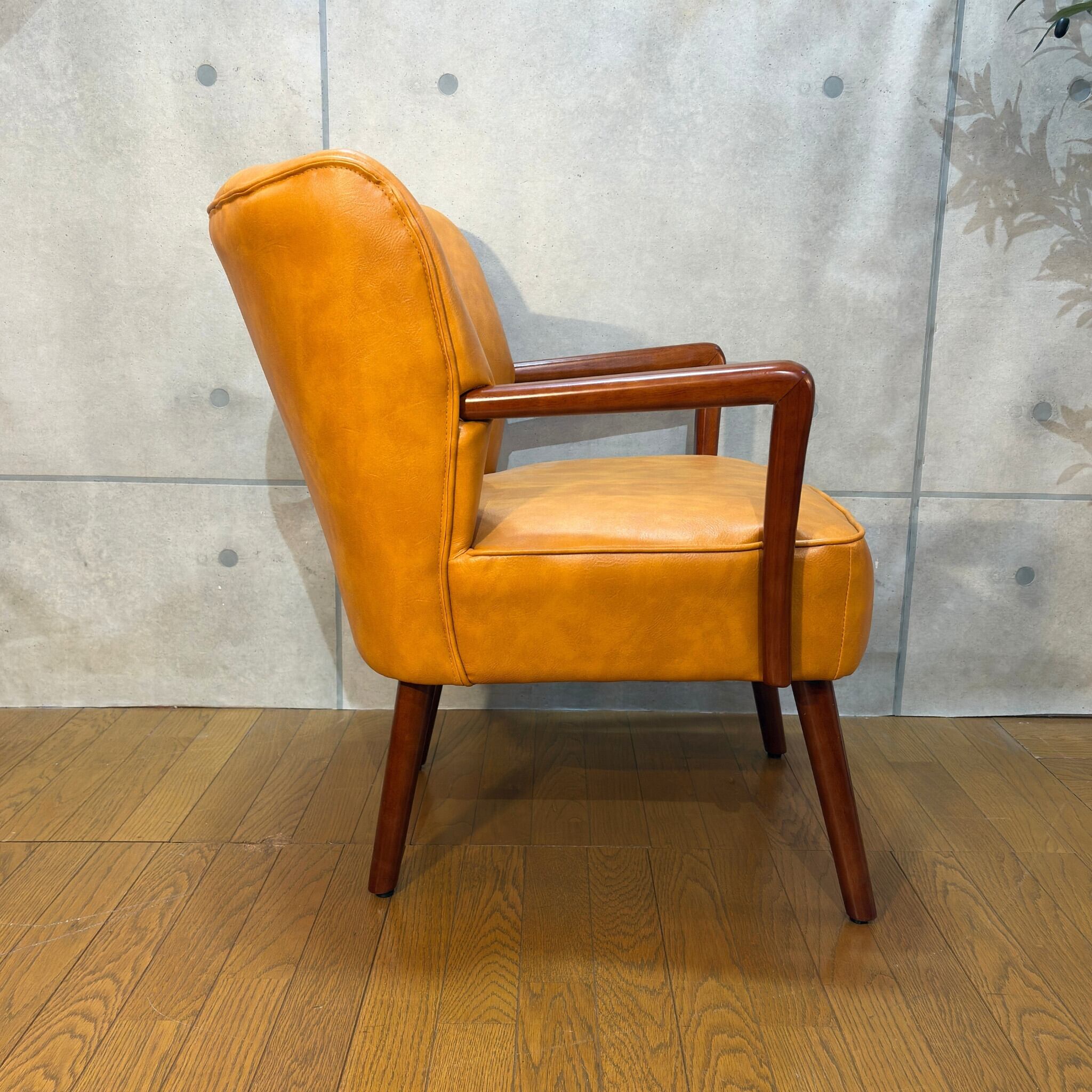ミッドセンチュリーデザインの美しいフォルムを再現したアームチェアです。キャメルオレンジの張地と流れるような曲線の木製アーム、斜めに伸びたテーパードレッグが空間にアクセントとレトロな雰囲気をもたらします。