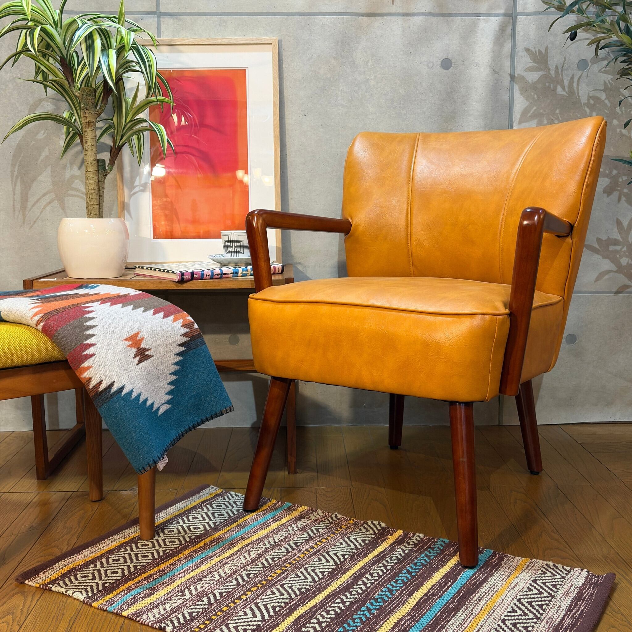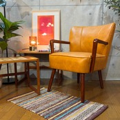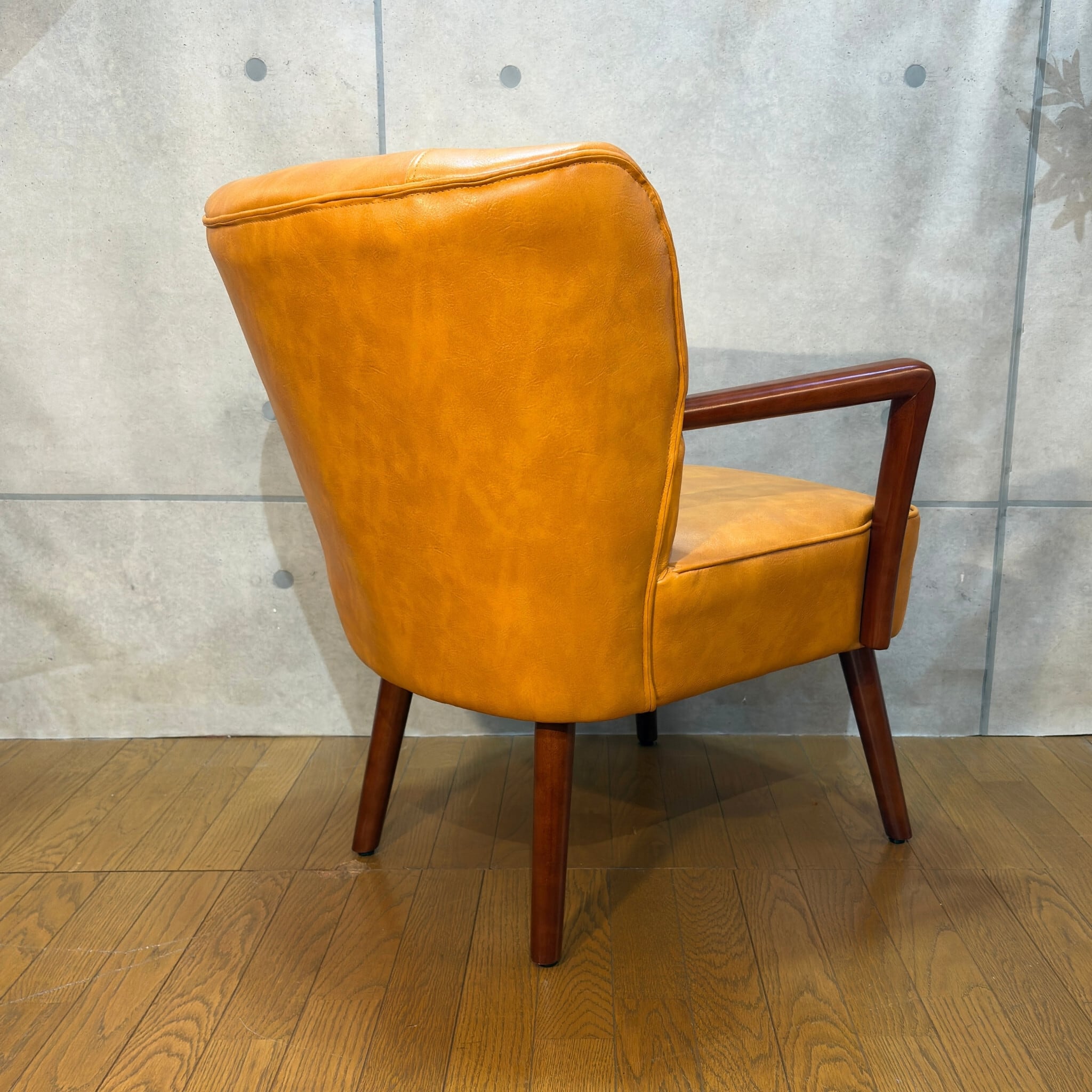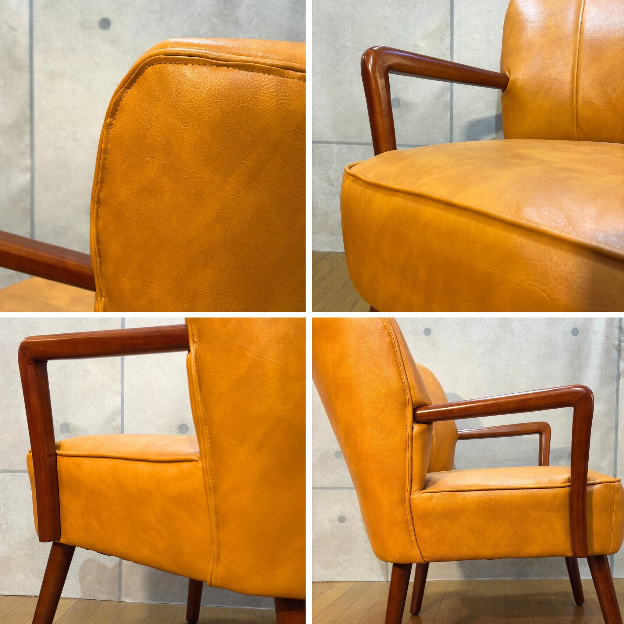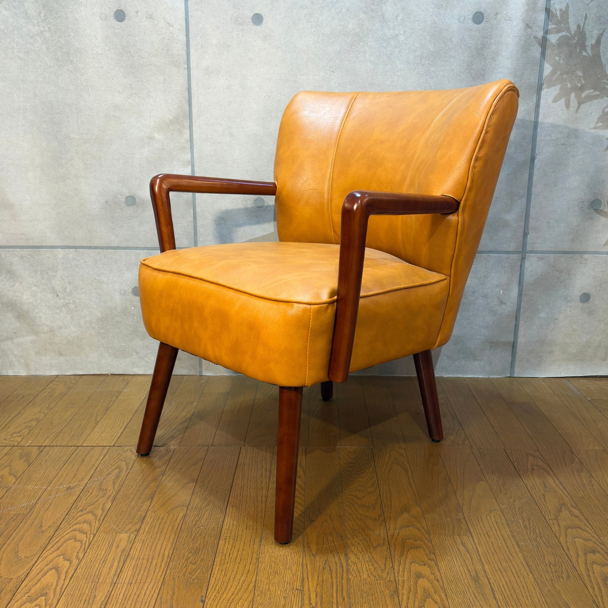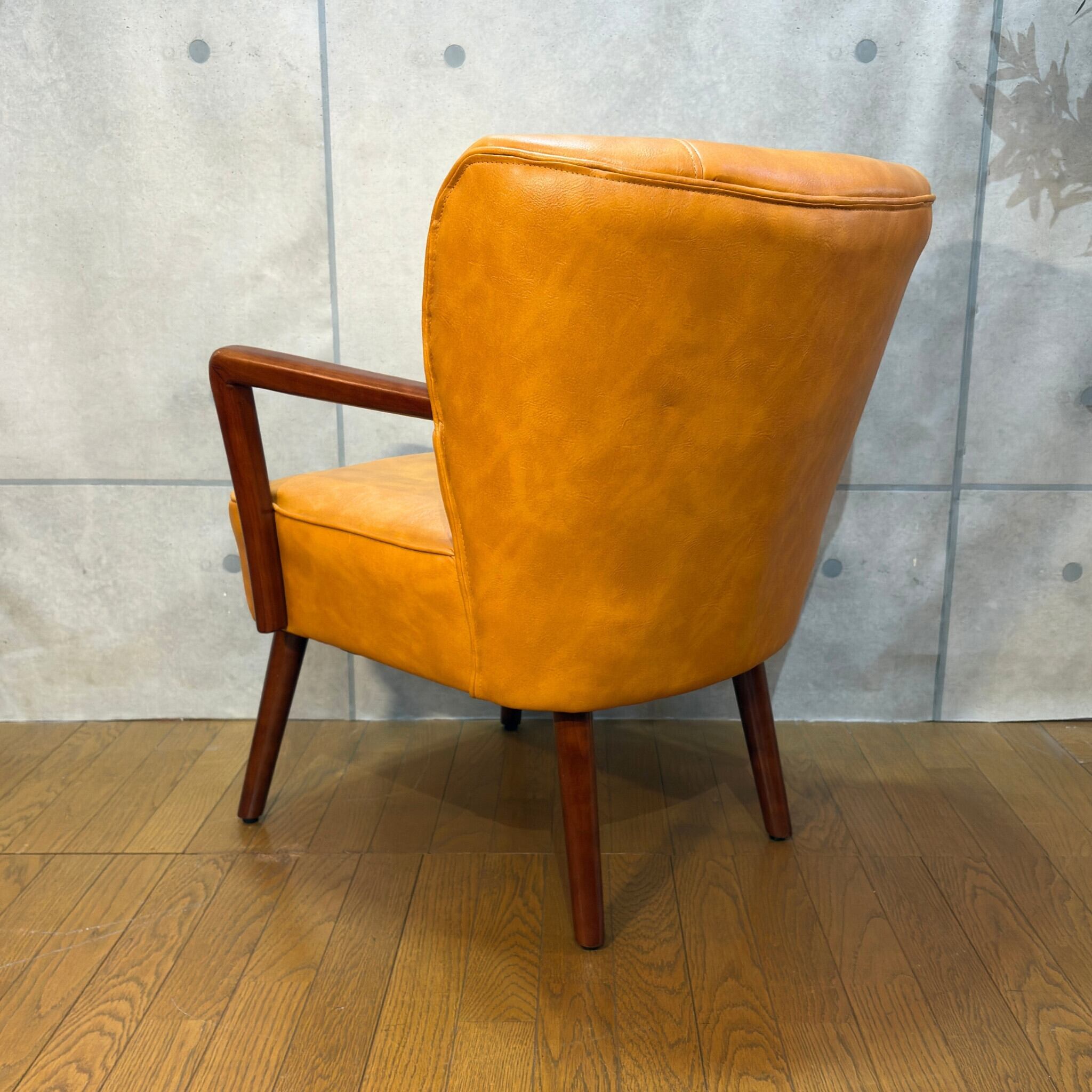 ミッドセンチュリーデザインの美しいフォルムを再現したアームチェアです。キャメルオレンジの張地と流れるような曲線の木製アーム、斜めに伸びたテーパードレッグが空間にアクセントとレトロな雰囲気をもたらします。