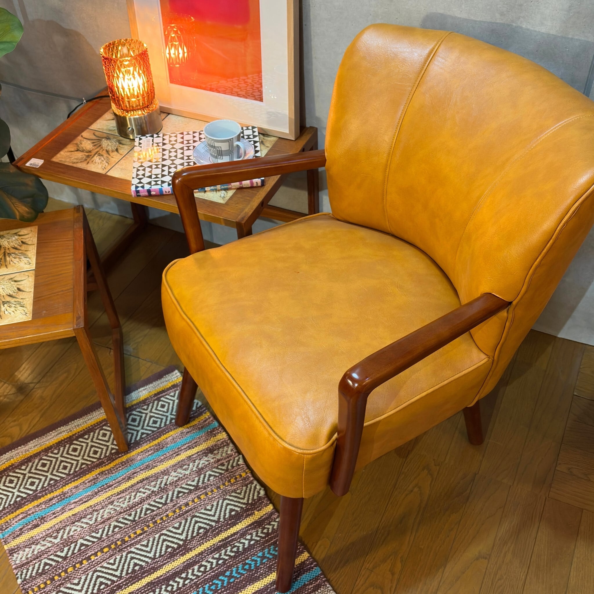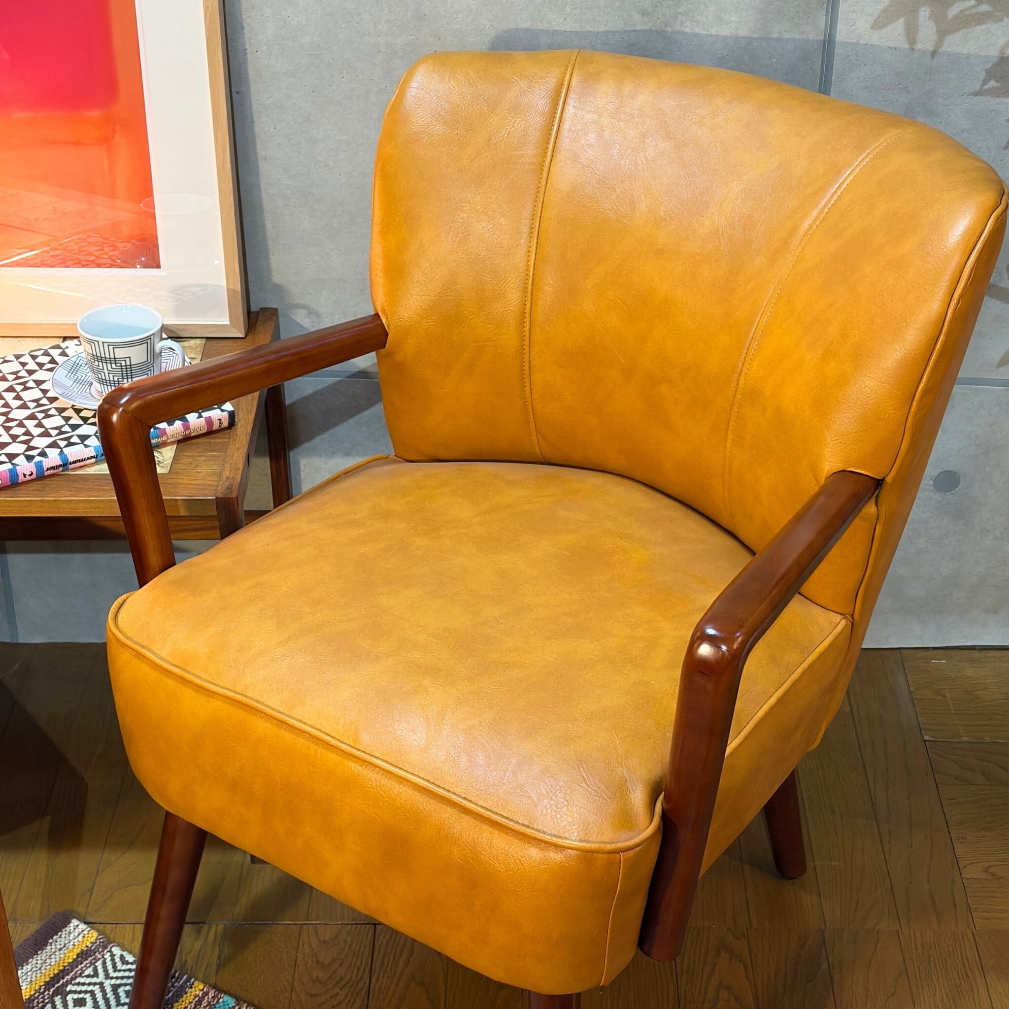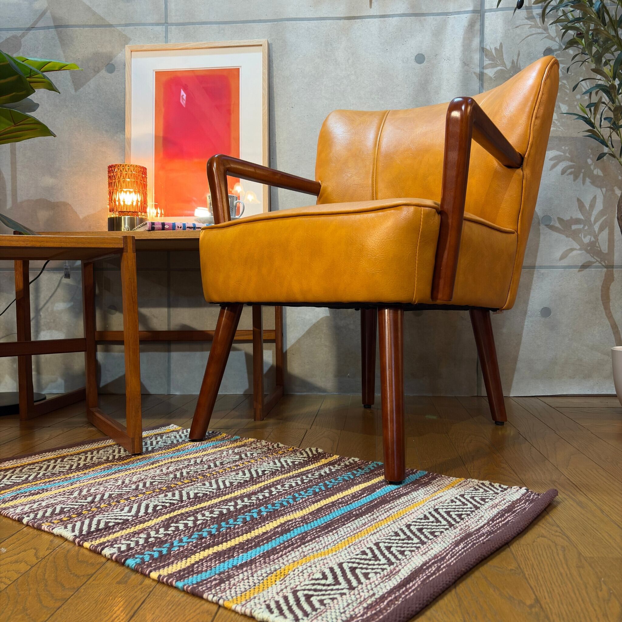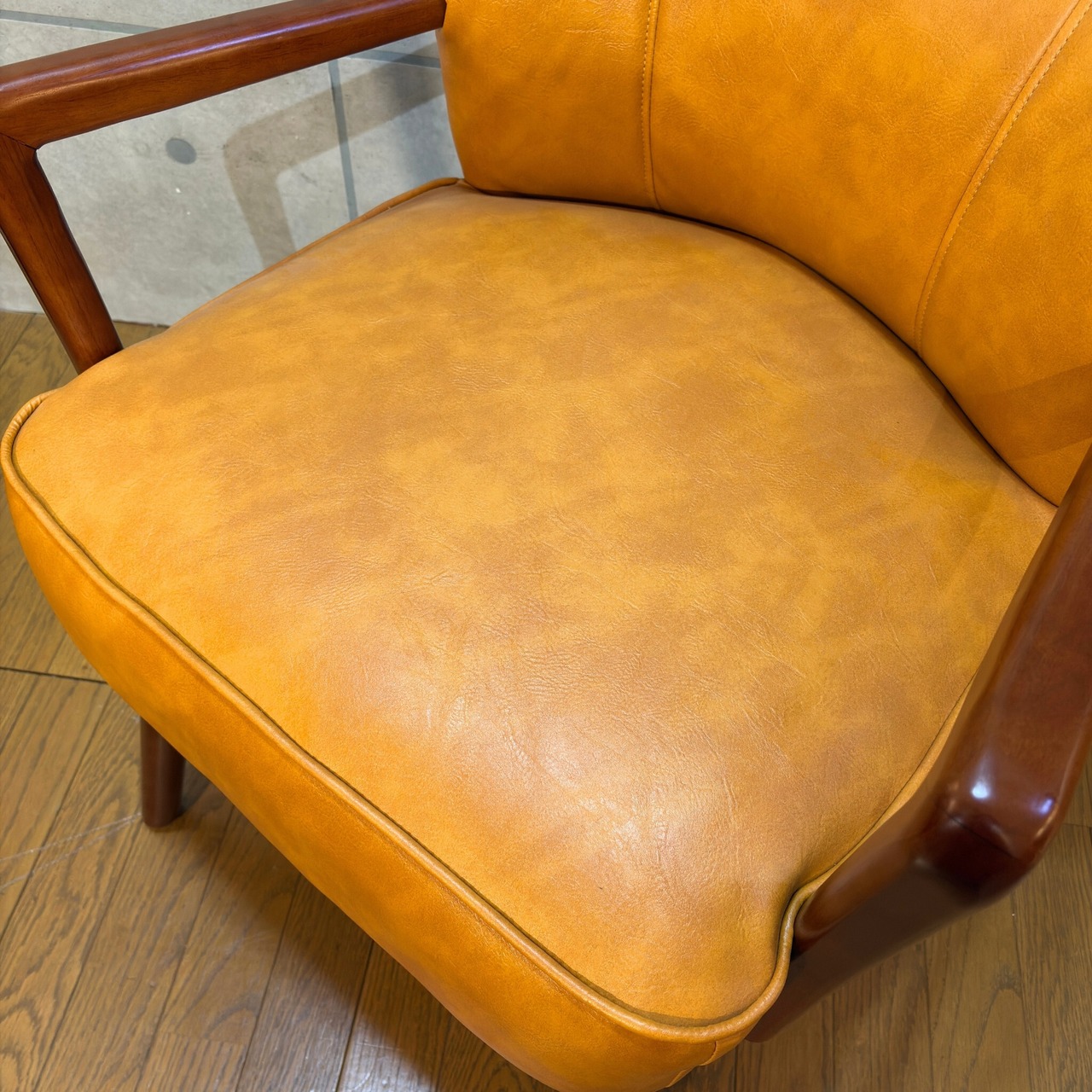 ミッドセンチュリーデザインの美しいフォルムを再現したアームチェアです。キャメルオレンジの張地と流れるような曲線の木製アーム、斜めに伸びたテーパードレッグが空間にアクセントとレトロな雰囲気をもたらします。