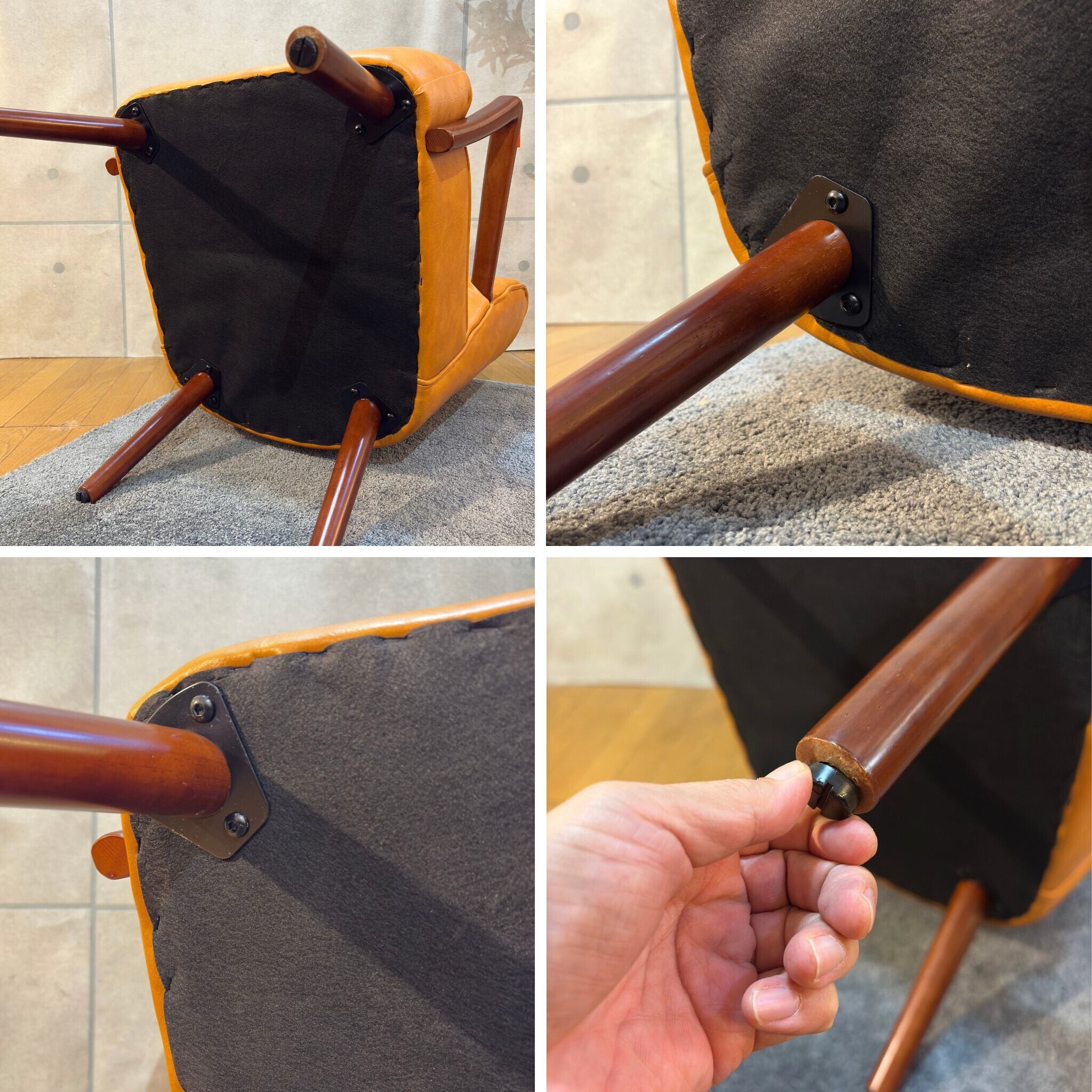 脚部には硬質なラバーウッド材を使用し安定した座り心地です。脚先にはガタつきを防ぐアジャスターが付いています。