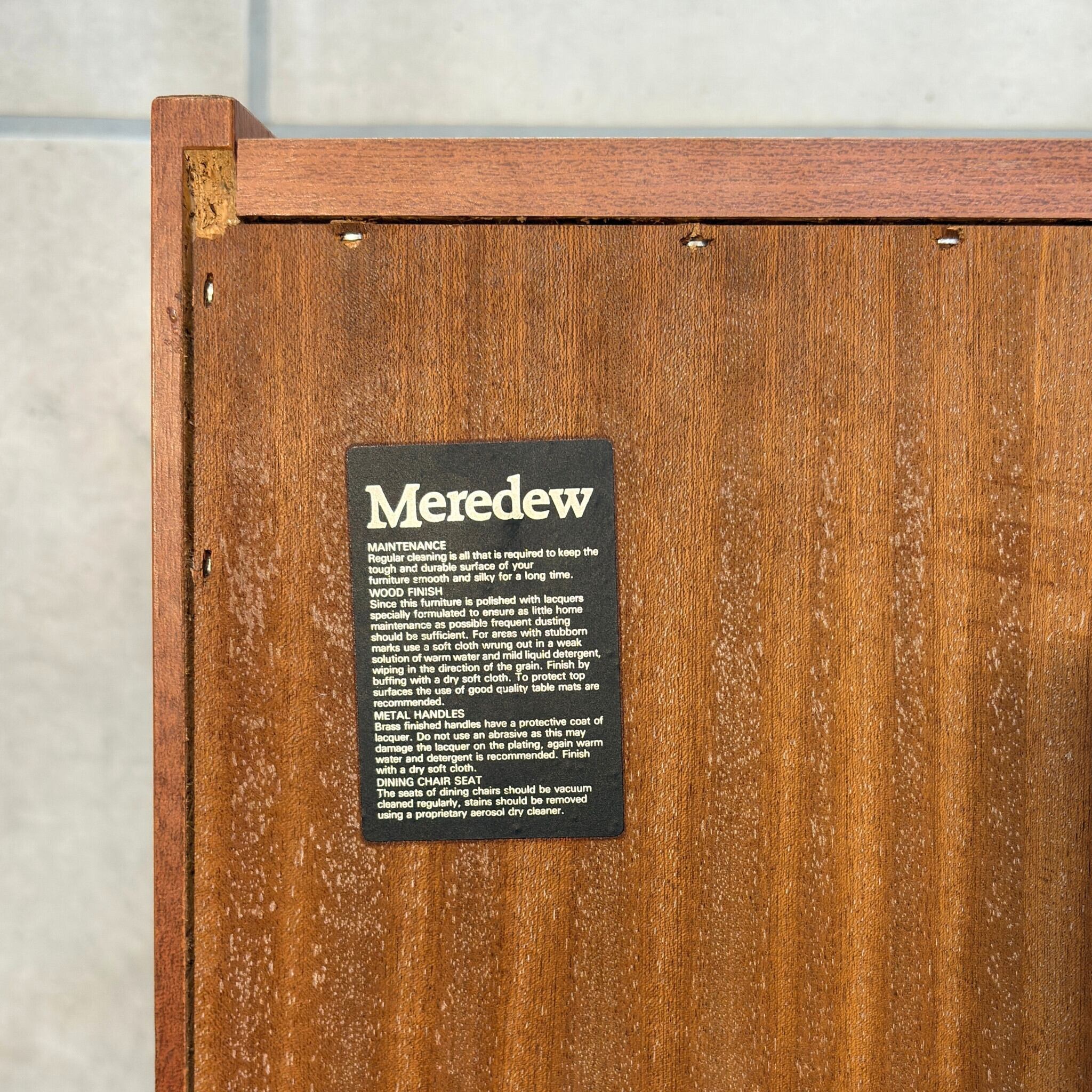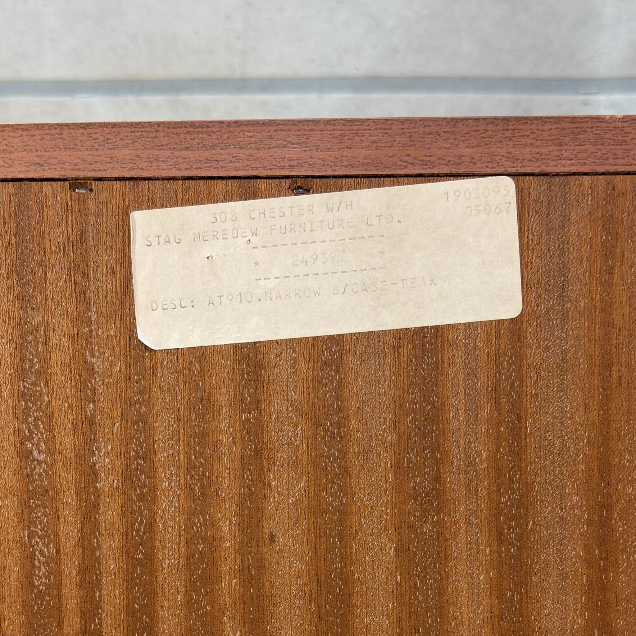 1970年代後半と思われます。裏面には STAG MEREDEW FURNITURE LTD. と印字されたシールが残っていて、これはMeredew社が1978年に老舗メーカー Stag Furnitureの傘下に入った後に使用された社名です。