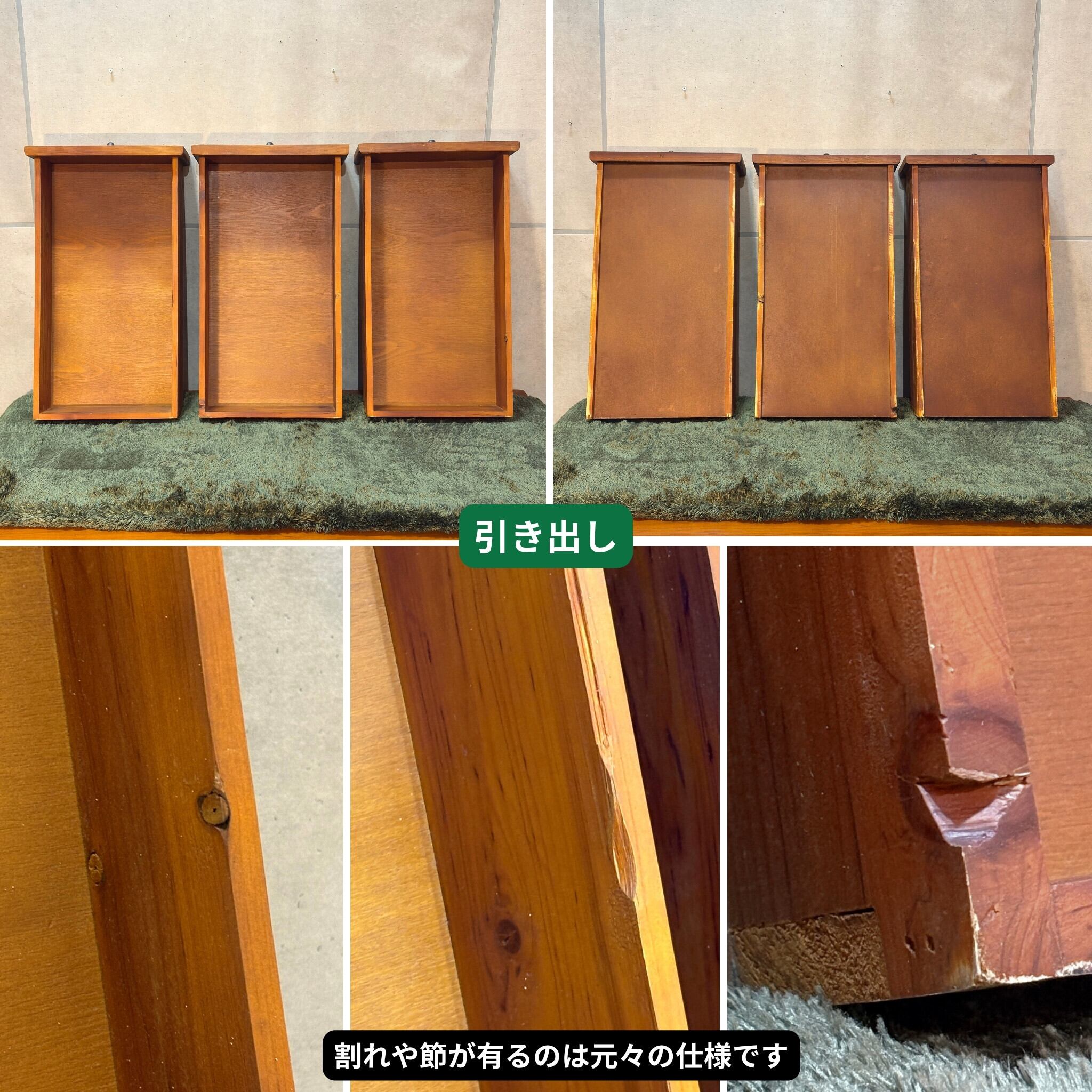 長年にわたり使用・保管されてきた中古品には、素材(木材、塗料、接着剤など)や、過去の設置環境、保管状況に由来する特有の臭い(古木の香り、カビやタバコのような匂いなど)が残っている場合がございます。