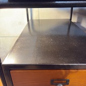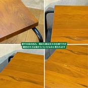 天板は使用に伴うキズが多くありましたが天然木製であることを活かし、表面を軽くサンディングした上でワックスによるメンテナンスを施し自然な仕上がりすることでキズを目立たなくしました。節や木目の凹凸、埋めた跡はラフなインダストリアル感を出す為のもので元々の仕様です。