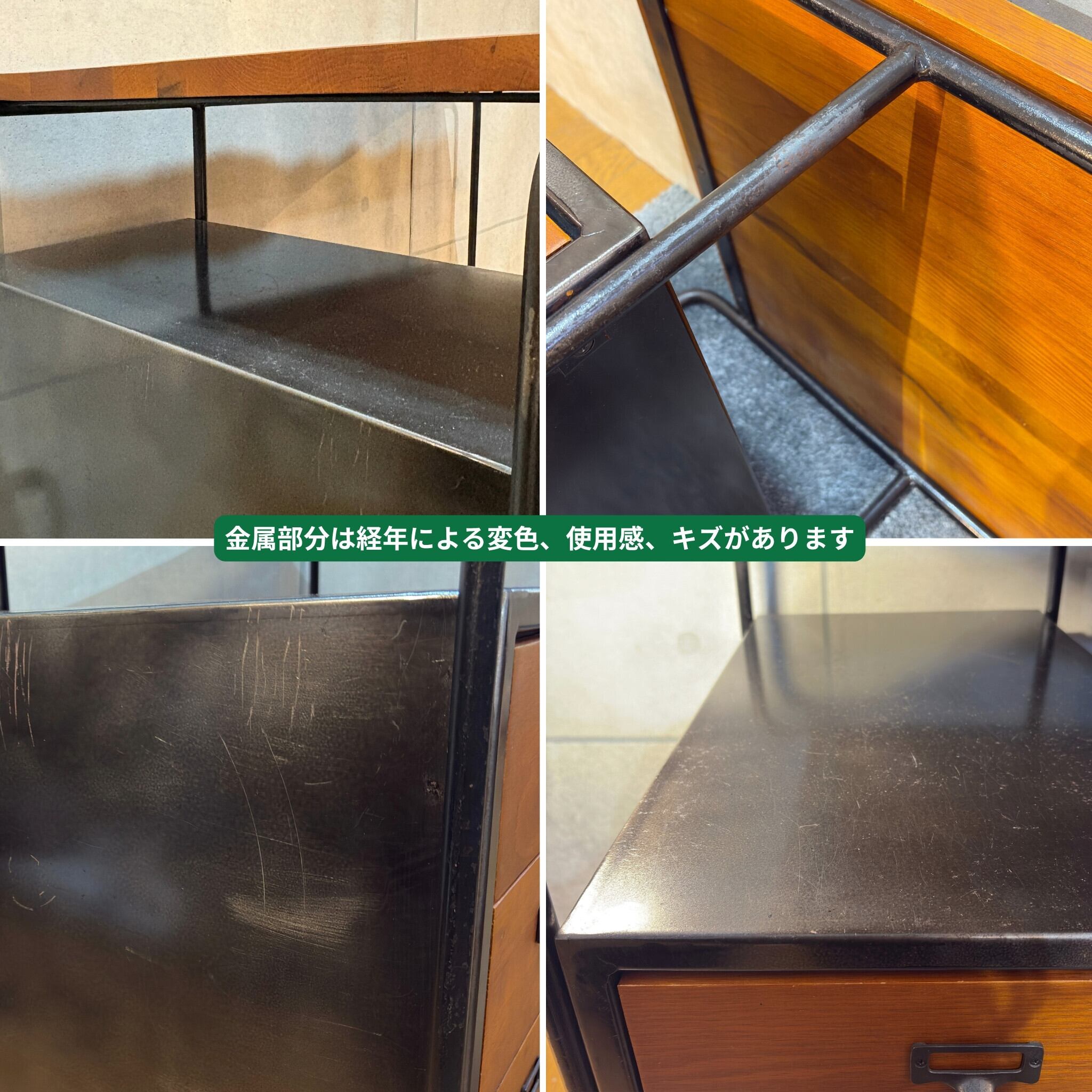 金属部分には使用による擦り傷や剥がれがありますが、こちらに関しましてはそのままにしています。経年によるキズも「味」として楽しめるヴィンテージライクな仕上げとしてお楽しみください。