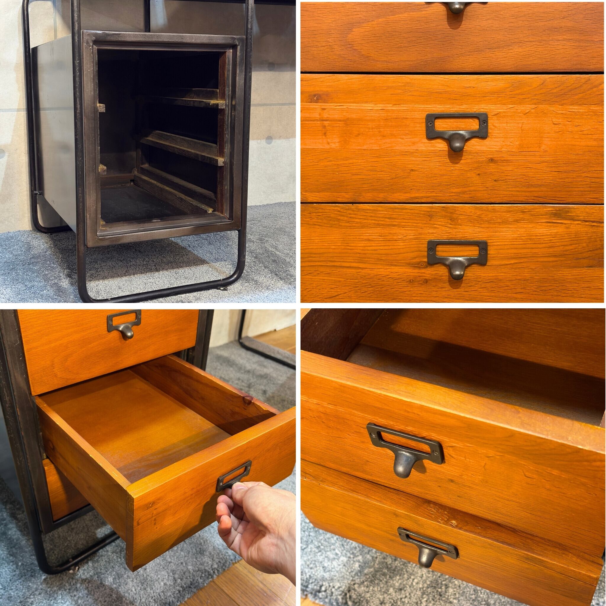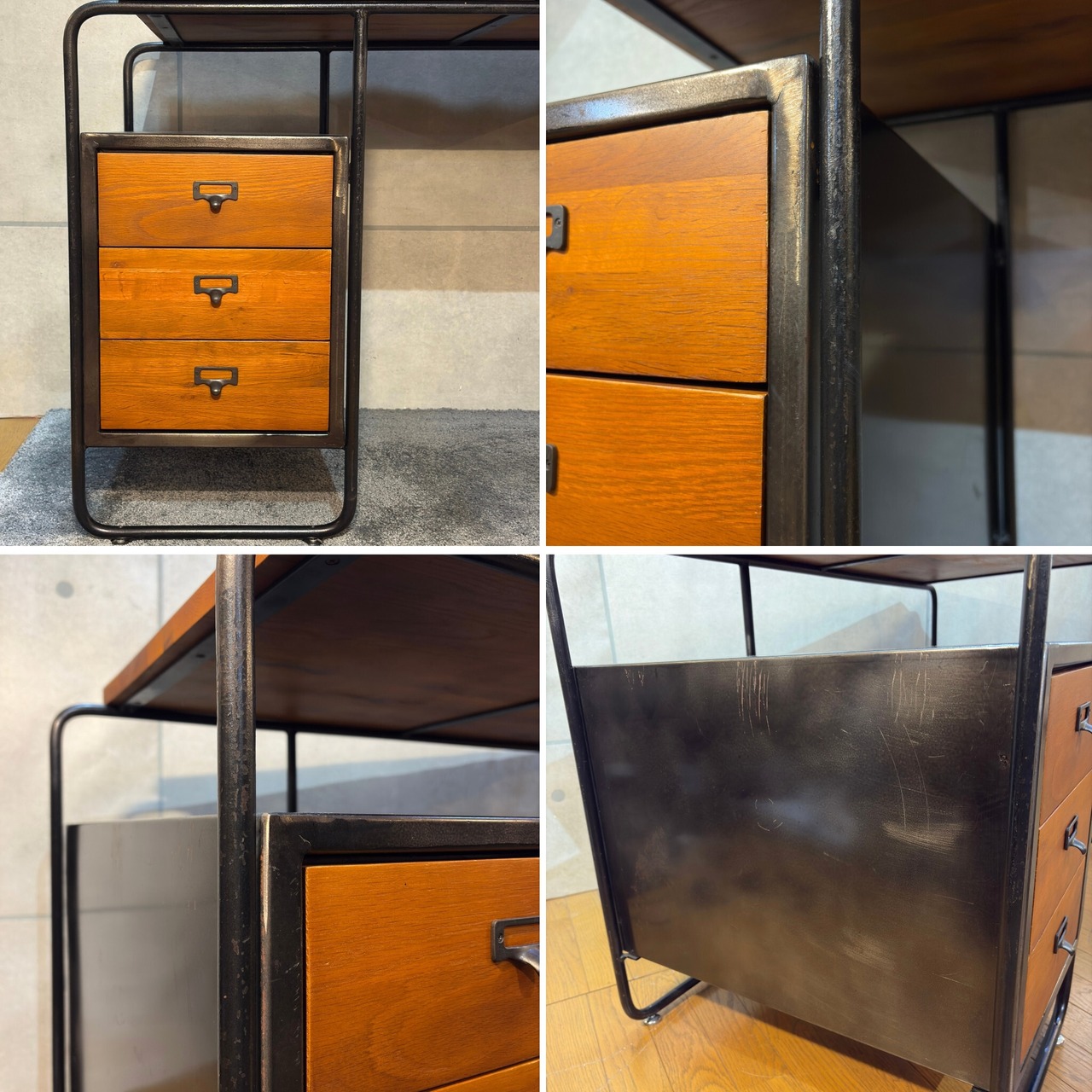 金属部分は非常に重厚感のある良質なアイアンを使用。天板や引き出しと合わせて約30kgの重量があり、メタル風に仕上げた素材とは全く異なる本物のインダストリアルな雰囲気を感じることができます。