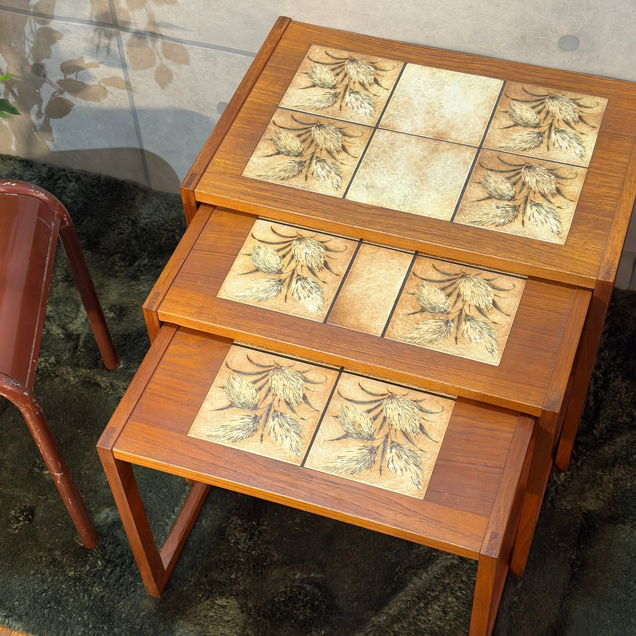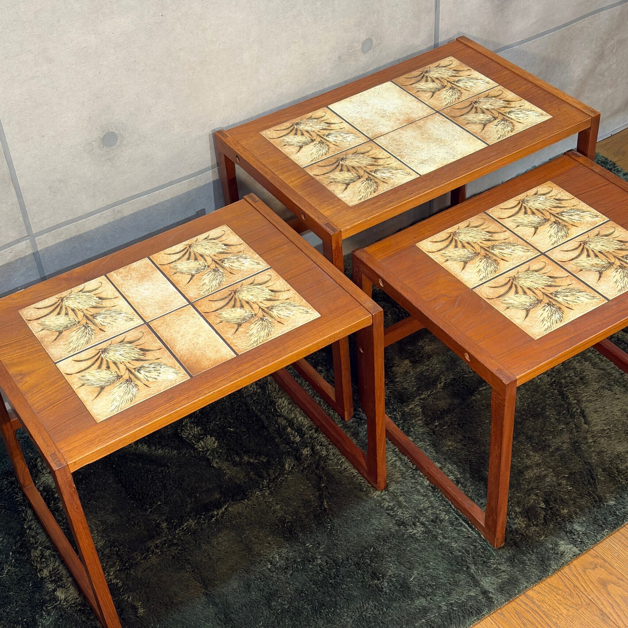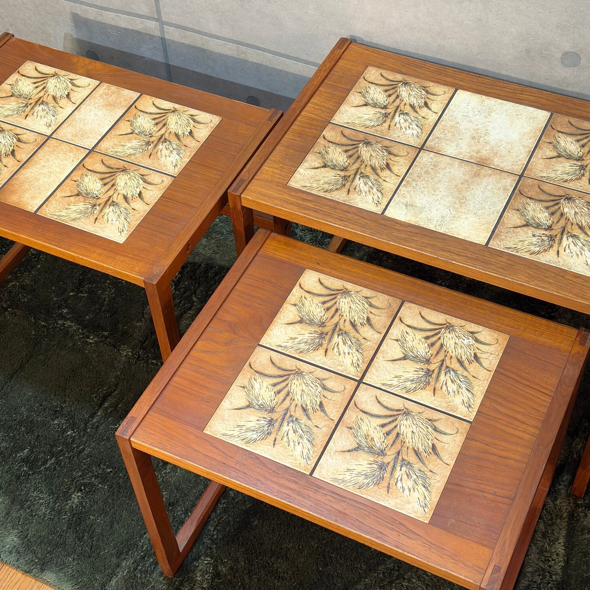 チーク材の美しい木目と絵画のように優雅な絵柄のタイル天板が魅力的なデンマーク製ヴィンテージのネストテーブルセット(3台組)です。1960年代中頃〜1970年代に流行したタイルトップデザインは北欧デザインの機能性に温かい装飾性を加えた傑作です。