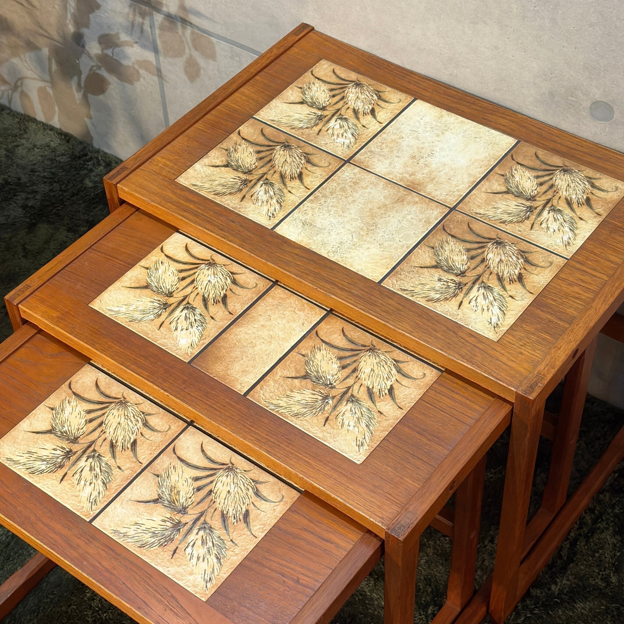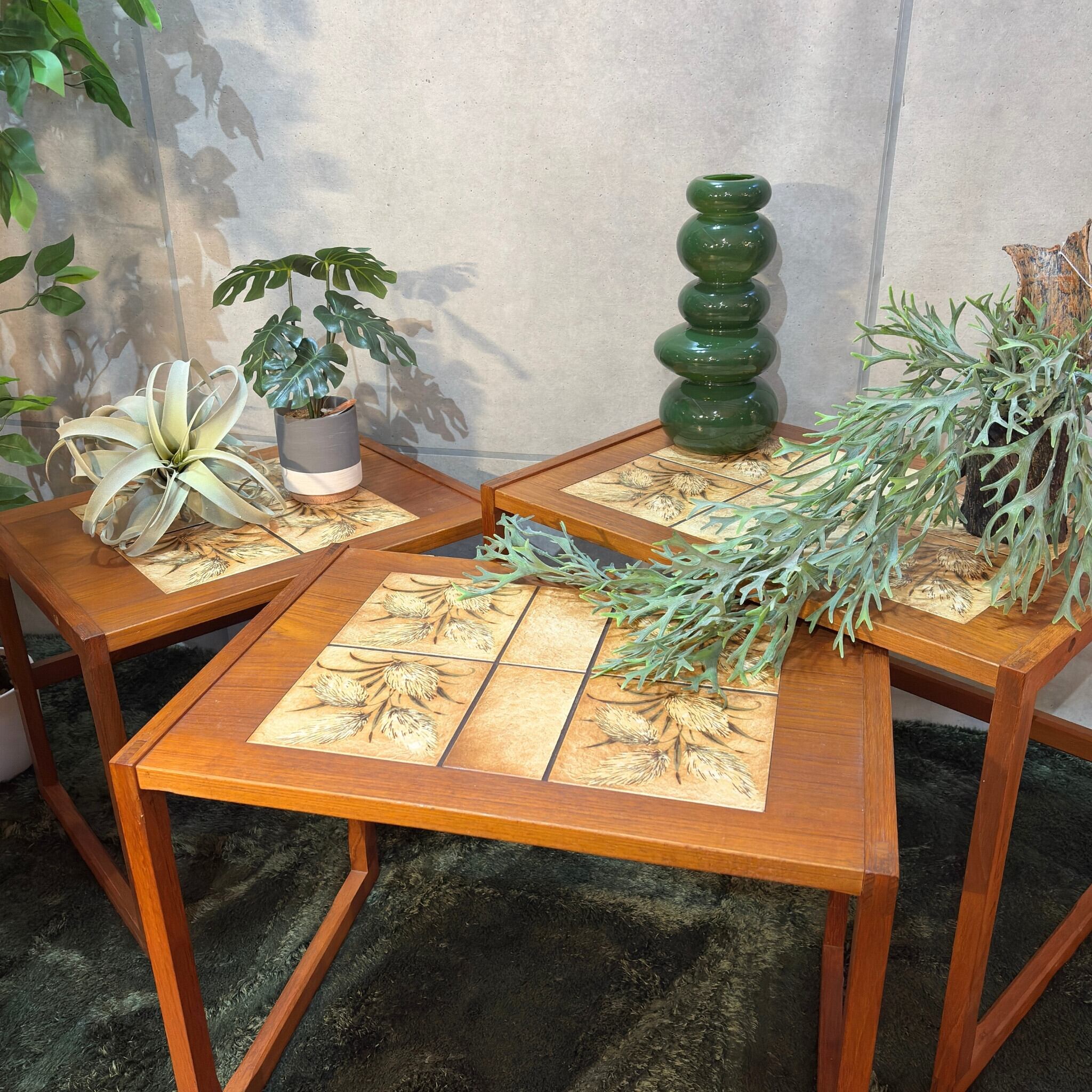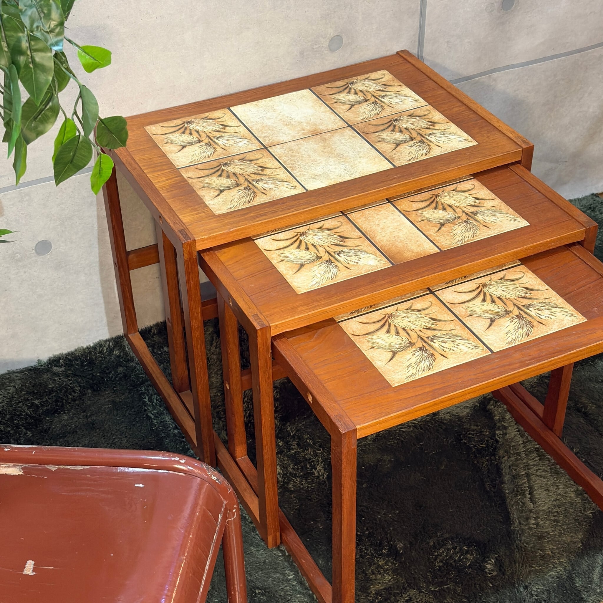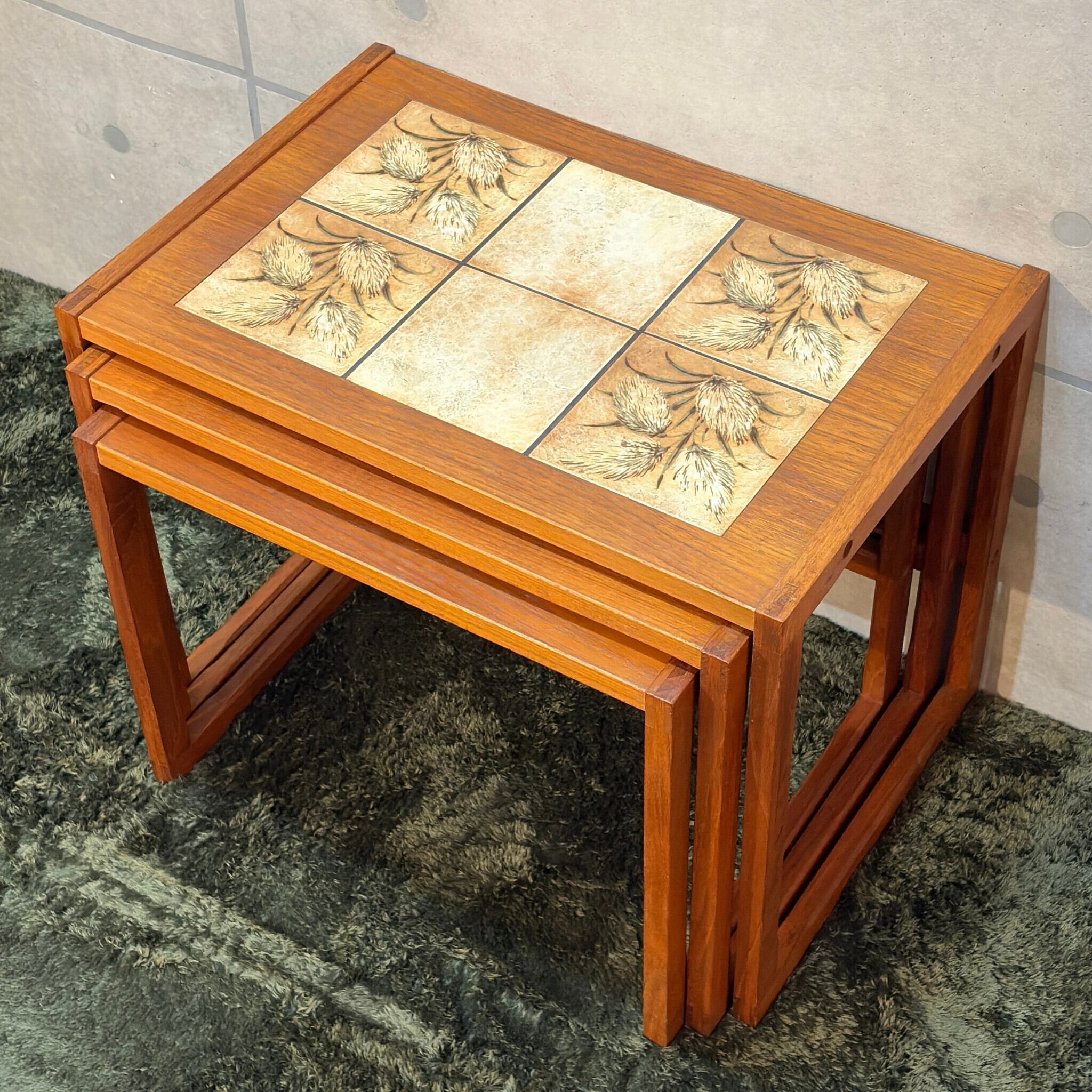 チーク材の美しい木目と絵画のように優雅な絵柄のタイル天板が魅力的なデンマーク製ヴィンテージのネストテーブルセット(3台組)です。1960年代中頃〜1970年代に流行したタイルトップデザインは北欧デザインの機能性に温かい装飾性を加えた傑作です。