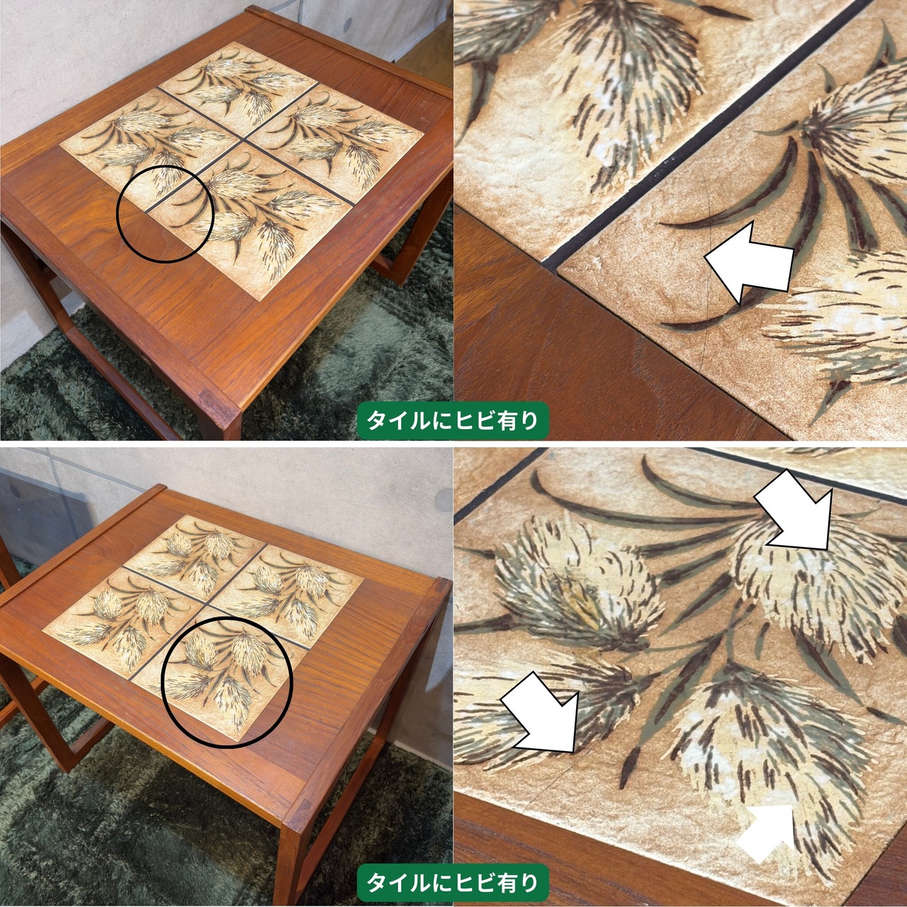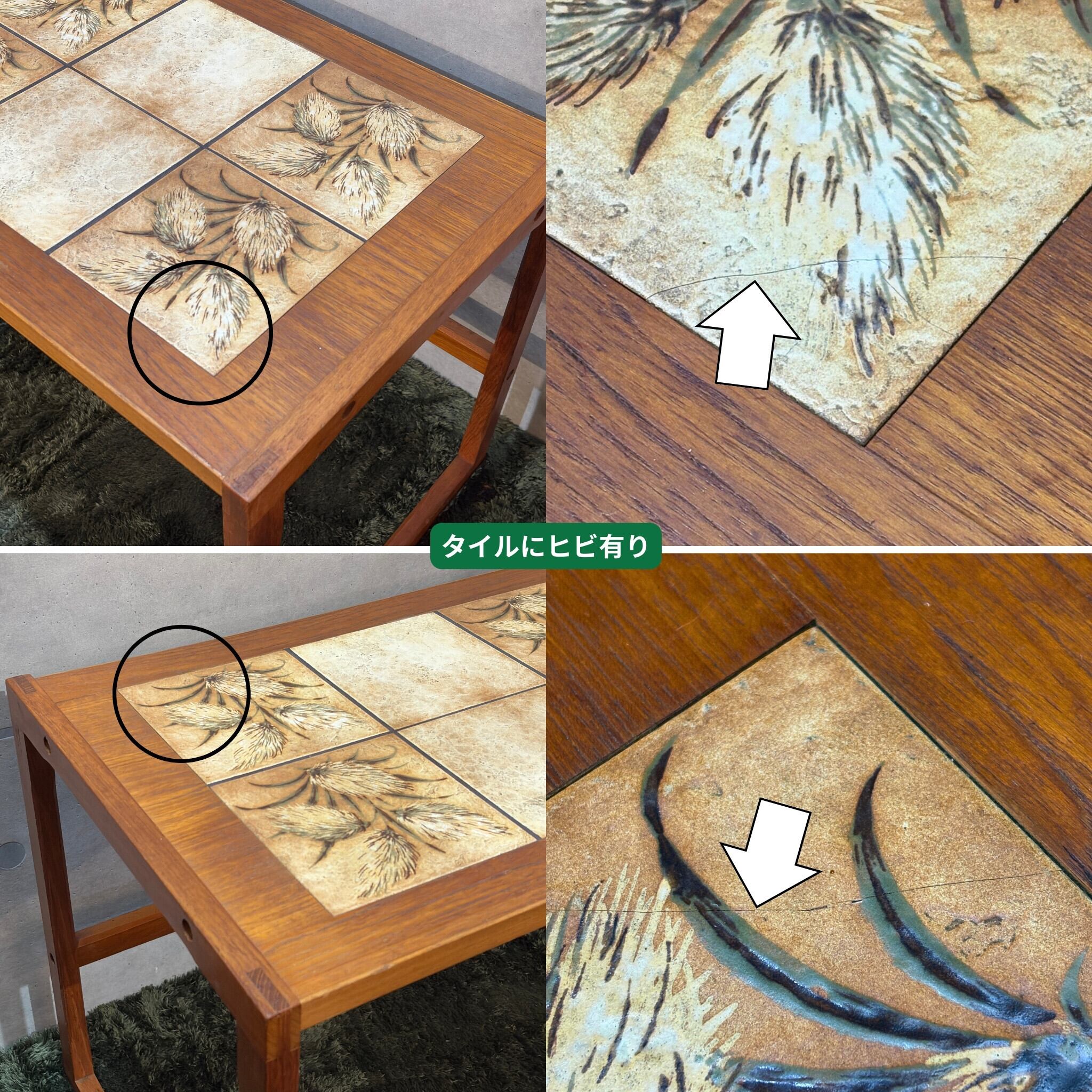 タイルの一部に細かなヒビが見られます。これはタイルトップテーブル特有の経年変化であり、タイルの脱落や機能上の問題はありません。ヴィンテージの風合いとしてご理解ください。