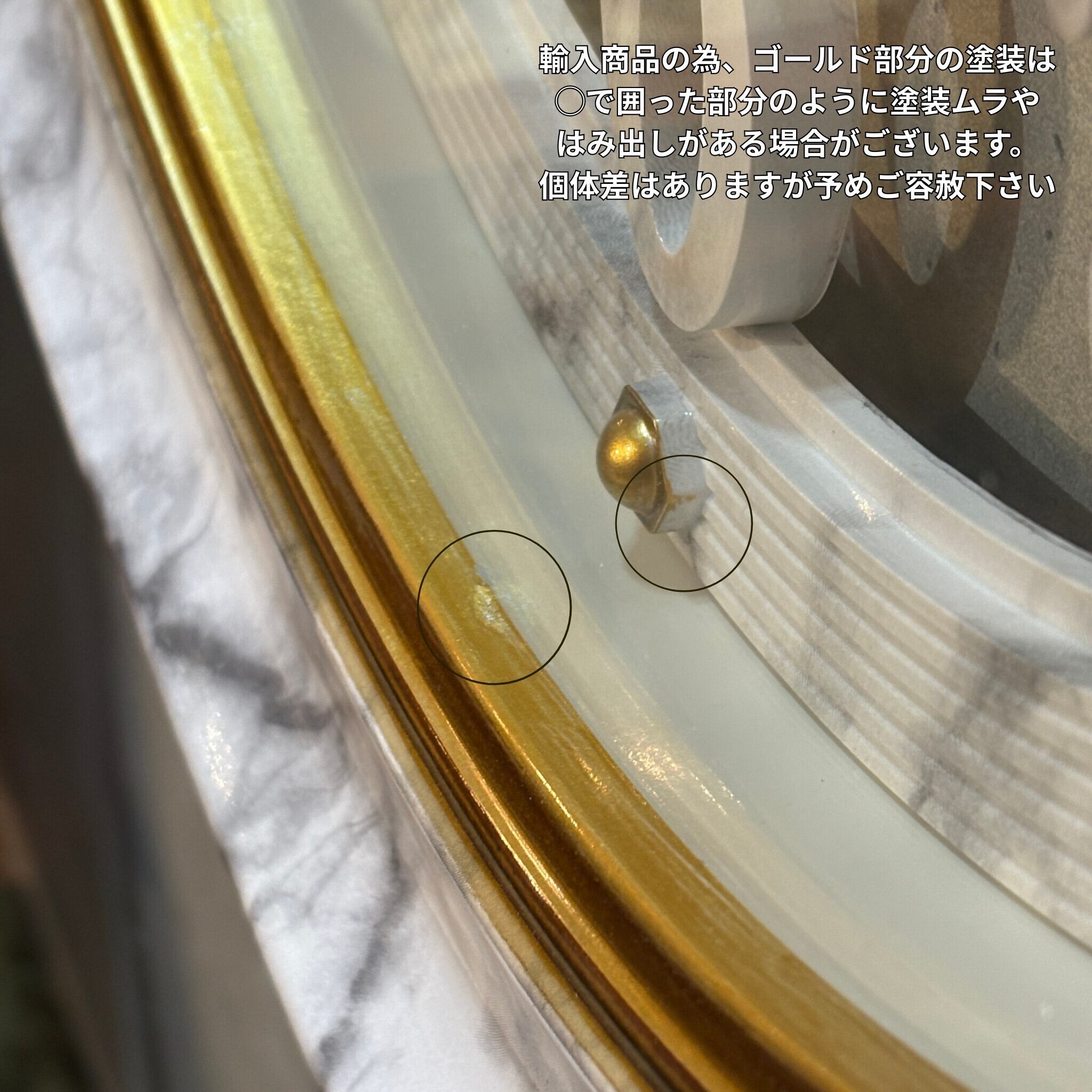 輸入商品の特性上、ゴールド部分の塗装に塗装ムラやはみ出しが見られる場合がございます。個体差はありますが遠目からは目立たない部分となります。商品の特性として予めご理解下さい。