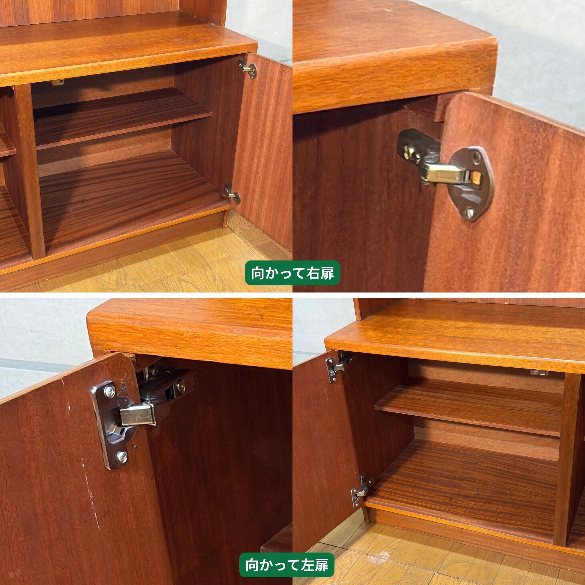 板扉には左右で異なる丁番と、受けのマグネットキャッチが取り付けられています。こちらに関してはどちらも違和感なくお使いいただけます。