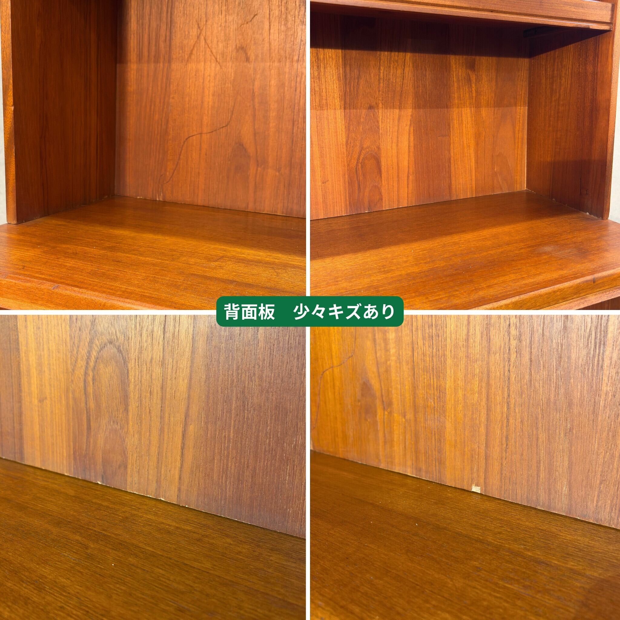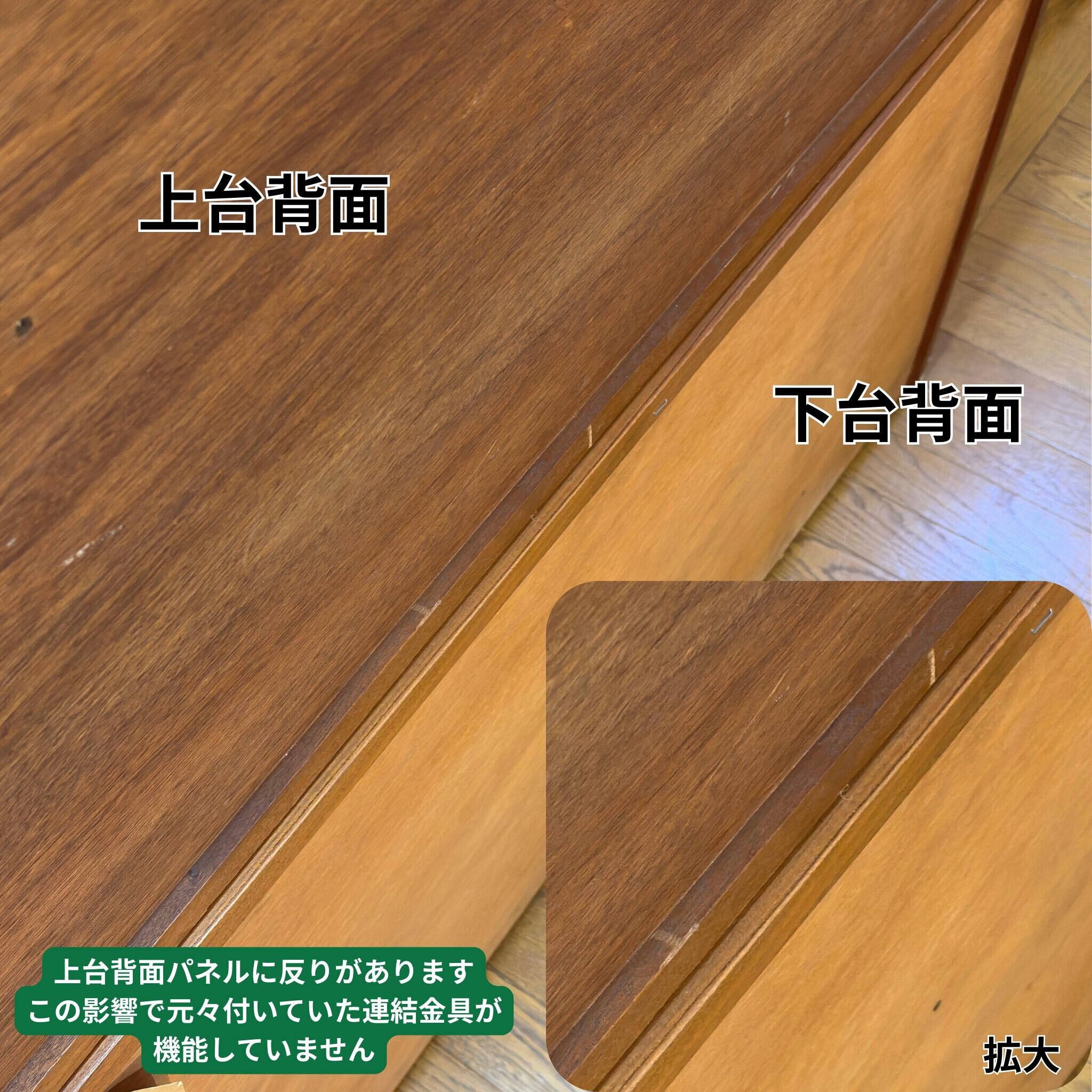 上台の背面パネルに反りがあります。この影響で元々付いていた連結金具は正常に機能していません。安全にお使いいただけるよう、当店にてより確実に連結できる金具を別途ご用意いたします。入荷後に画像を追加いたしますので少々お待ち下さい。