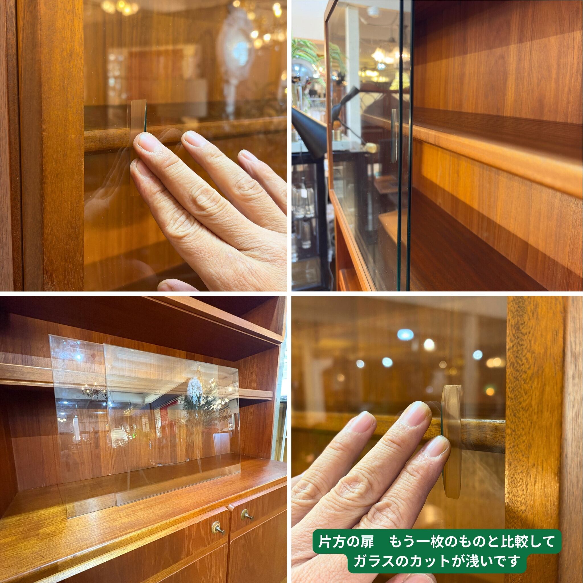 ガラスは一枚を交換、扉は破損箇所を交換したものと思われます。修理しながら大事に使用されていた事が伝わってきます。
