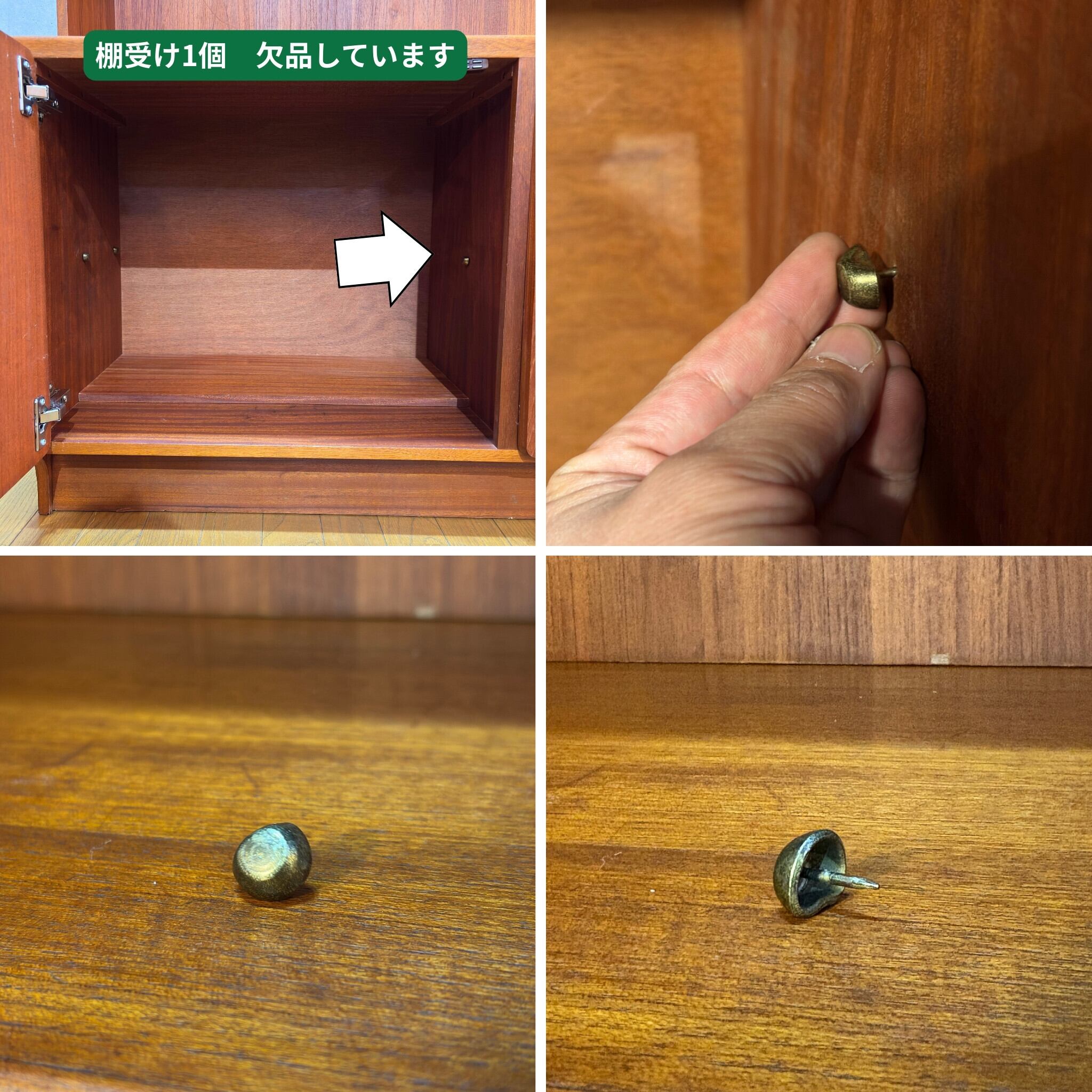 下部扉内の棚受け(棚ダボ)が1個欠品しております事から、棚板一枚に関しては正常にご使用いただけない状態です。先が釘になっていて側板に直接打ち込むという昔ながらの仕様となっておりますので、代用品を探す場合は「打ち込み式 棚ダボ」といった単語で検索をいただけますと一般的に市販されております。