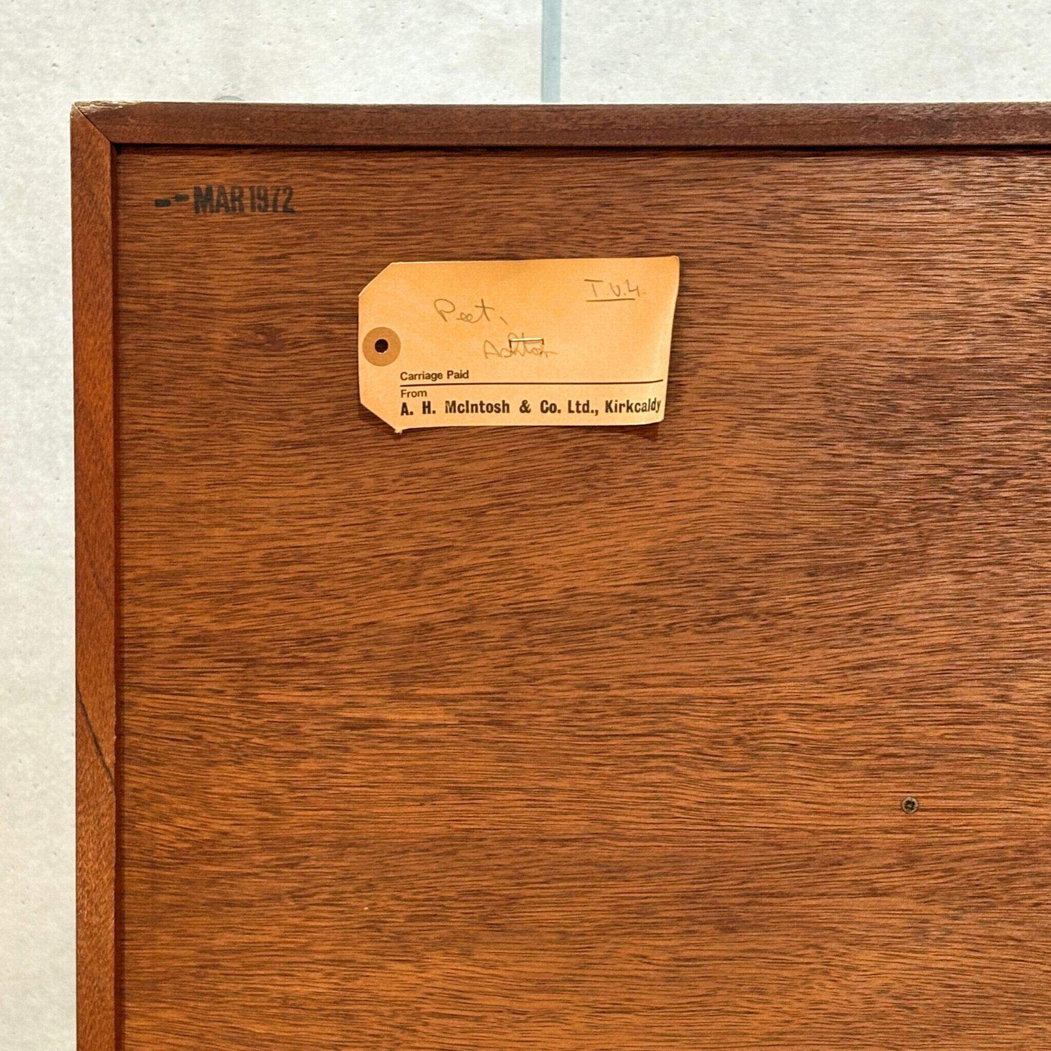 A.H. McIntosh(A.H. マッキントッシュ)は1869年にスコットランドで創業された老舗家具メーカーです。1960年代にはデザイナーのトム・ロバートソン(Tom Robertson)らと共にデンマークデザインの影響を強く受けた、流れるような美しい曲線を持つチーク材の家具を数多く発表しG-PLANと並び英国ミッドセンチュリーの黄金期を牽引しました。彼らの家具はその確かな木工技術と高い品質で知られています。