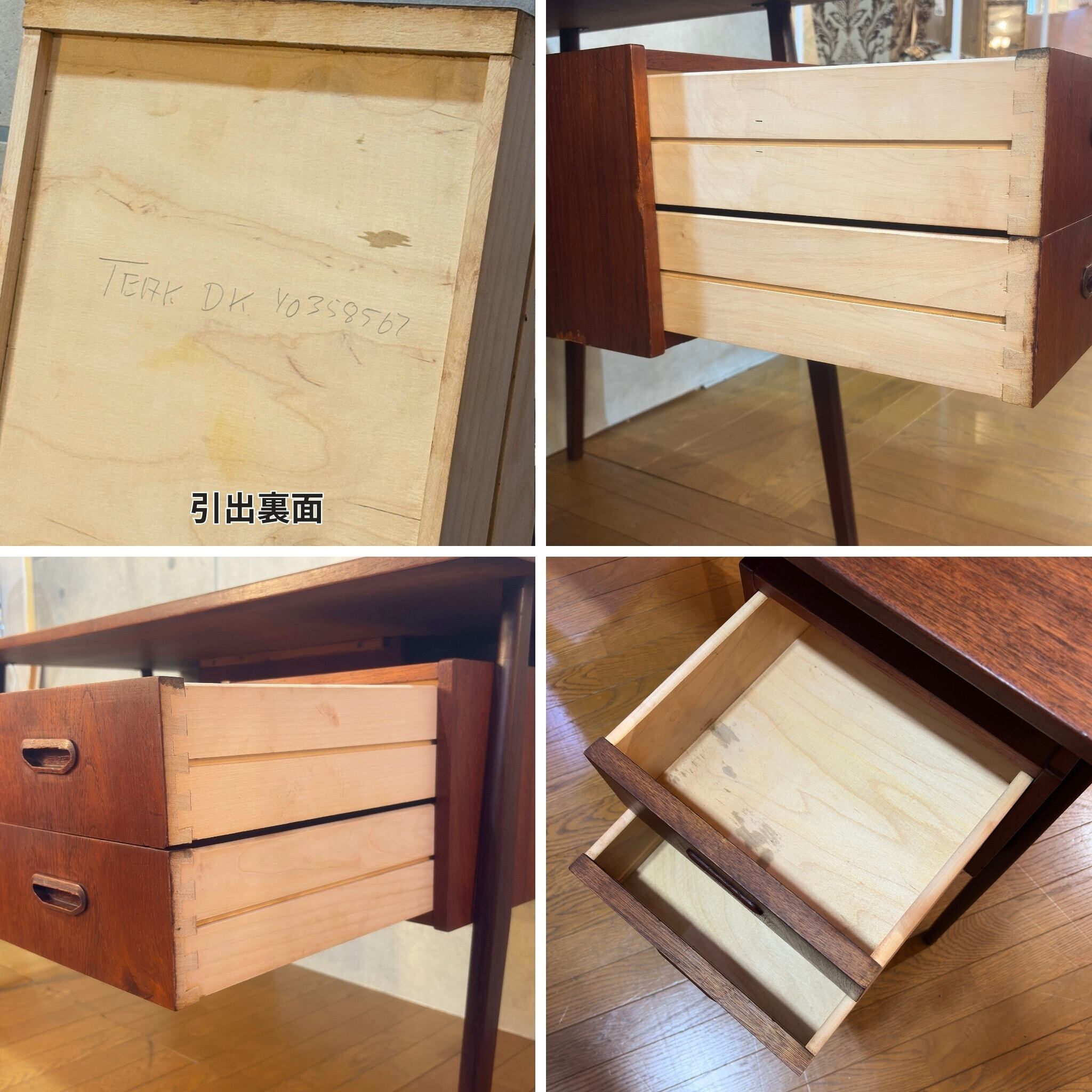 このデスクはその特徴的なディテールを色濃く残す逸品です。引き出しの裏面には当時の輸出用管理番号と思われる「TEAK DK」の手書き文字が残っています。