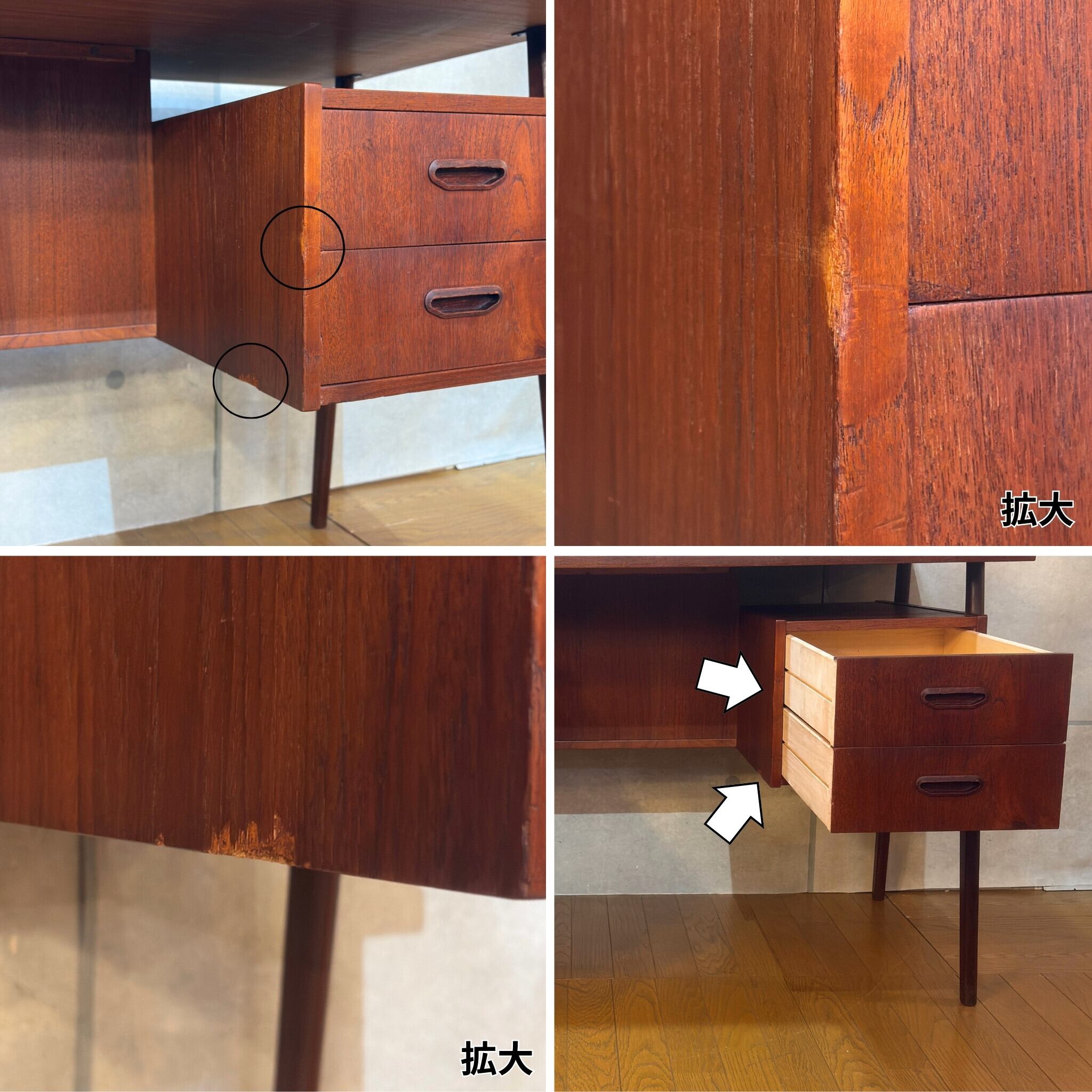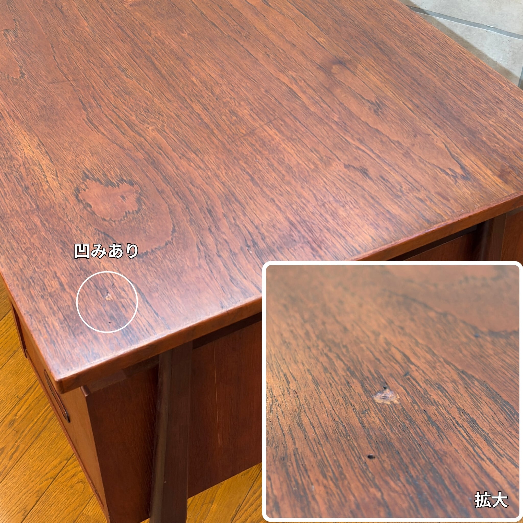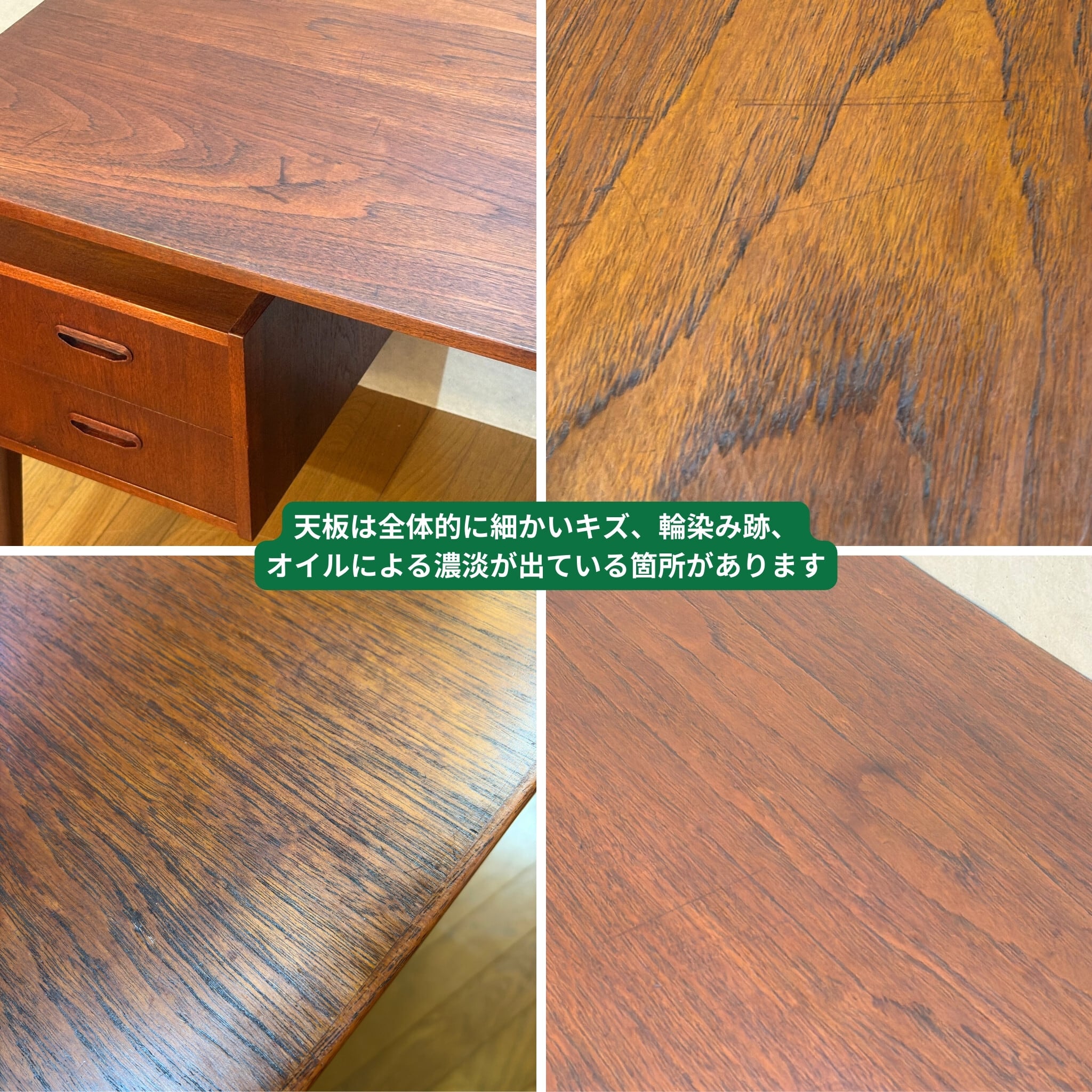 天板に打痕や輪染み跡、細かいキズ、補修跡などがございます。ヴィンテージ特有の味わいとしてご理解いただける方におすすめいたします。