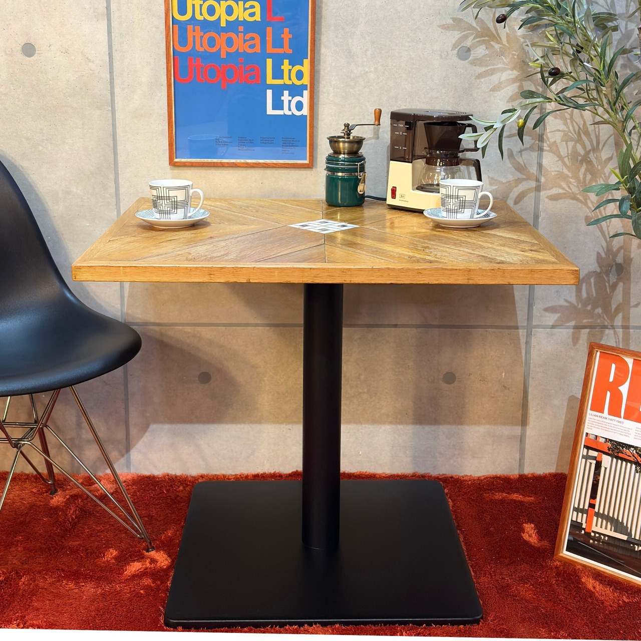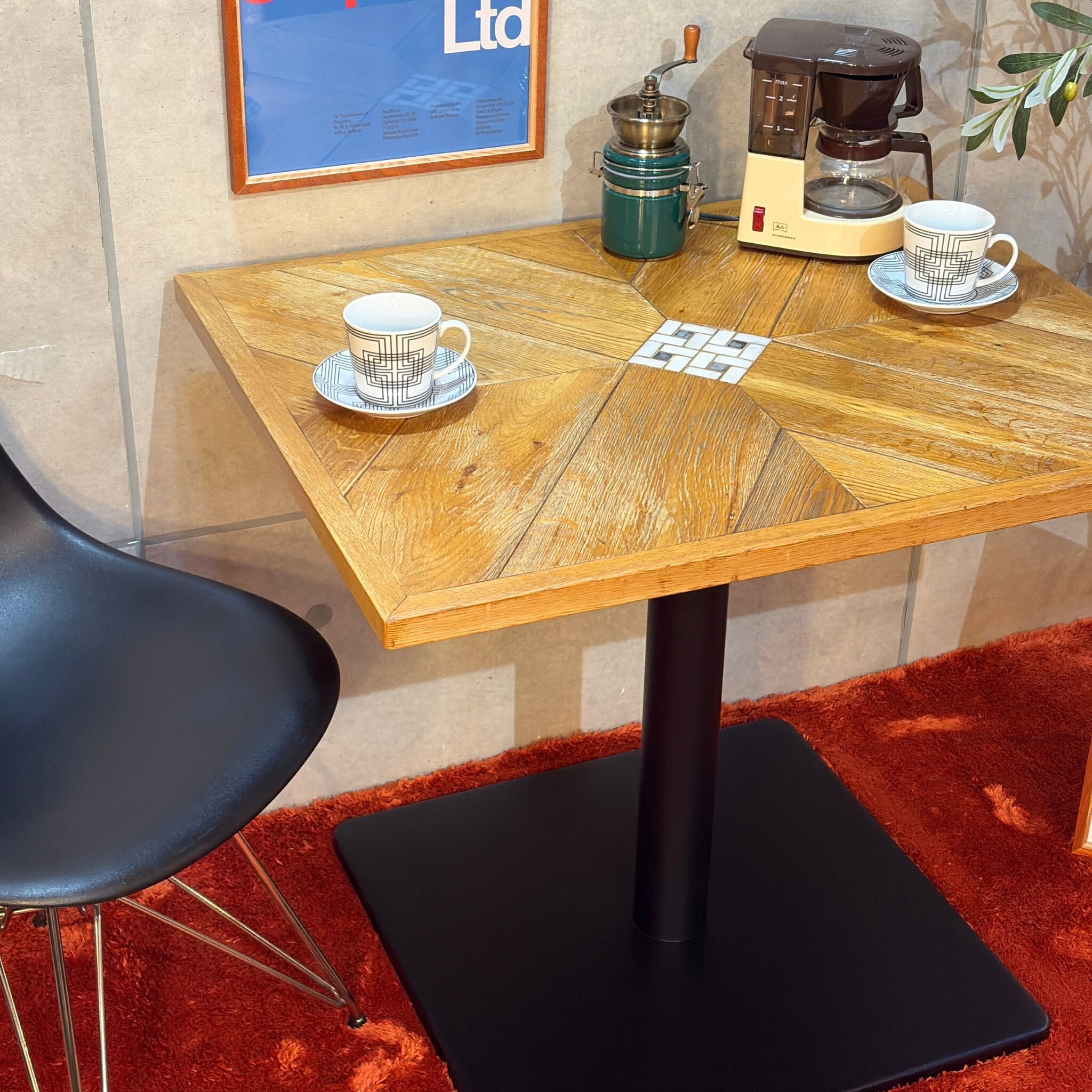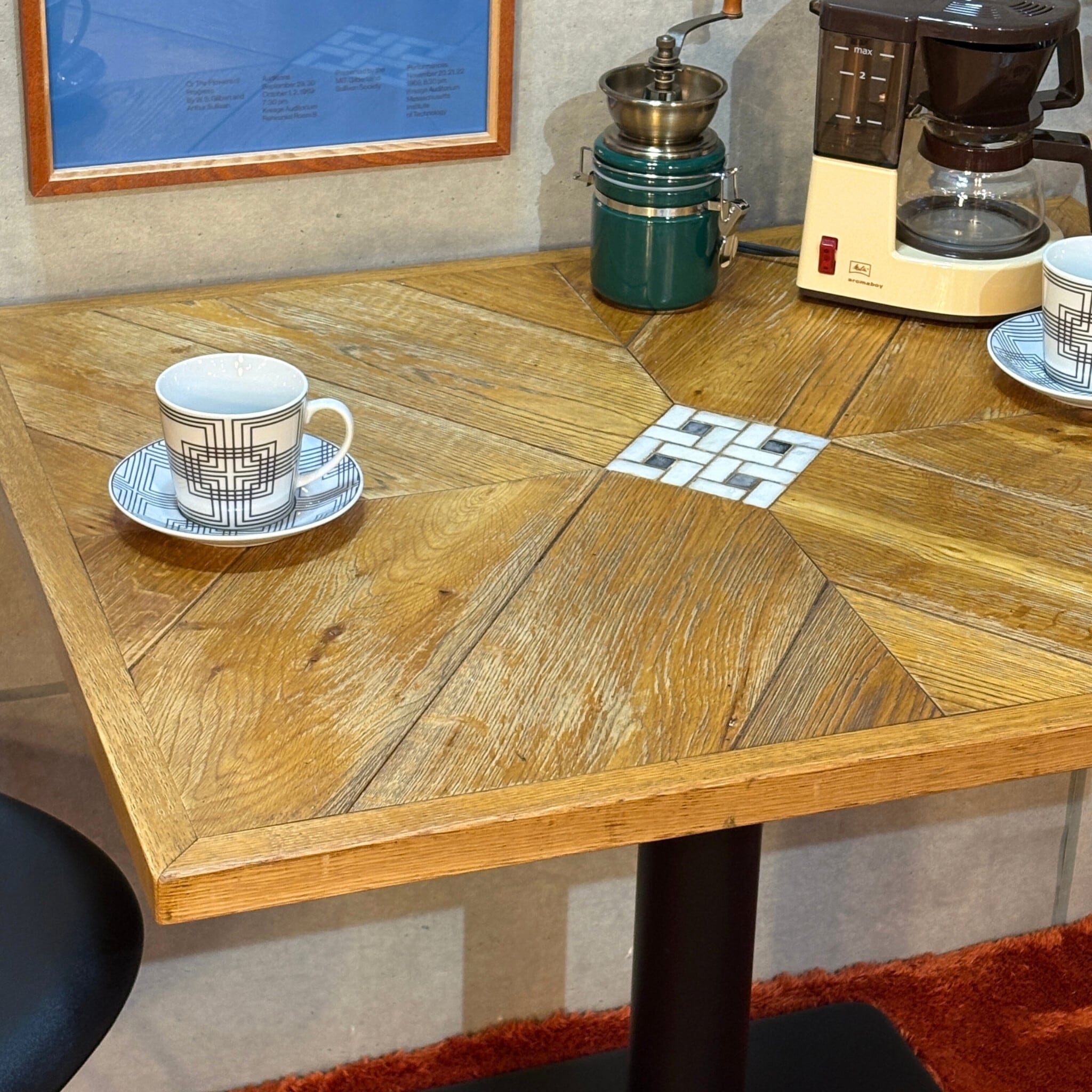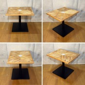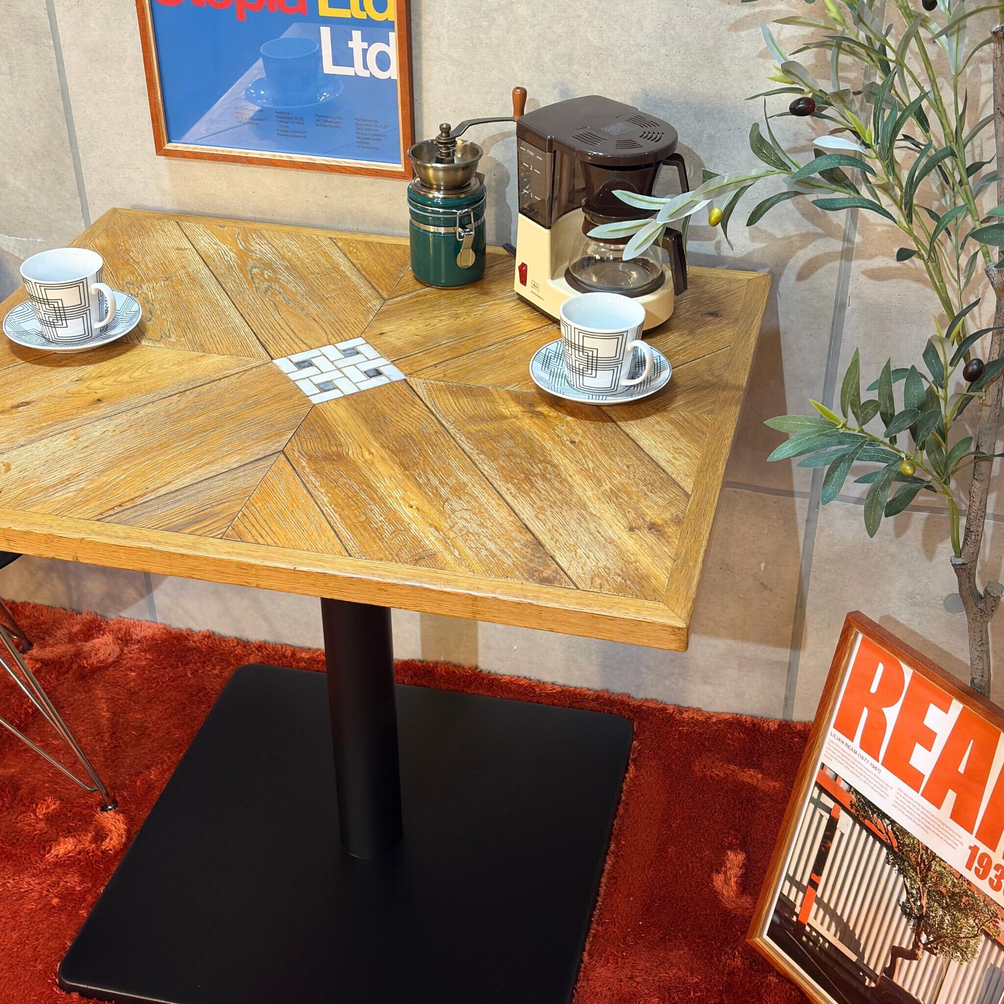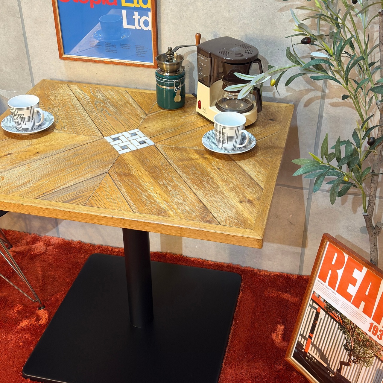 ナラ(オーク)材の表情豊かな木目とレトロなモザイクタイルを組み合わせたカフェテーブルが入荷しました。