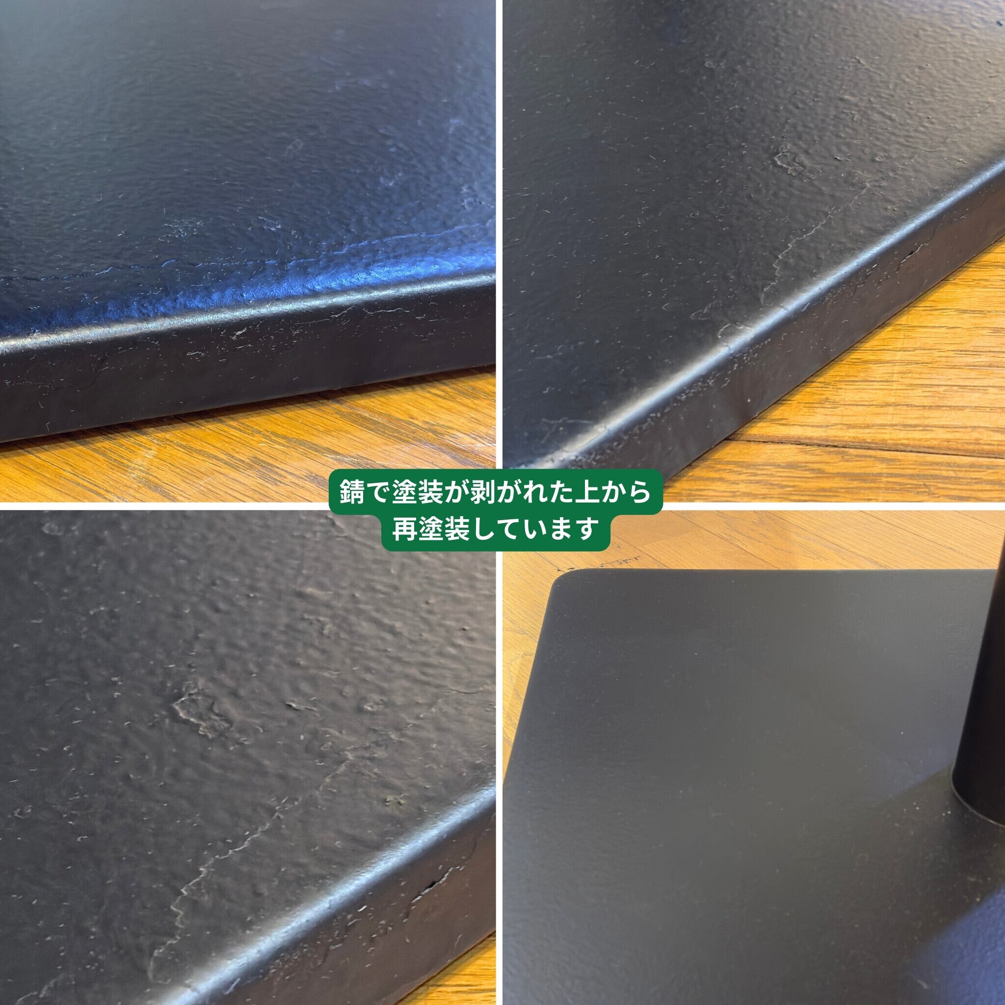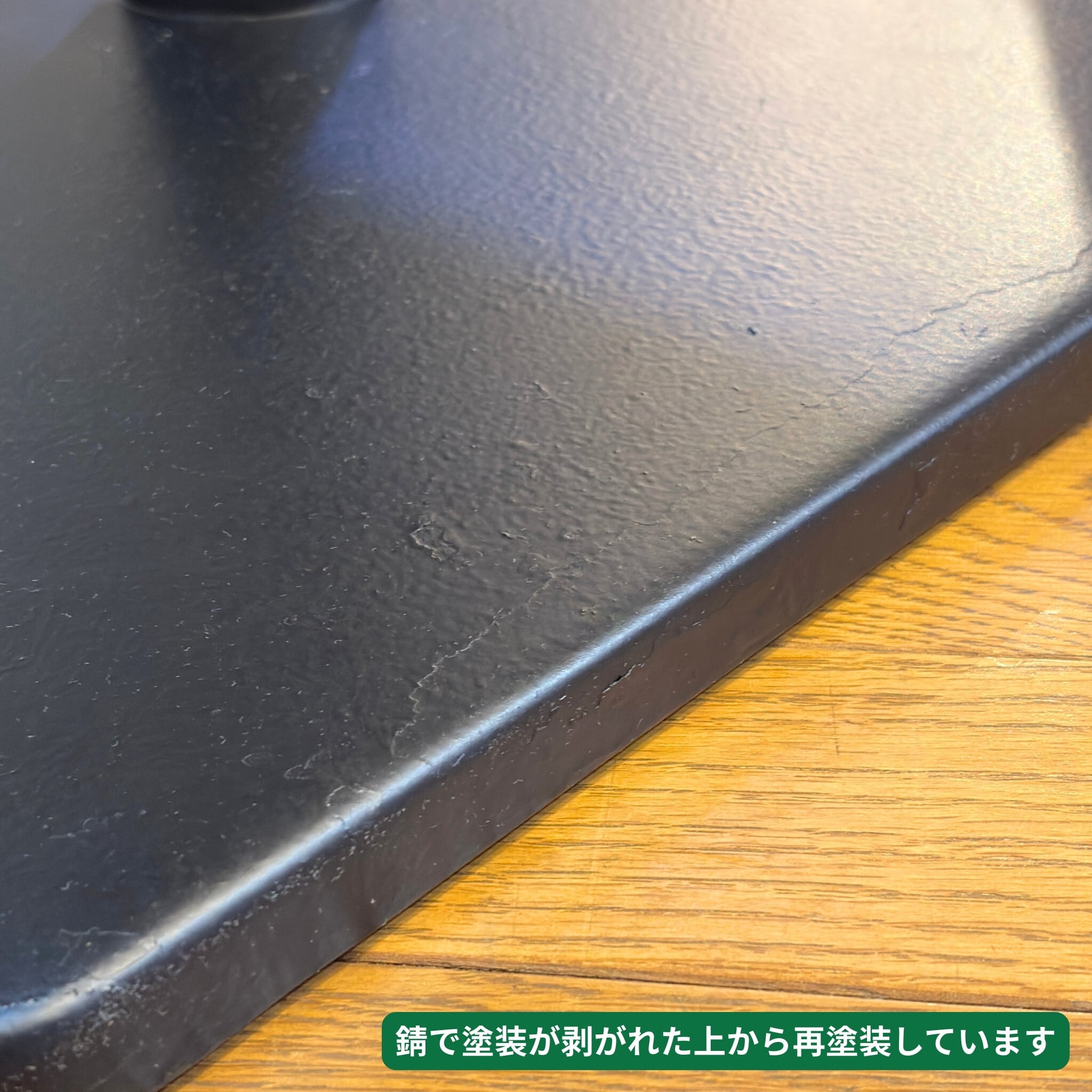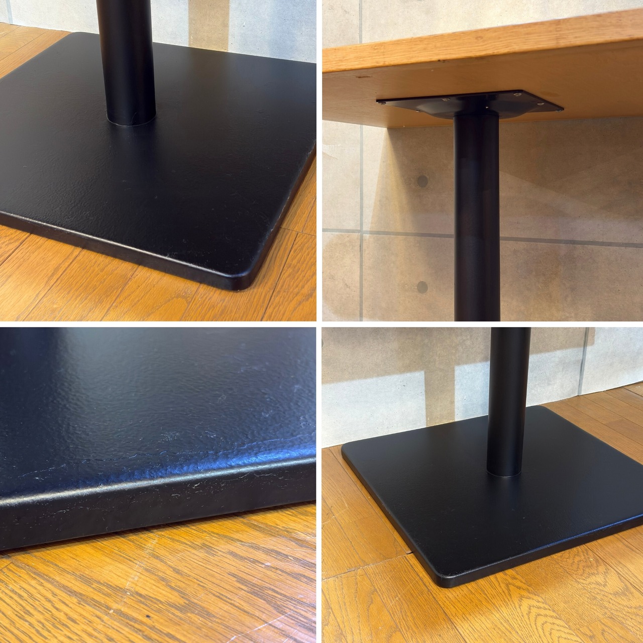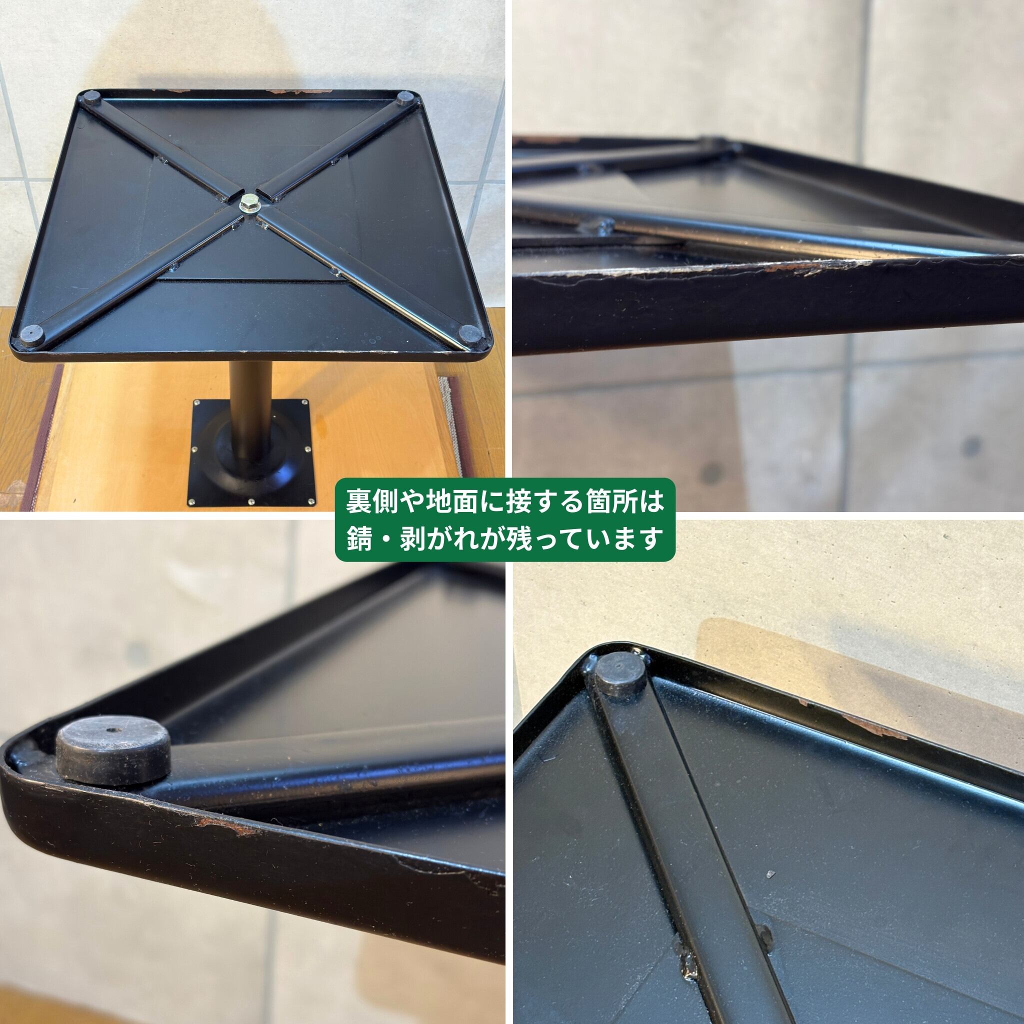 使用に伴う傷、打痕、塗装の経年変化がございます。脚部は過去にサビの上から再塗装された跡が見られますが実用強度は問題ありません。外から見えない裏面や地面に接する部分は錆や剥がれが残っています。気兼ねなくガシガシ使える家具としておすすめいたします。