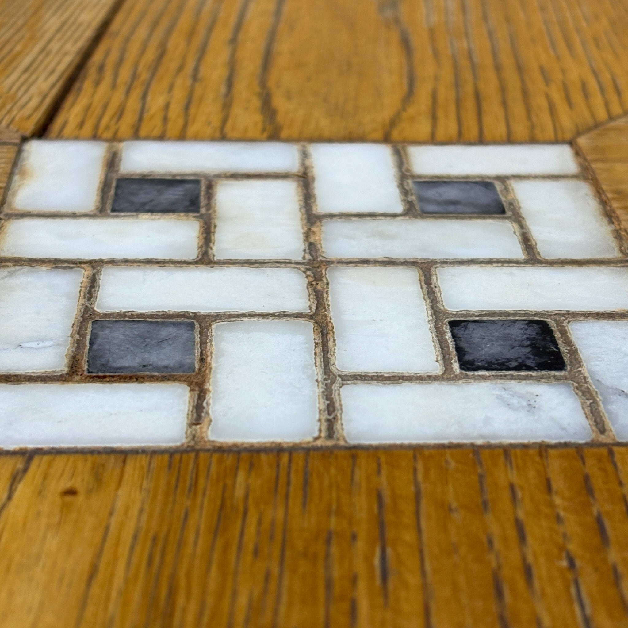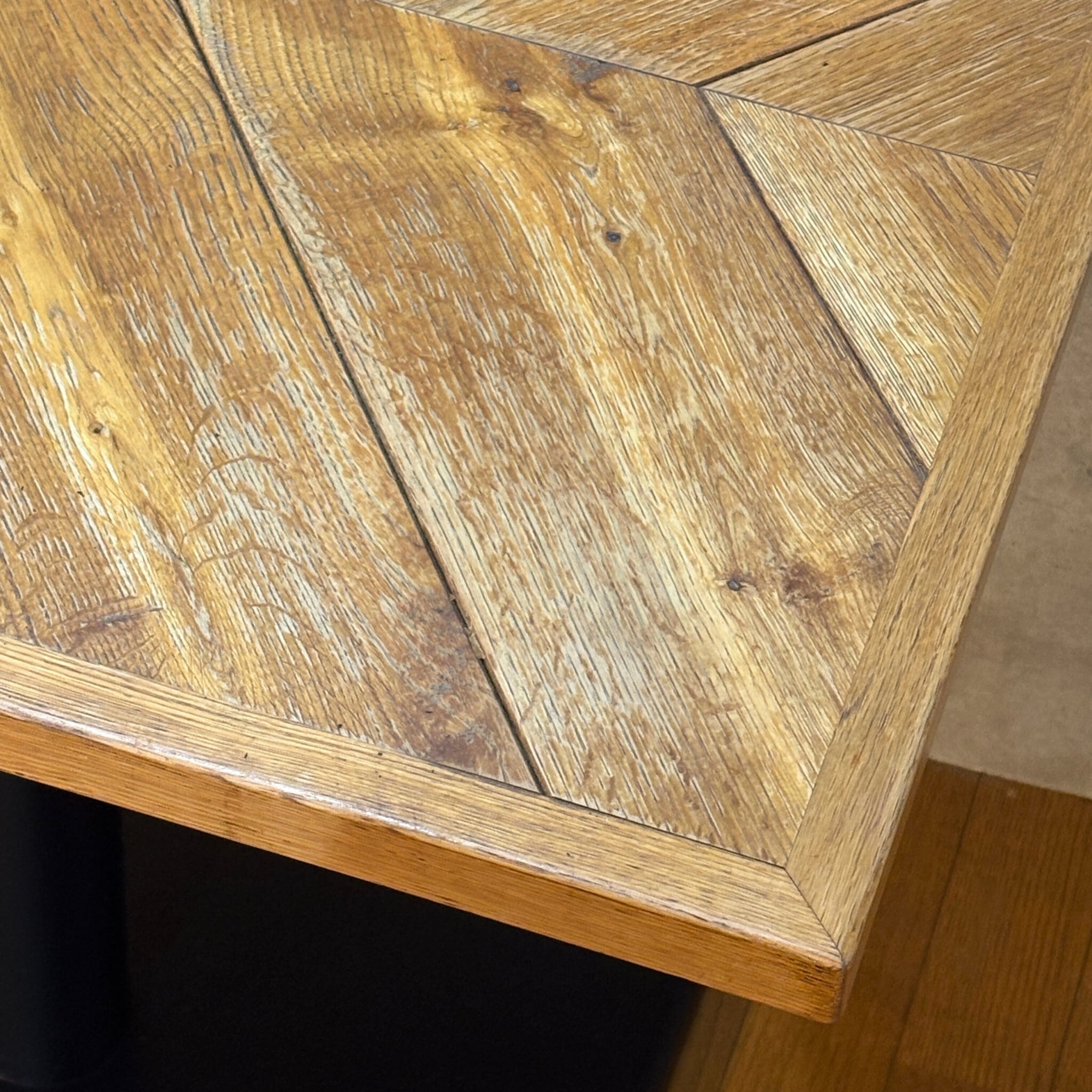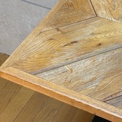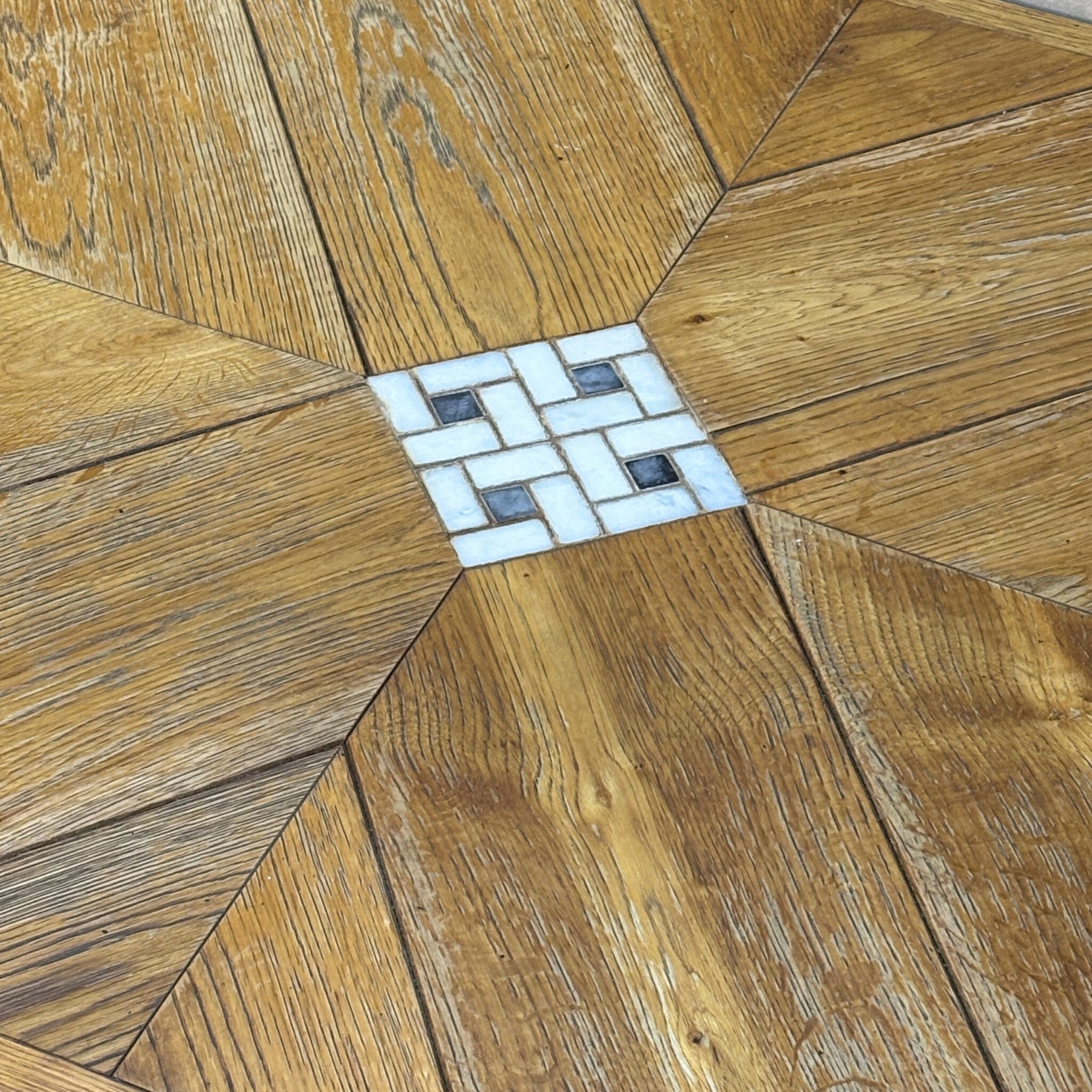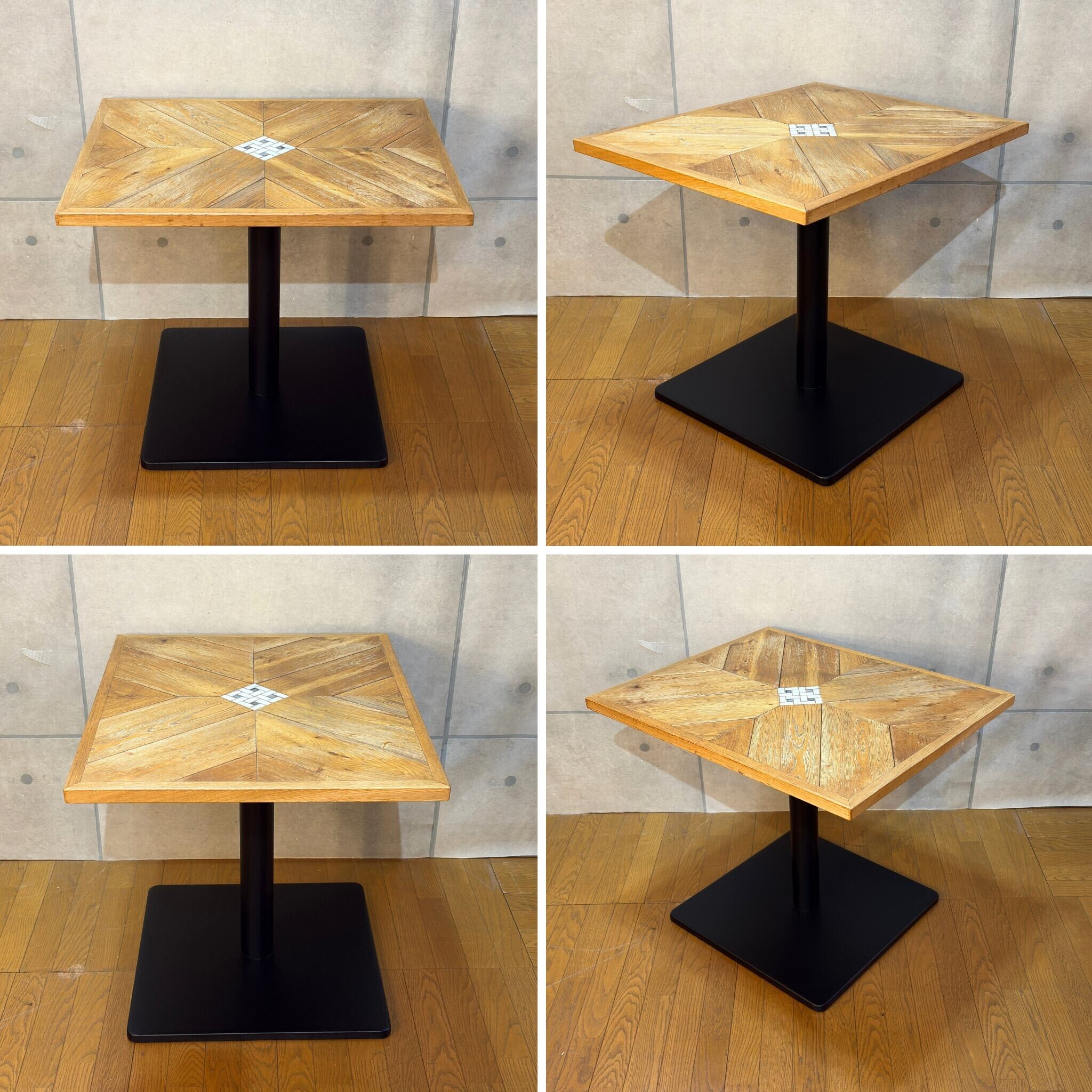 天板は木目が中心に向かって集まる「パーケット(寄木)」仕様。中央には白いモザイクタイルが埋め込まれており、木材の温かみの中に清潔感のあるアクセントになっています。脚部は無骨なアイアンベース(ブラック)で、空間を引き締めてくれます。
