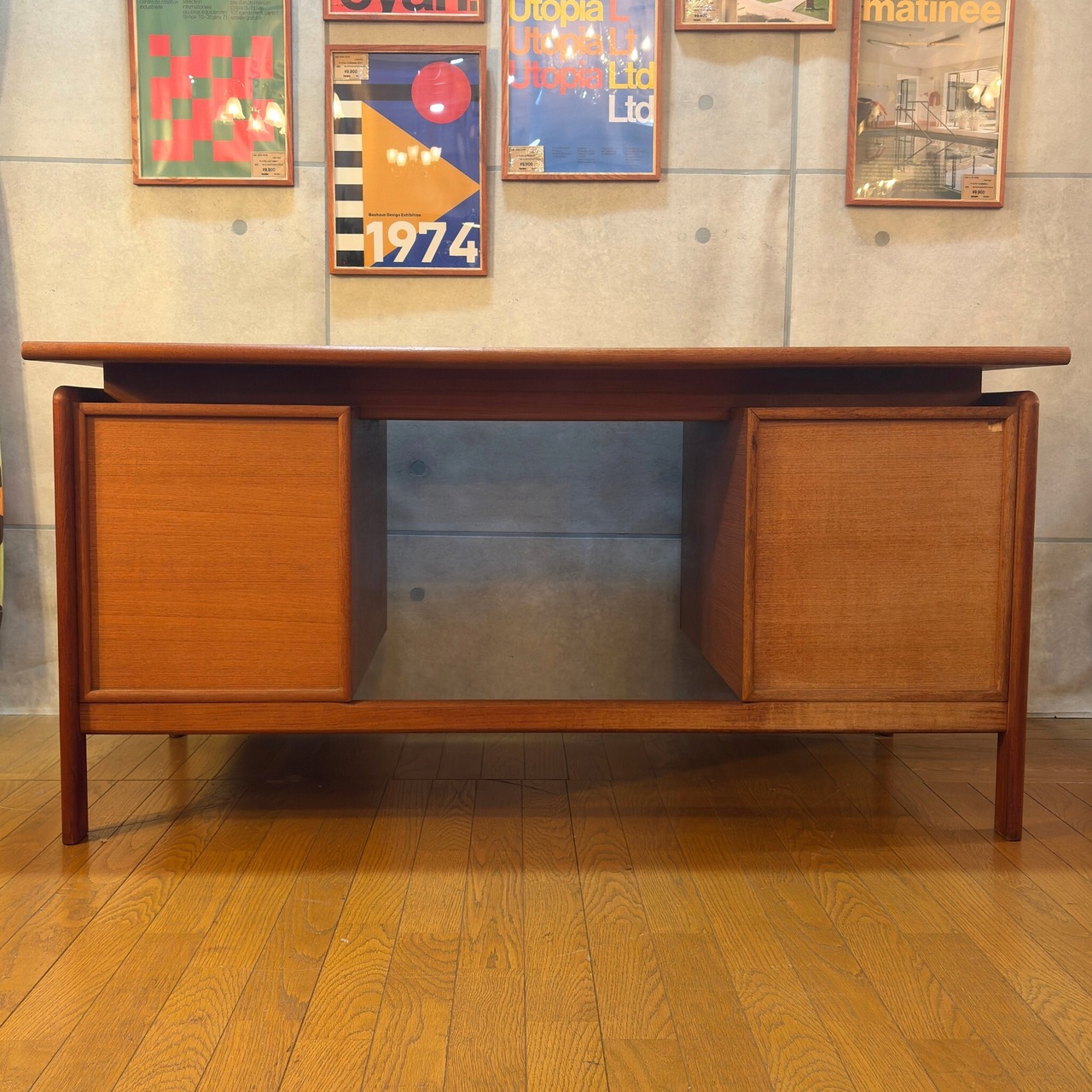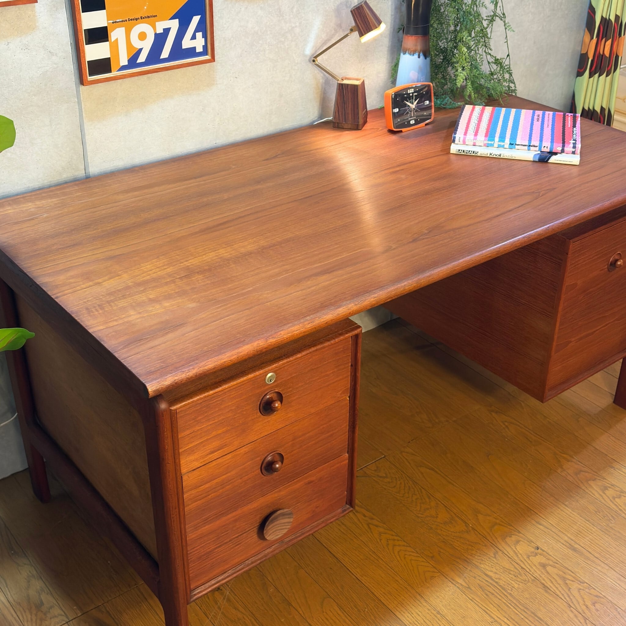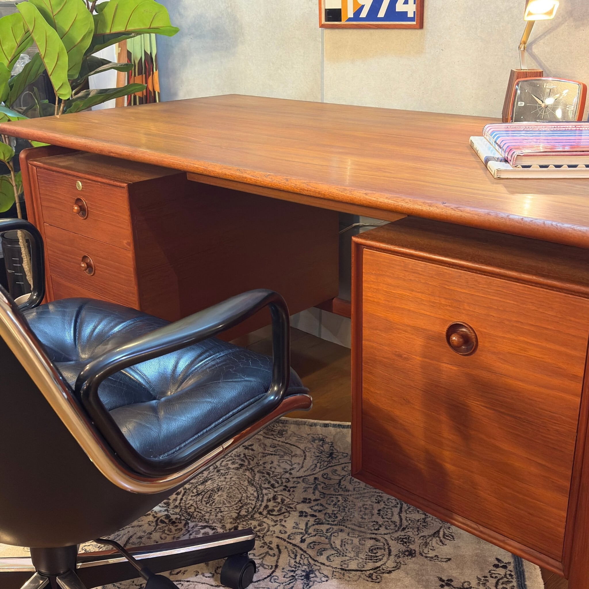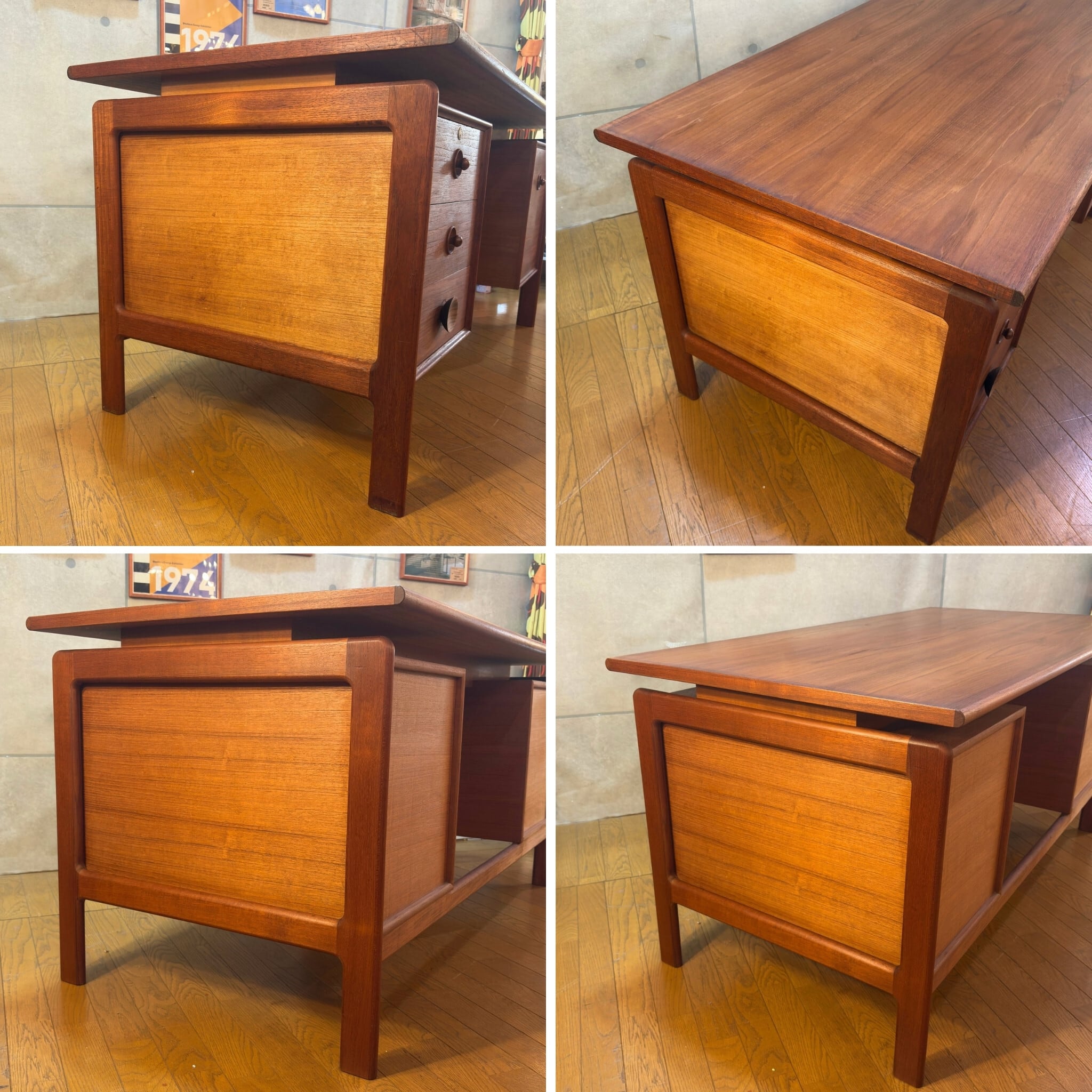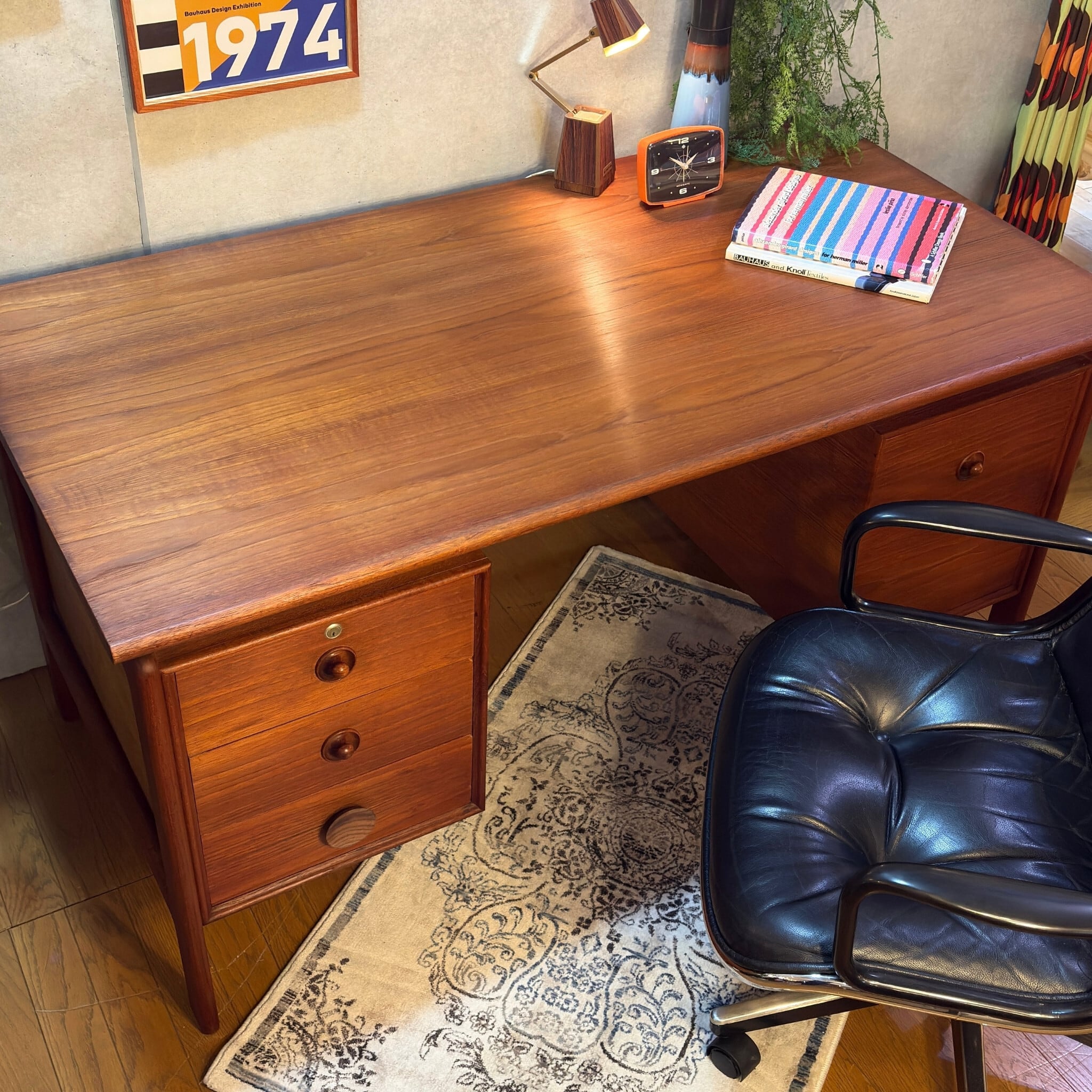 デザインは当時の流行が色濃く反映されています。天板と収納ユニットの間に隙間を設けるこの意匠は1950〜60年代にデンマークのデザイナー(フィン・ユールなど)が確立し、その後世界中の高級デスクに採用されたミッドセンチュリーを象徴するデザインです。