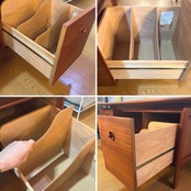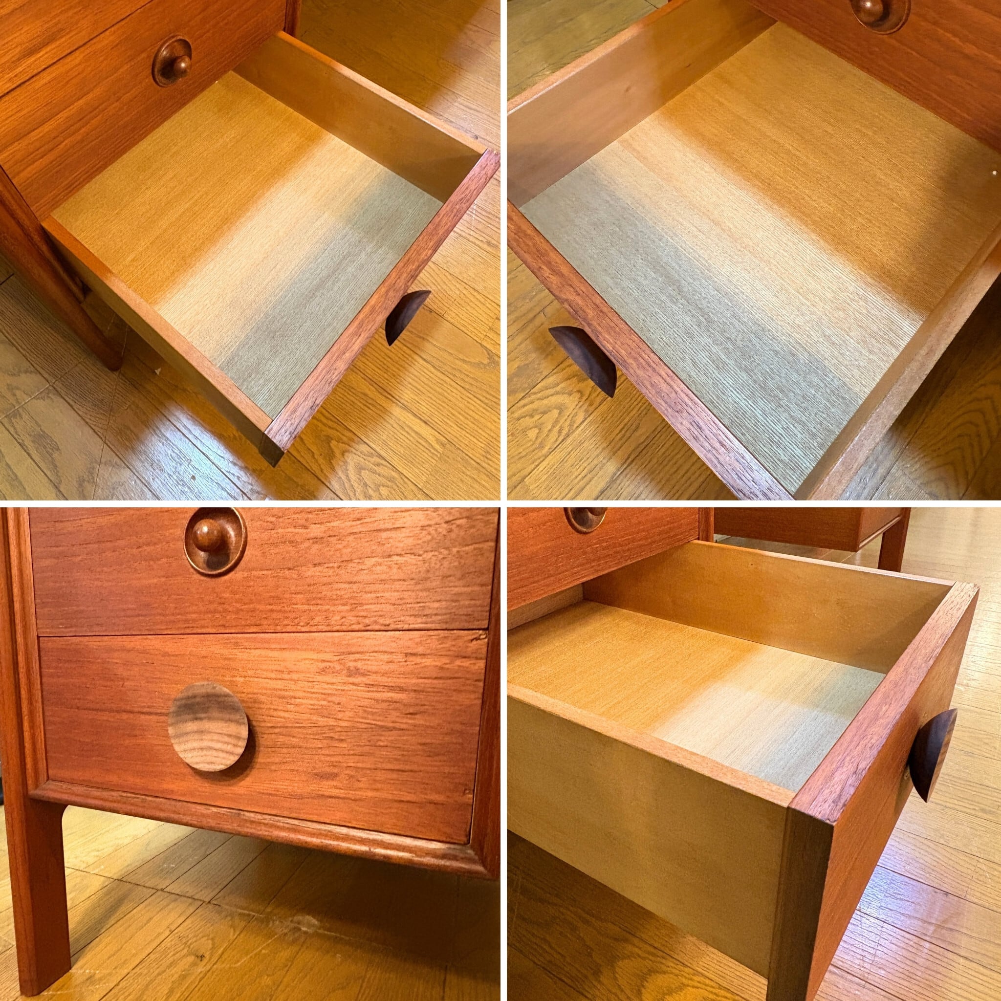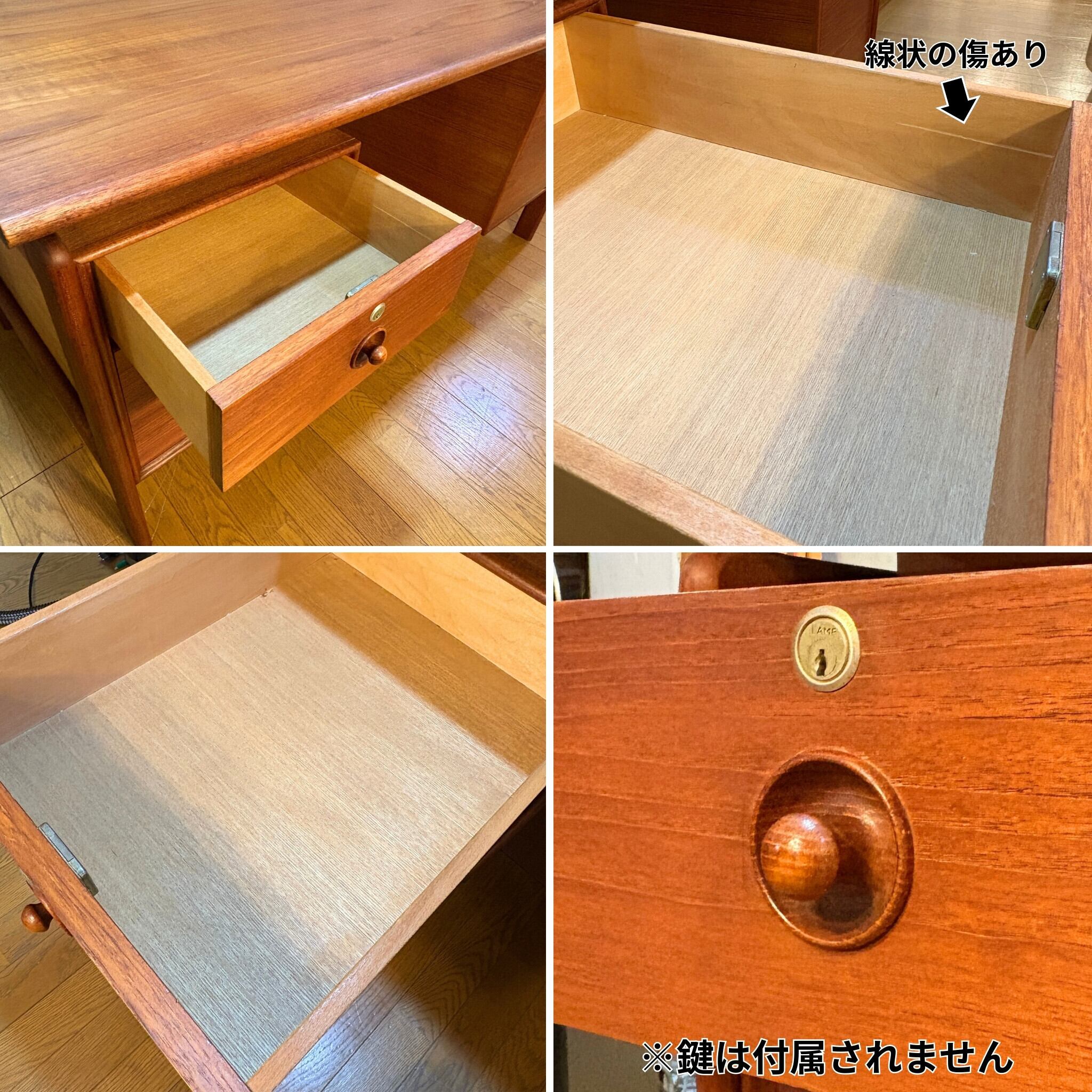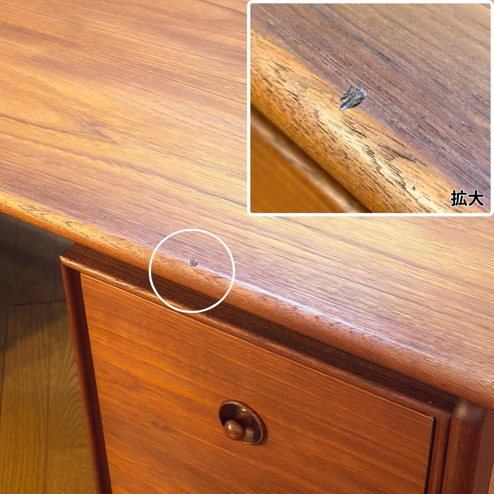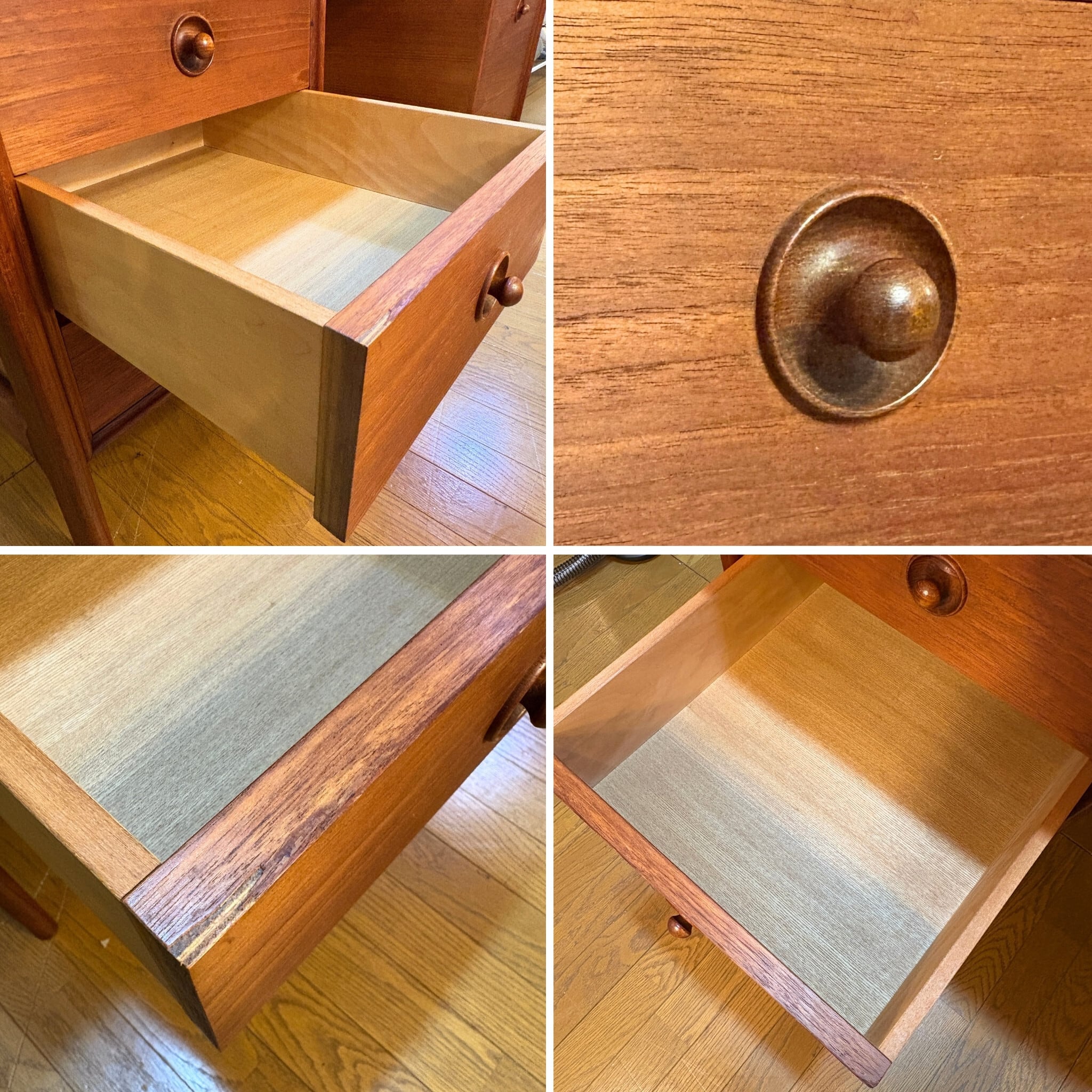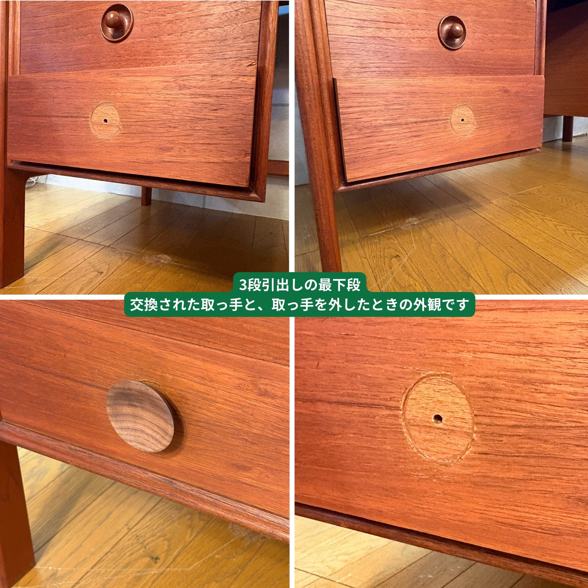●向かって左側 3段引出しの最下段のみオリジナルの取っ手が激しく損傷していた為、当店にて別の木製取っ手へ交換しております。元々は引出しの前板に埋め込まれているという特殊な構造であったことから大きな補修後が残ってしまっていますが同年代のチーク端材を埋め込み、できる限り雰囲気を損なわないようにしました。交換した取っ手を付けているとあまり見えませんが、画像でご確認下さい。