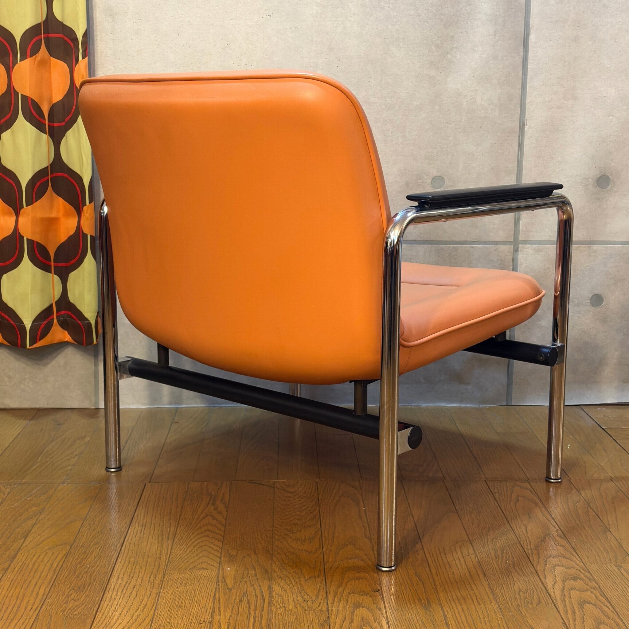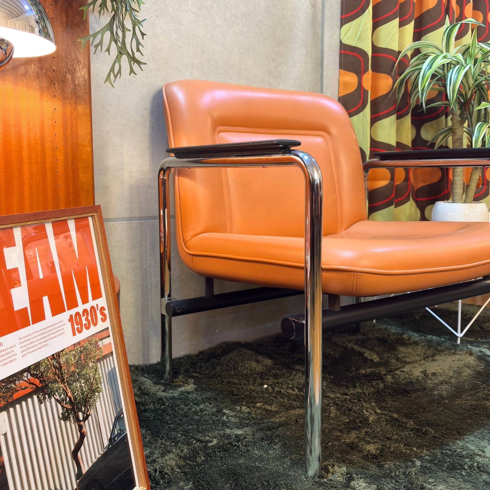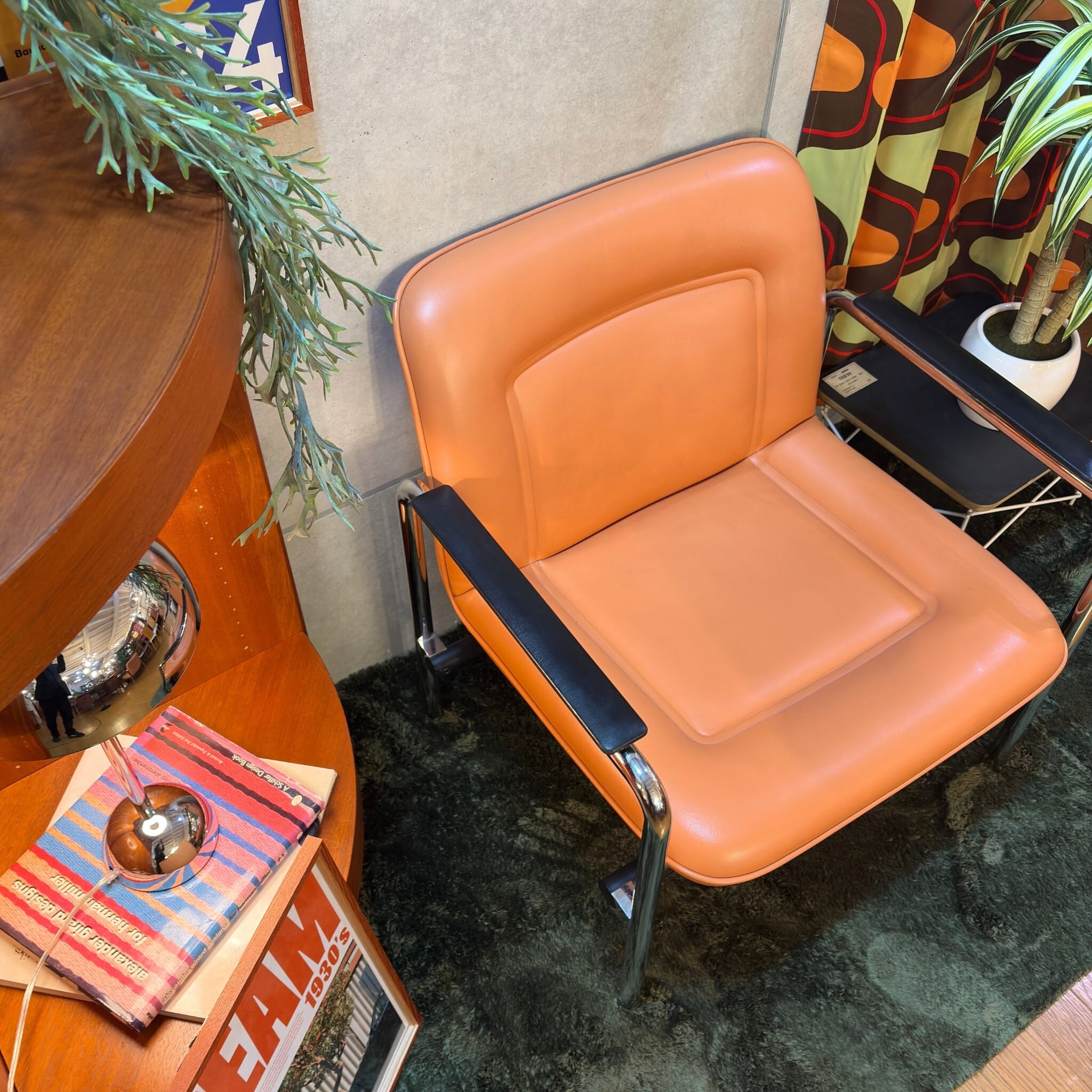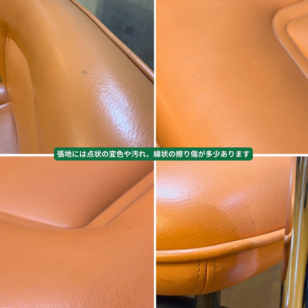 優雅な曲線を描くクロームメッキのパイプフレームに肉厚で鮮やかなオレンジのクッション。1960〜70年代のスペースエイジデザインを彷彿とさせるその佇まいは一脚あるだけで部屋の空気を一変させる力を持っています。 デザインはレトロですが2018年製という比較的新しいプロダクト。ヴィンテージの雰囲気と実用性を兼ね備えた一脚です。張地には高耐久のビニールレザー(合成皮革)が使用されています。
