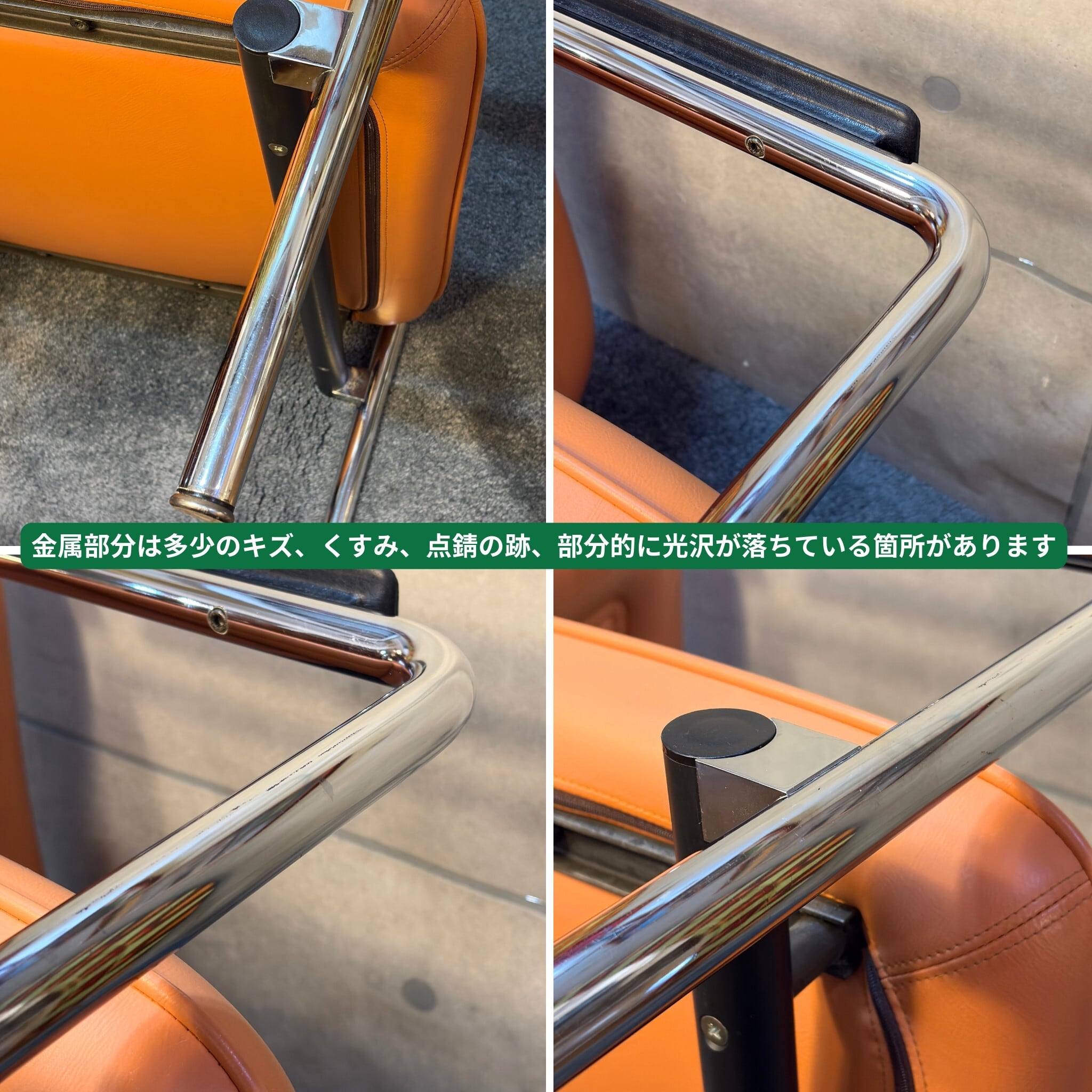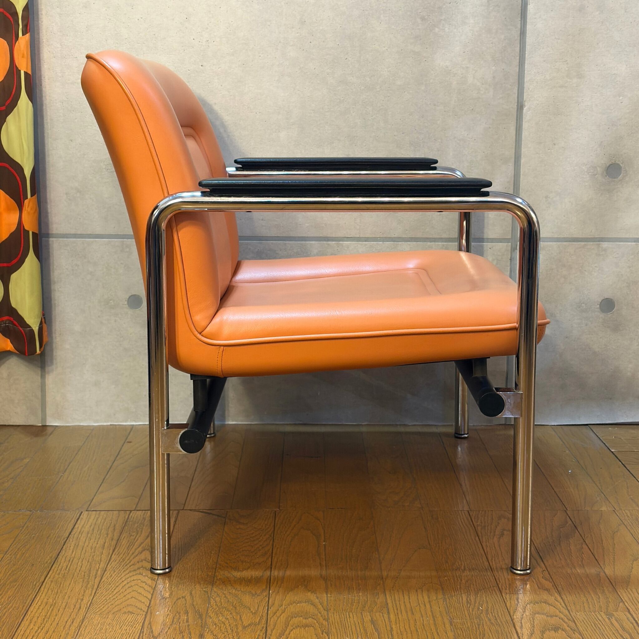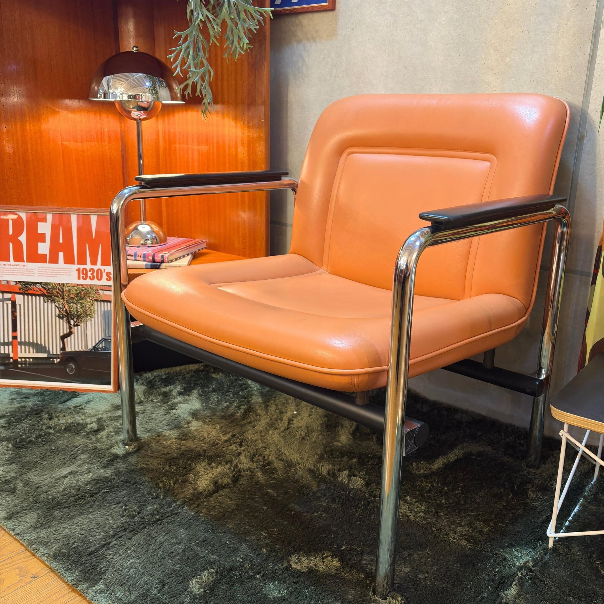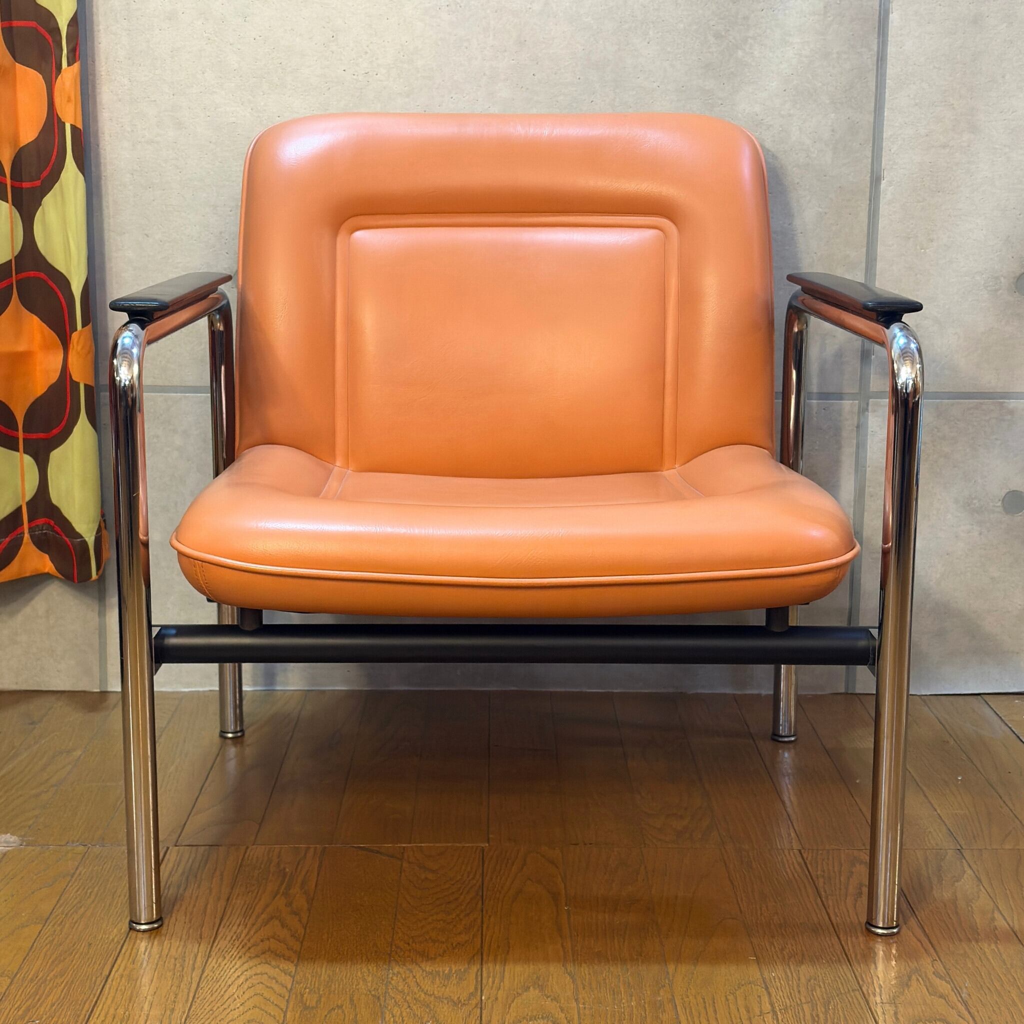 優雅な曲線を描くクロームメッキのパイプフレームに肉厚で鮮やかなオレンジのクッション。1960〜70年代のスペースエイジデザインを彷彿とさせるその佇まいは一脚あるだけで部屋の空気を一変させる力を持っています。 デザインはレトロですが2018年製という比較的新しいプロダクト。ヴィンテージの雰囲気と実用性を兼ね備えた一脚です。張地には高耐久のビニールレザー(合成皮革)が使用されています。