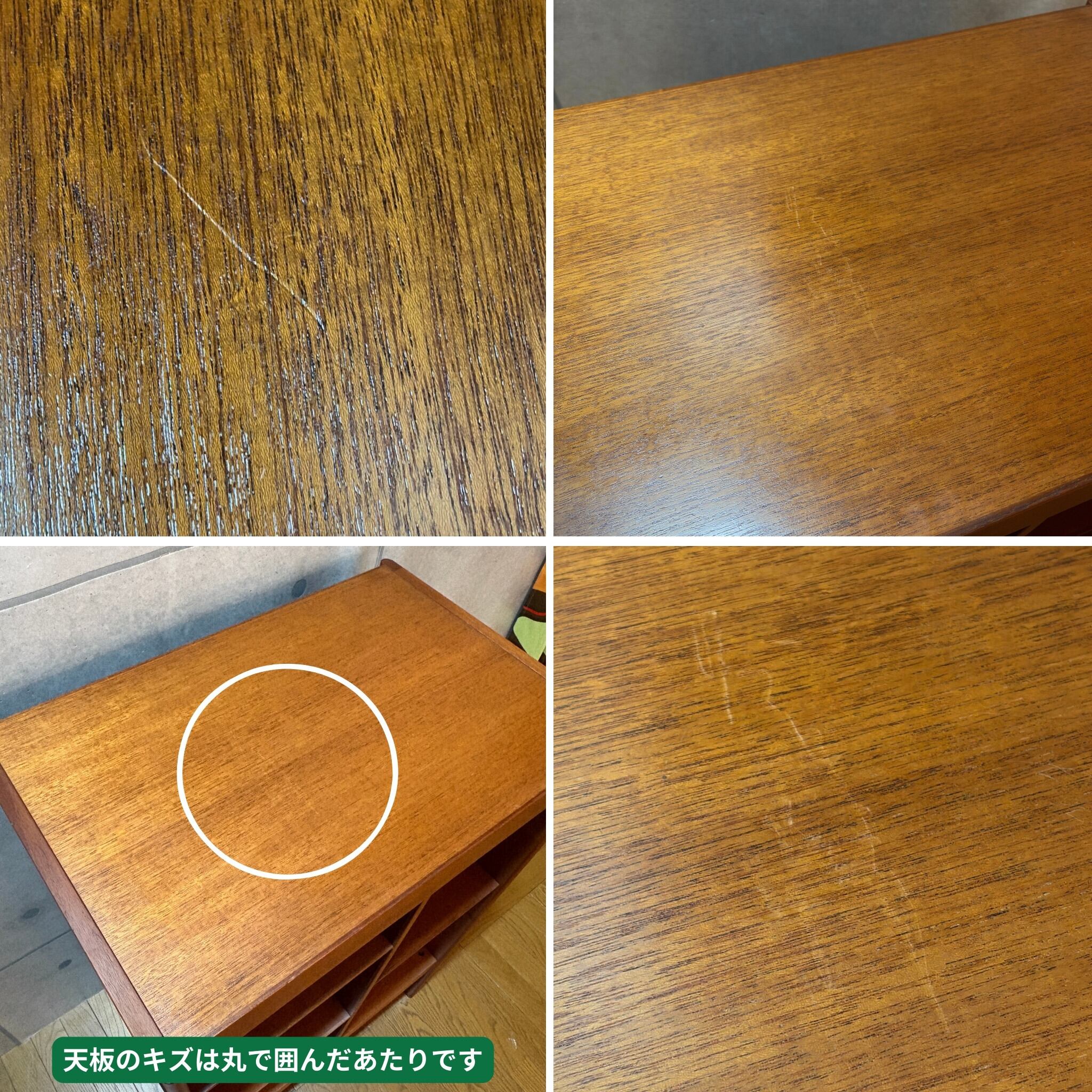半世紀という長い時間を歩んできた証としてキズや内部に日焼けの跡がございます。特に天板につきましては重いものを引きずったような跡が残っていますが突板が剥がれているほどではなく、触ると明らかに分かりますが少し離れると光の当たり方や見る角度によって見えたり、見えなかったりという感じです。