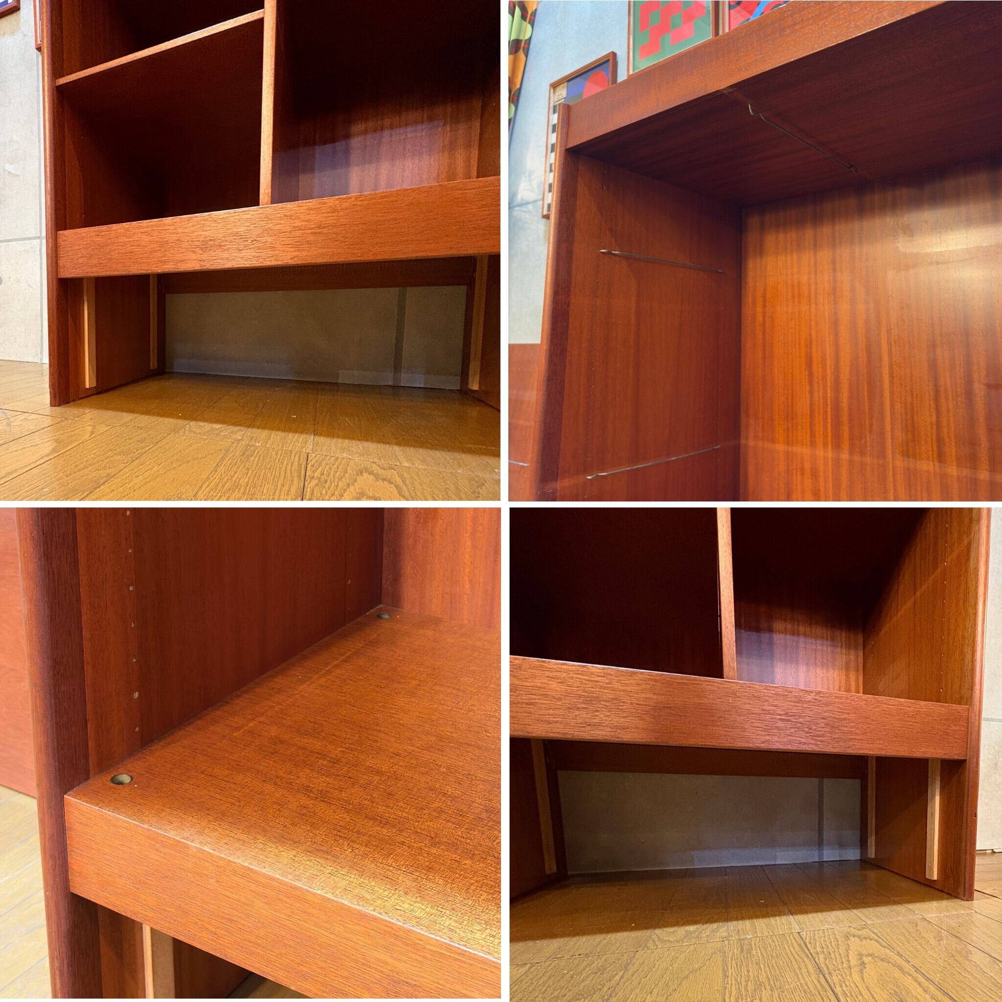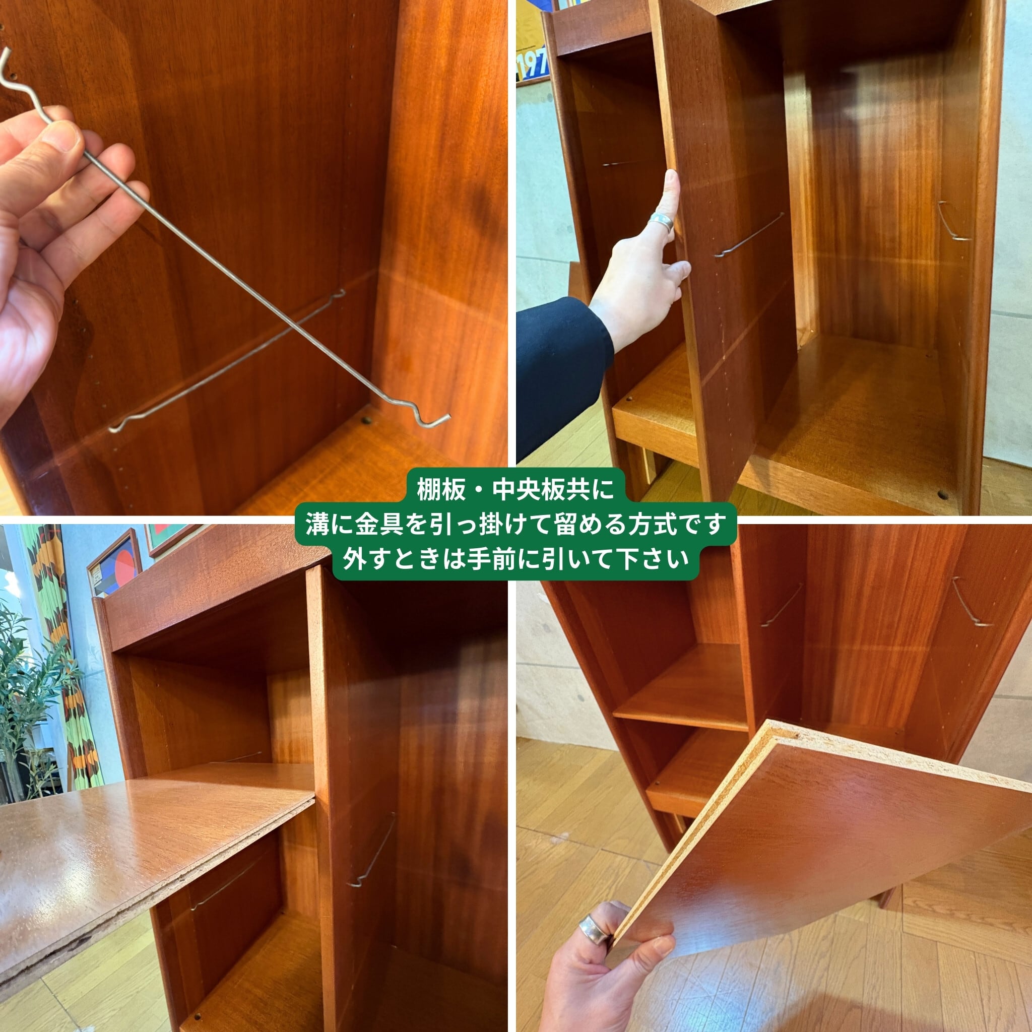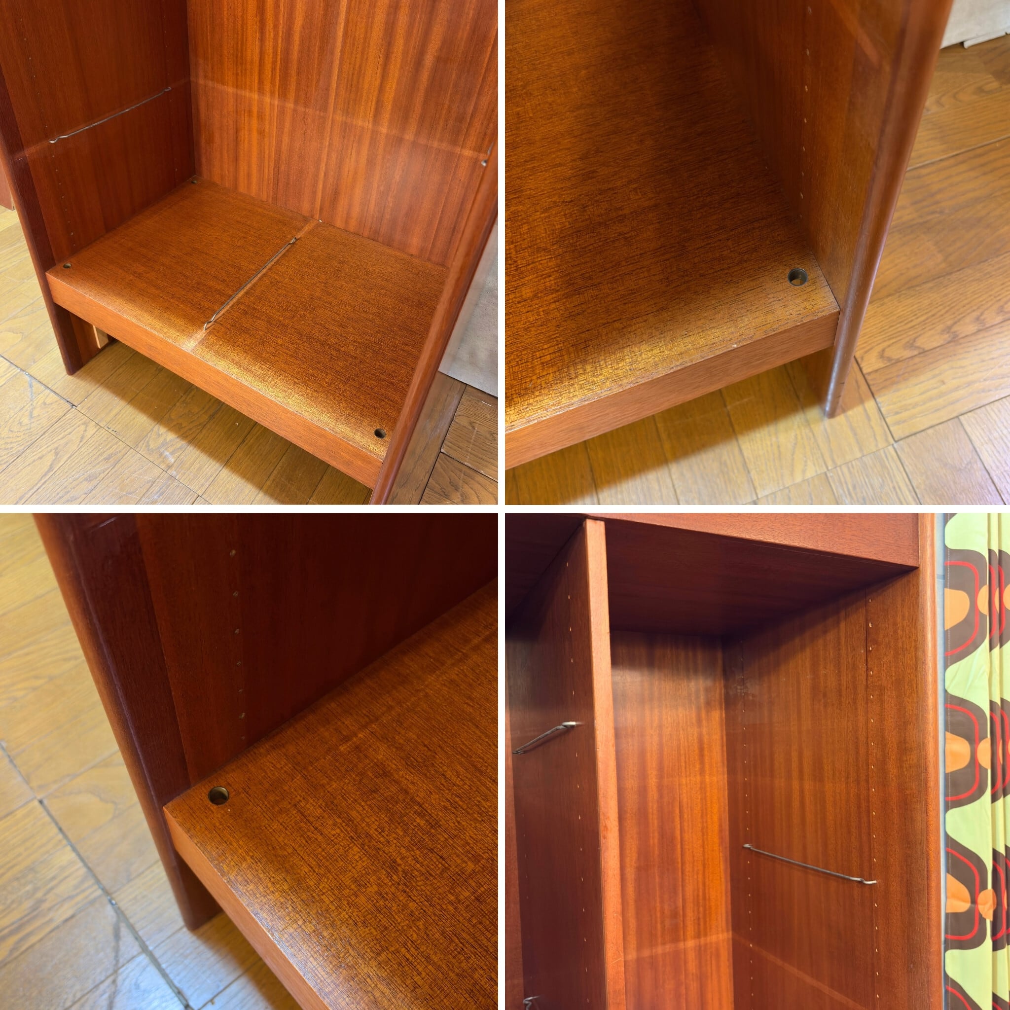 コンパクトな幅65cm&高さ103cmというサイズ感はお部屋に圧迫感を与えず、それでいて十分な収納力を提供します。棚板の位置を支える金属製バーの仕様は北欧デザインが最も洗練されていた時代の象徴的なディテールです。