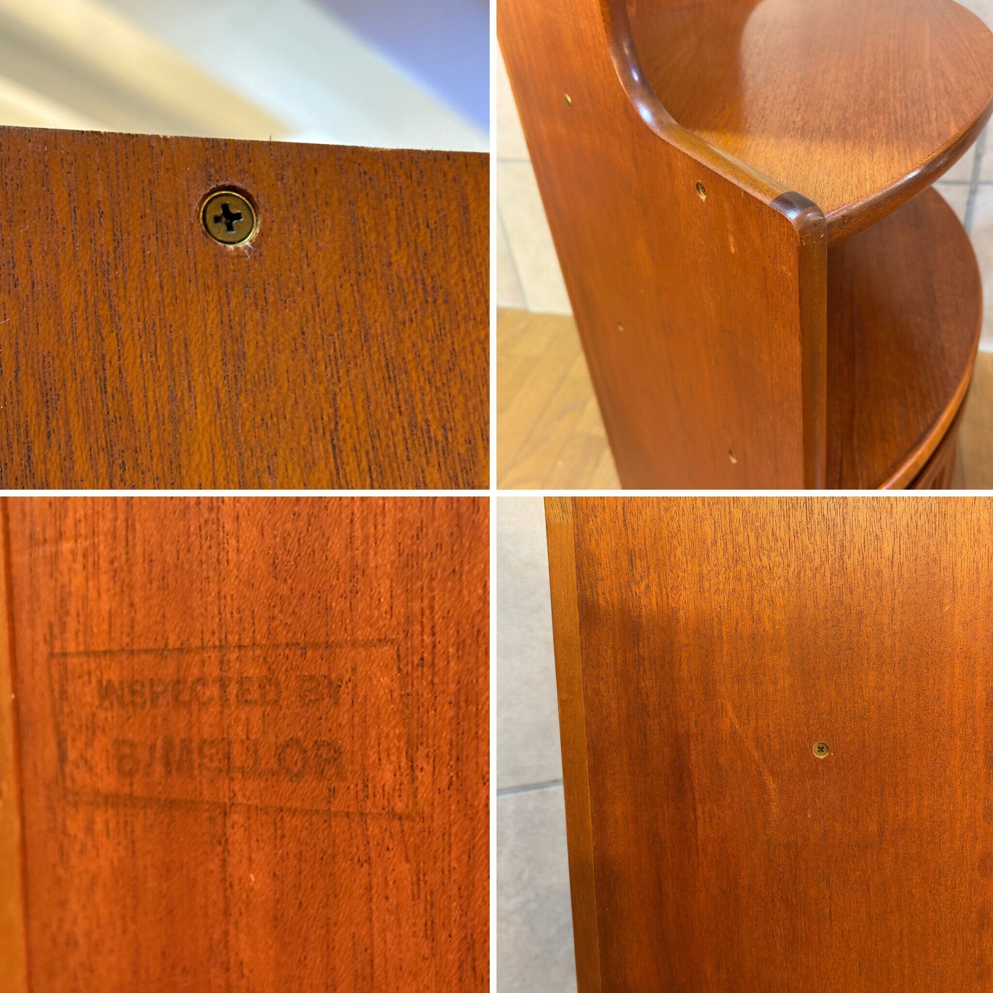 ロゴシールが残っておりません為に価格を低めに設定しております。しかしながら背面に押された「INSPECTED BY B. MELLOR」の品質検査スタンプや扉の取っ手部分に見られる緻密なフィンガージョイント(組み木)、そして何よりこの『Squares』シリーズ独自の意匠から間違いなくNathan社の製品であることを断言いたします。