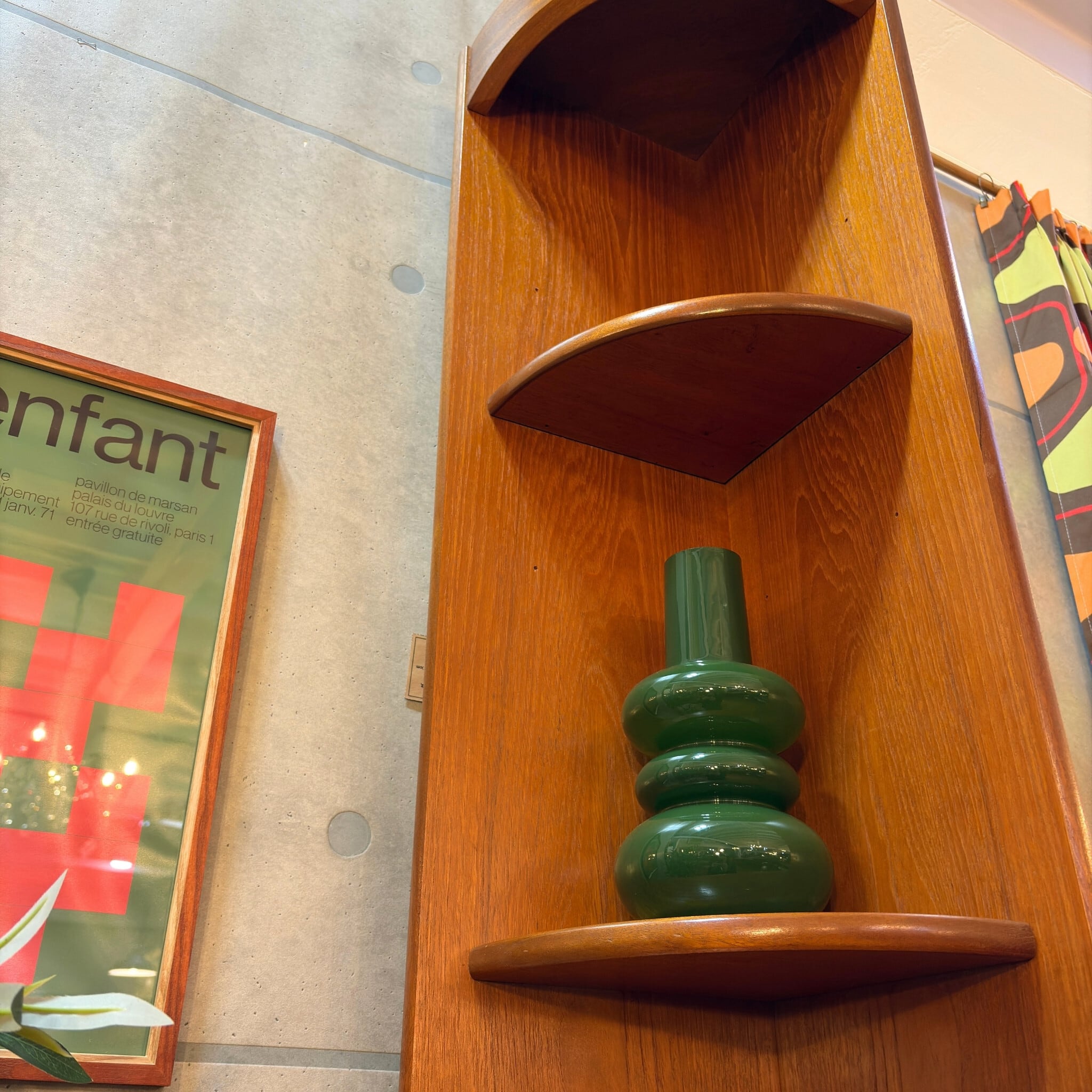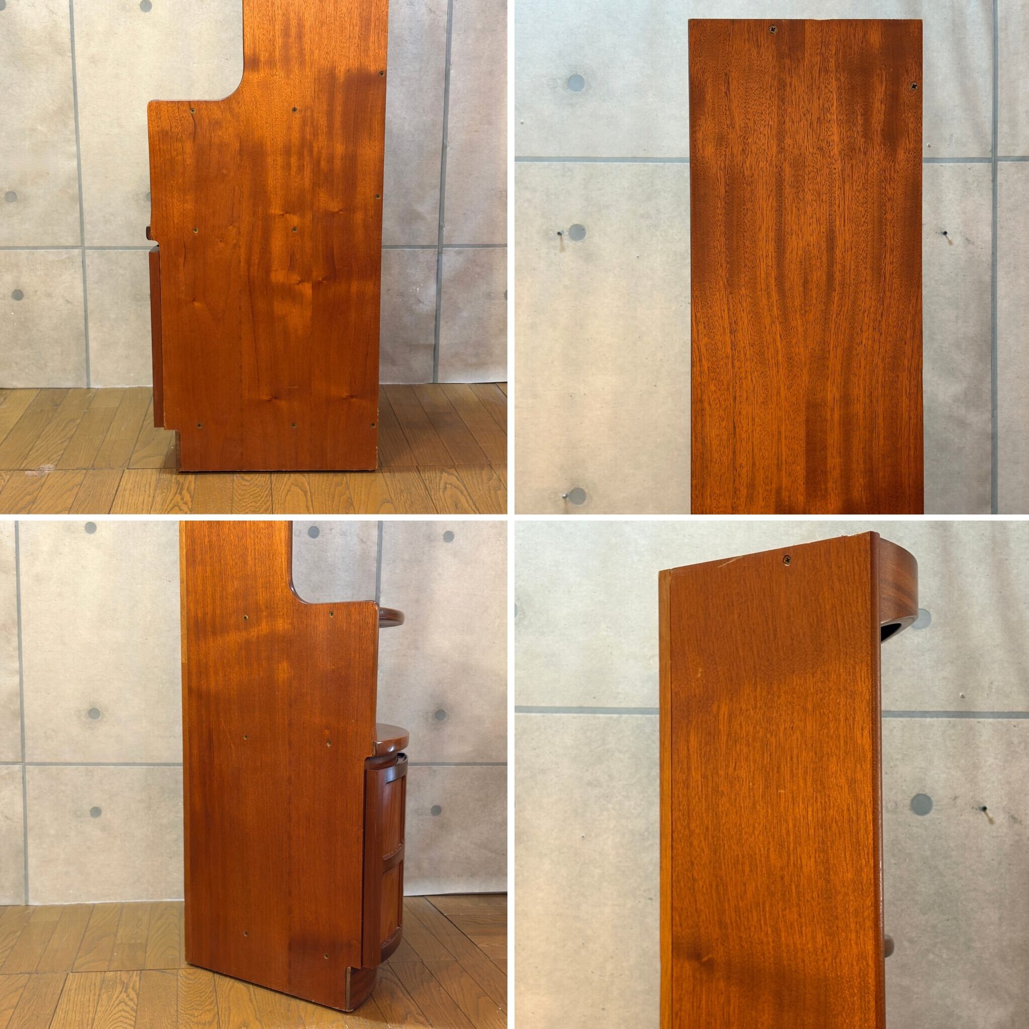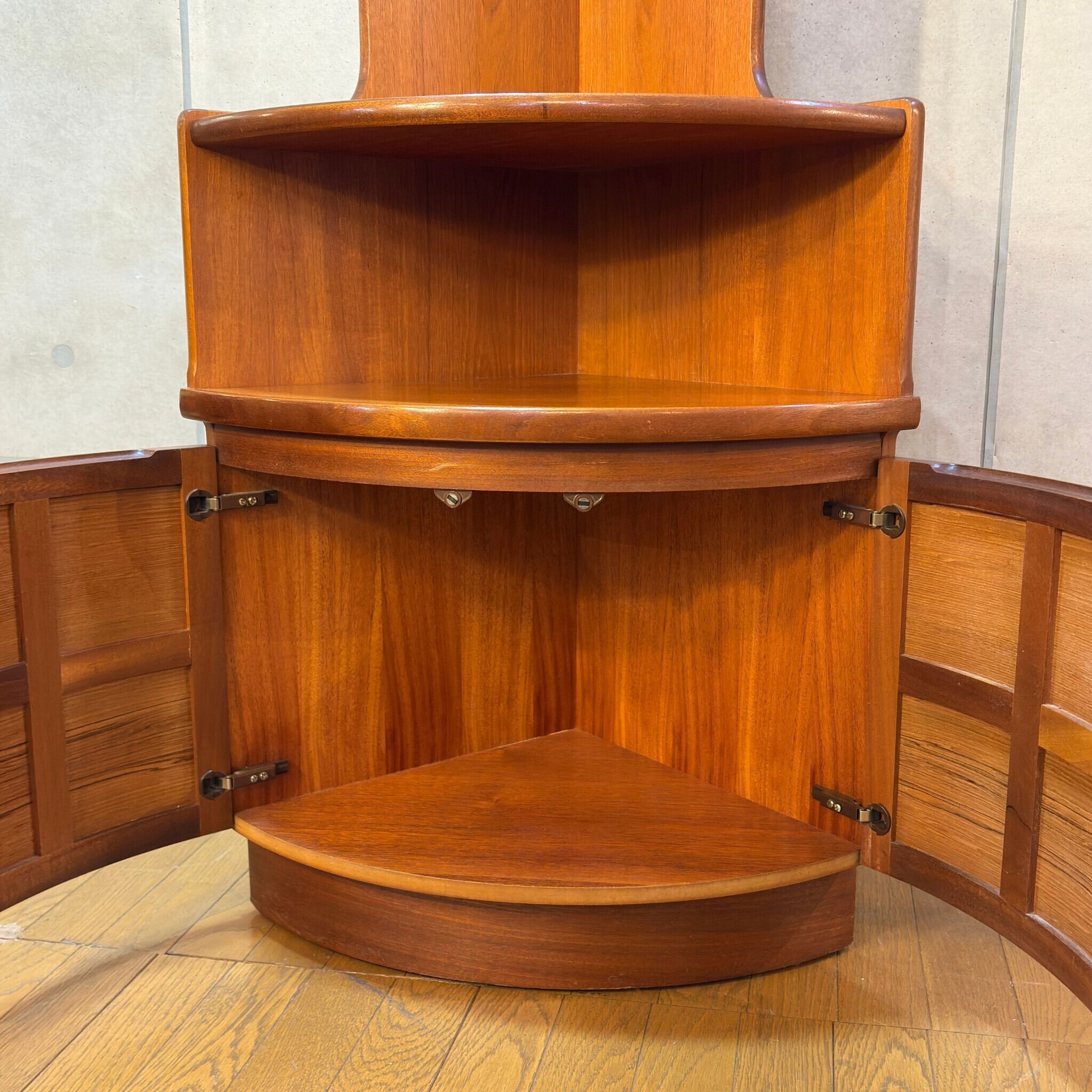 1970年代の製造と推定されます。デッドスペースだったお部屋の角を自分だけの小さなギャラリーに変えてくれるコーナー型です。上段は装飾スペースとして、扉内には見せたくないものを隠してお使い下さい。扉内の内寸はW57 × D40 × H33 cmです。