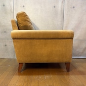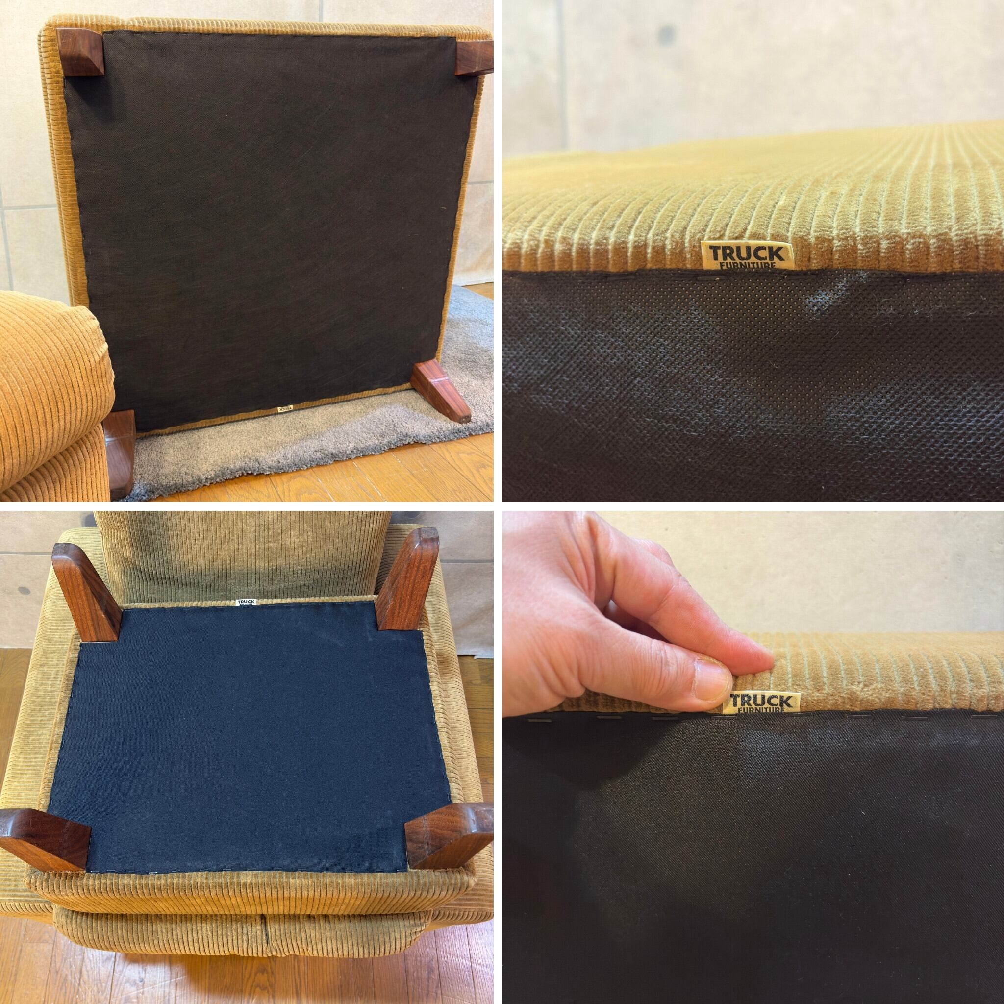 生地はF-21 グリーンコーデュロイ。 この生地はコットン100%の天然素材である事から日光による退色(日焼け)が出やすいという特性を持っています。本個体もクッションを外した際に見える本来のグリーンに対し、表面は明るいベージュやカーキに近いトーンへと変化しています。この変化こそが本物の天然素材を長年使い込んだ証であり、TRUCKの家具が持つヴィンテージ・パティーナの醍醐味です。