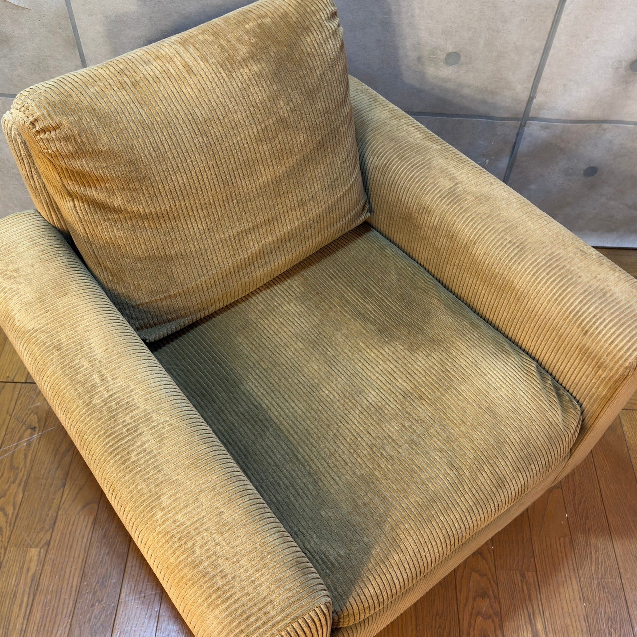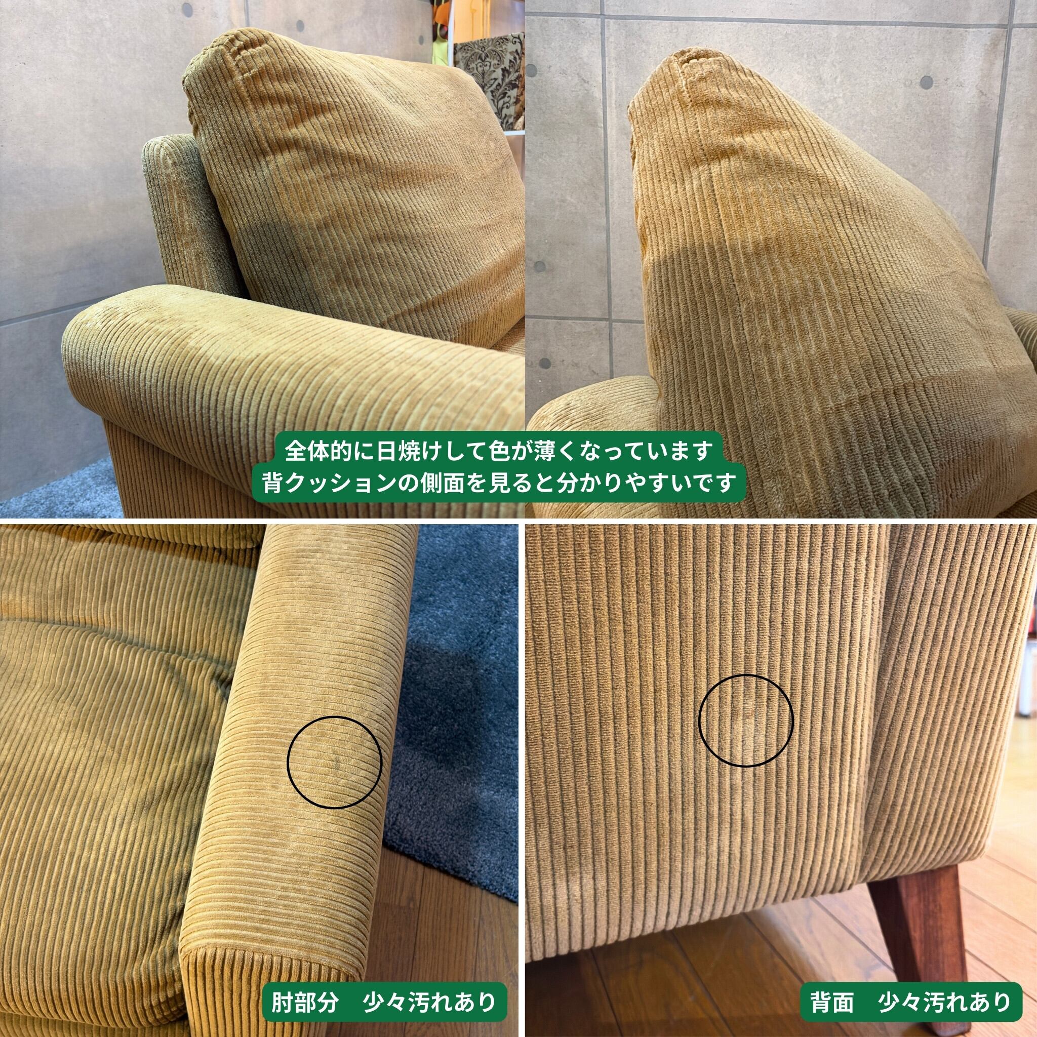 全体的に顕著な日焼け(退色)が見られます。ソファは形状的に光の当たり方を均一に出来ない為、特にコーデュロイにつきましては角度により様々な色合いに見えますので正確な表現が難しいのですが色が薄くなっている部分は色が変化しているとお考え下さい。撮影時は照明を当てていますが暗いところですと見え方が変わってきます。
