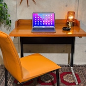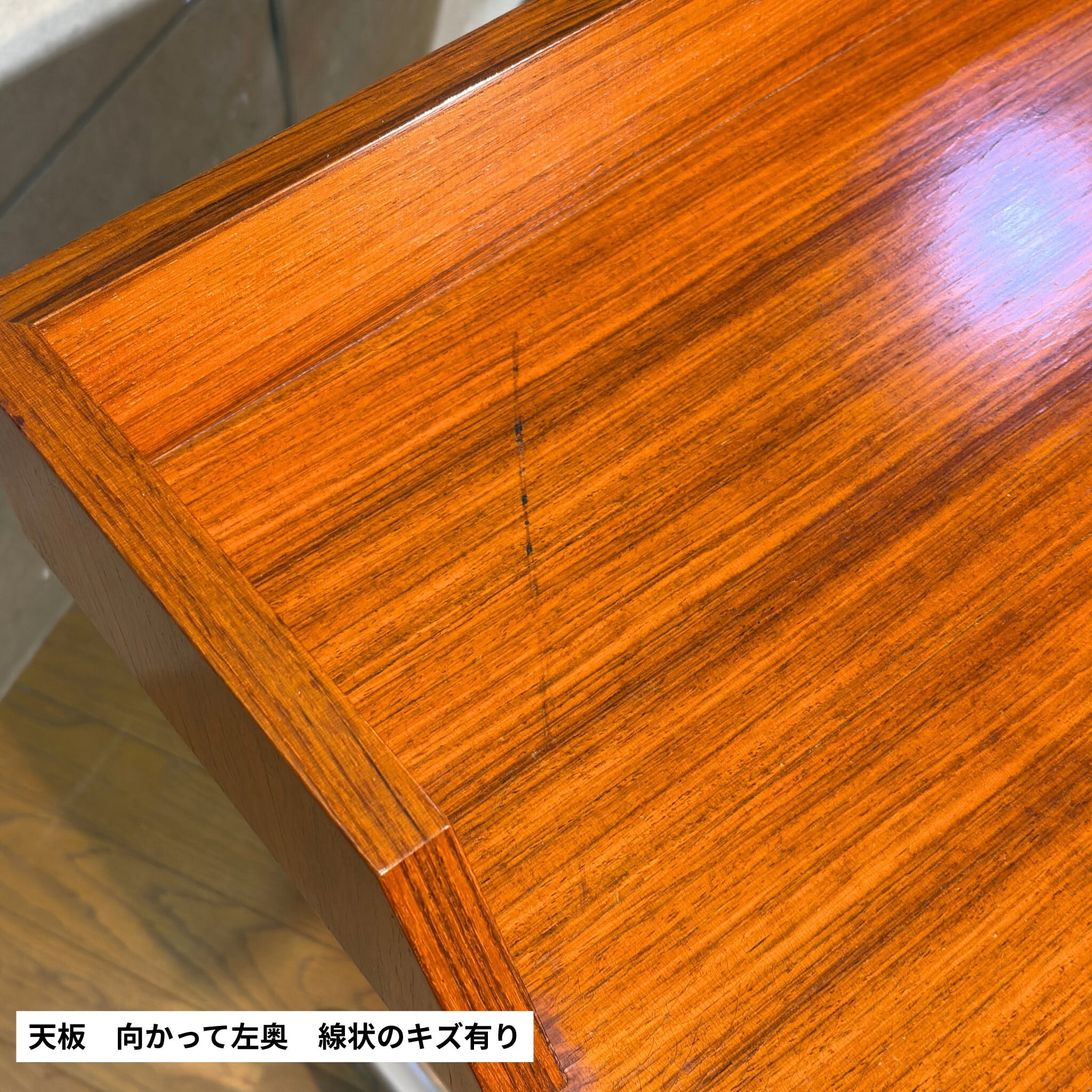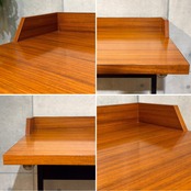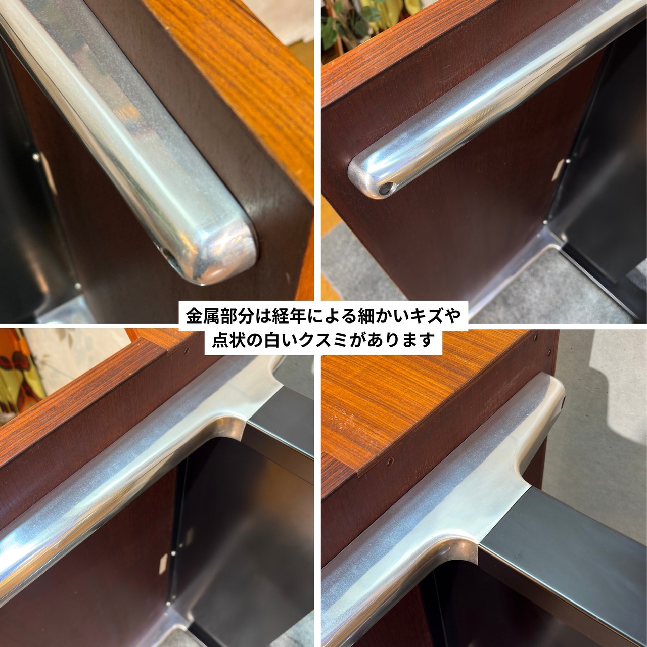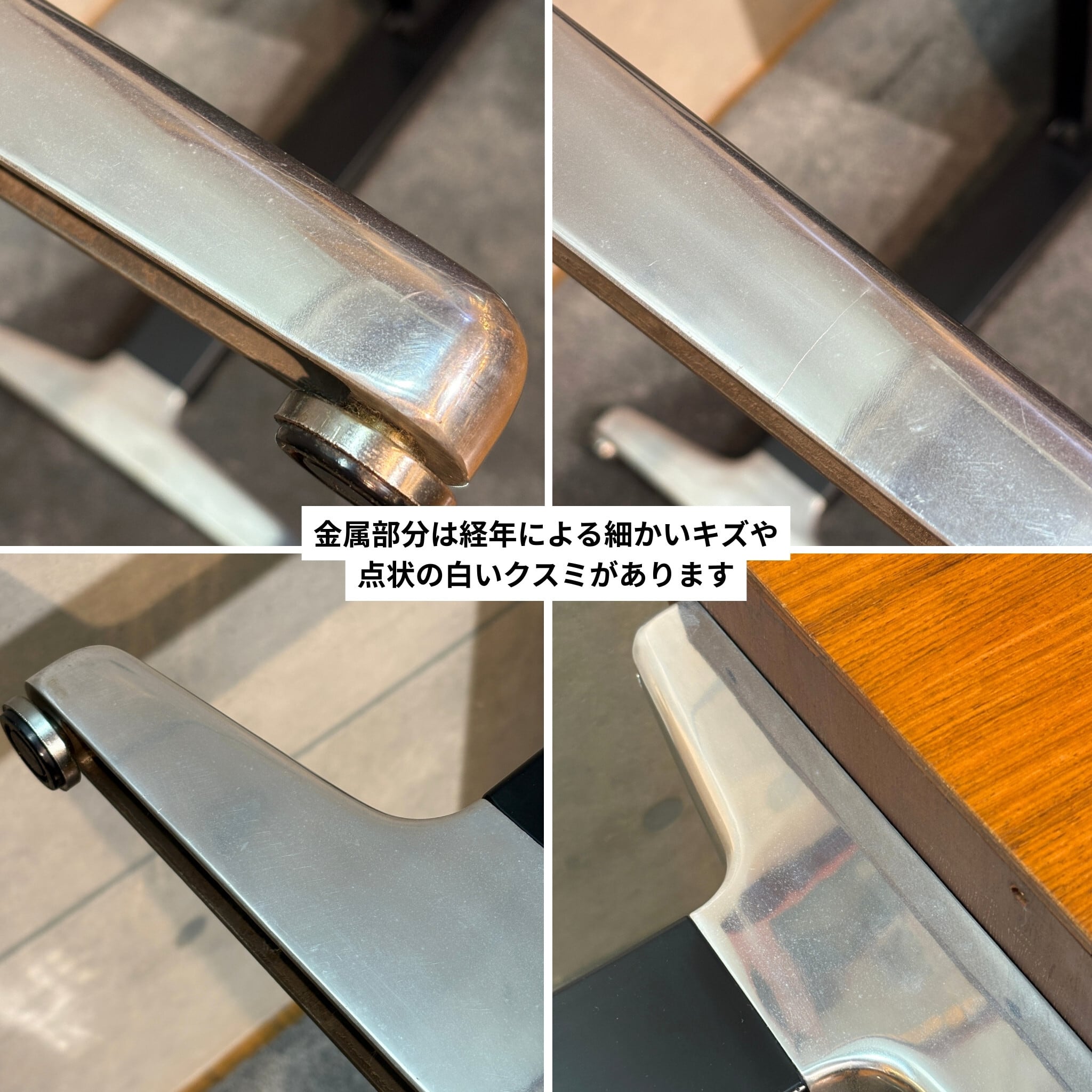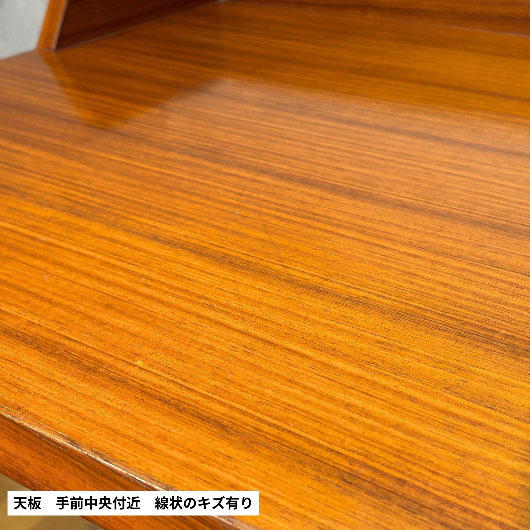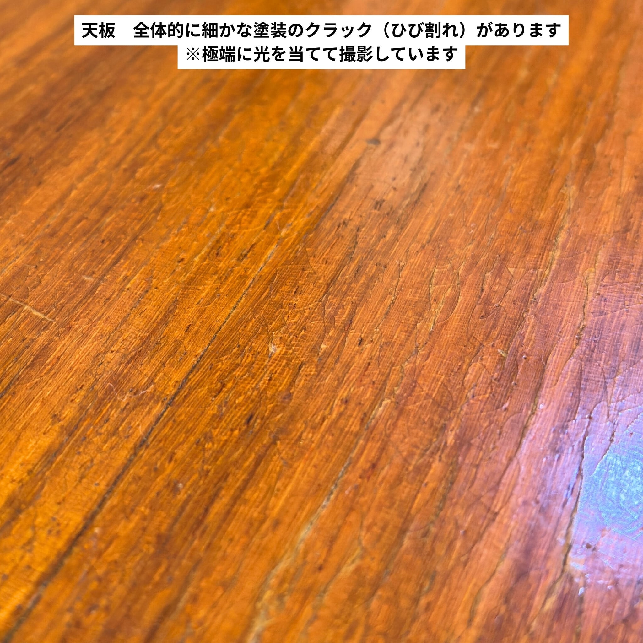 天板全体には経年使用に伴う細かな擦れや線状のキズ、部分的な補修跡と思われる箇所が見られます。また、光を強く当てた際に確認できる程度の、塗装表面の細かなクラック(ひび割れ)が全体にあります。いずれも突板の浮きや構造的な問題はなく、通常使用において支障となるものではありません。脚部や金属パーツには経年による細かなキズや点状のくすみが見られます。入荷後、全体のクリーニングおよびワックス仕上げを施しておりヴィンテージらしい表情を保ちながら、実用を前提とした状態に整えています。