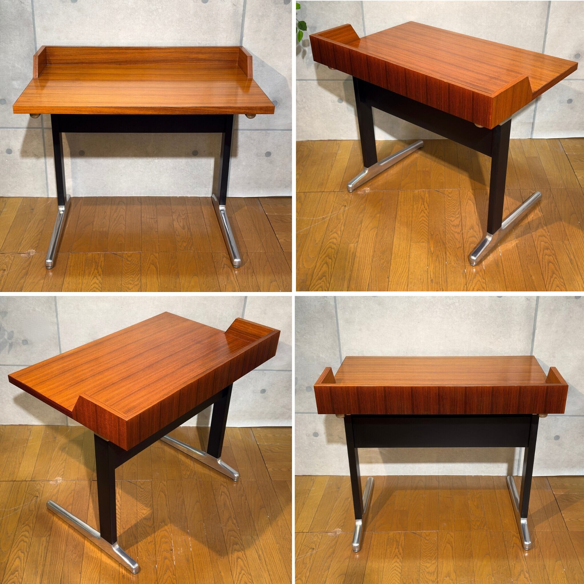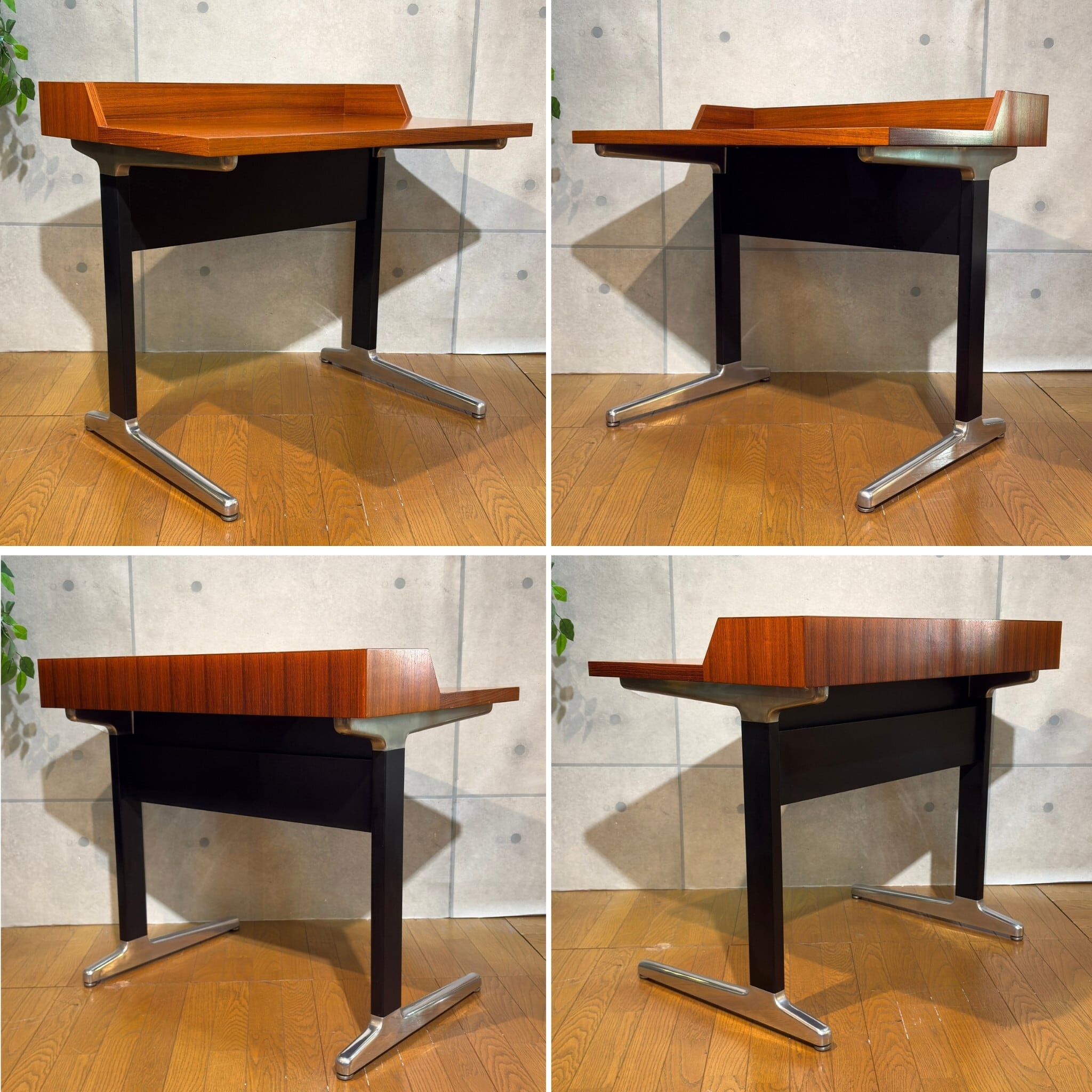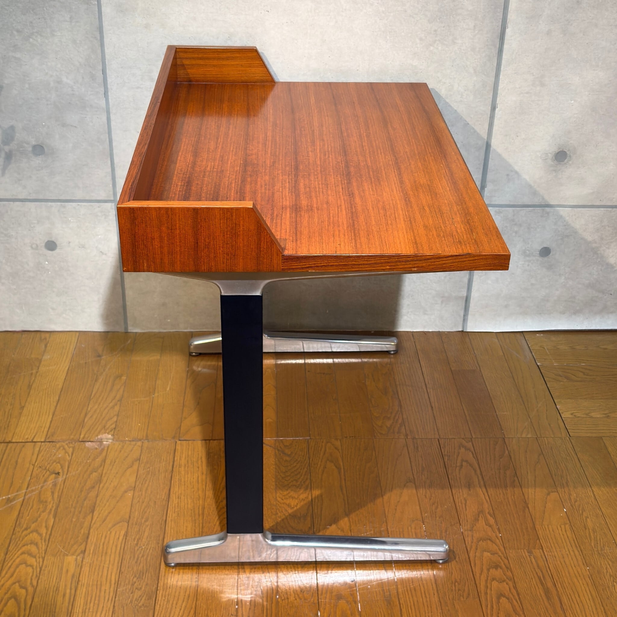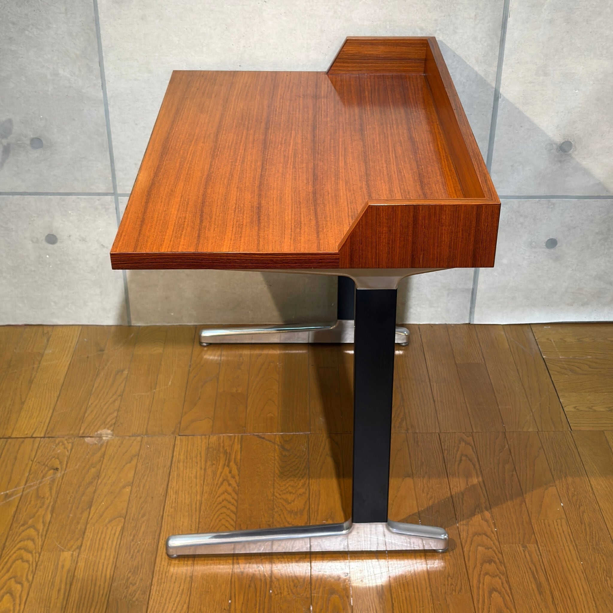 合理性と量産性を軸とするAO1シリーズの中においてこれほど木質表情を前面に押し出した構成は例外的で、通常の執務用というより役職者や来客を想定した空間に設えられる事を前提としたデスクであった可能性がうかがえます。金属脚と木質天板の対比はハーマンミラーが当時模索していた「オフィス家具と居住性の融合」を象徴する構成で、現代の住空間においても書斎やリビングデスクとして自然に取り入れやすい佇まいです。