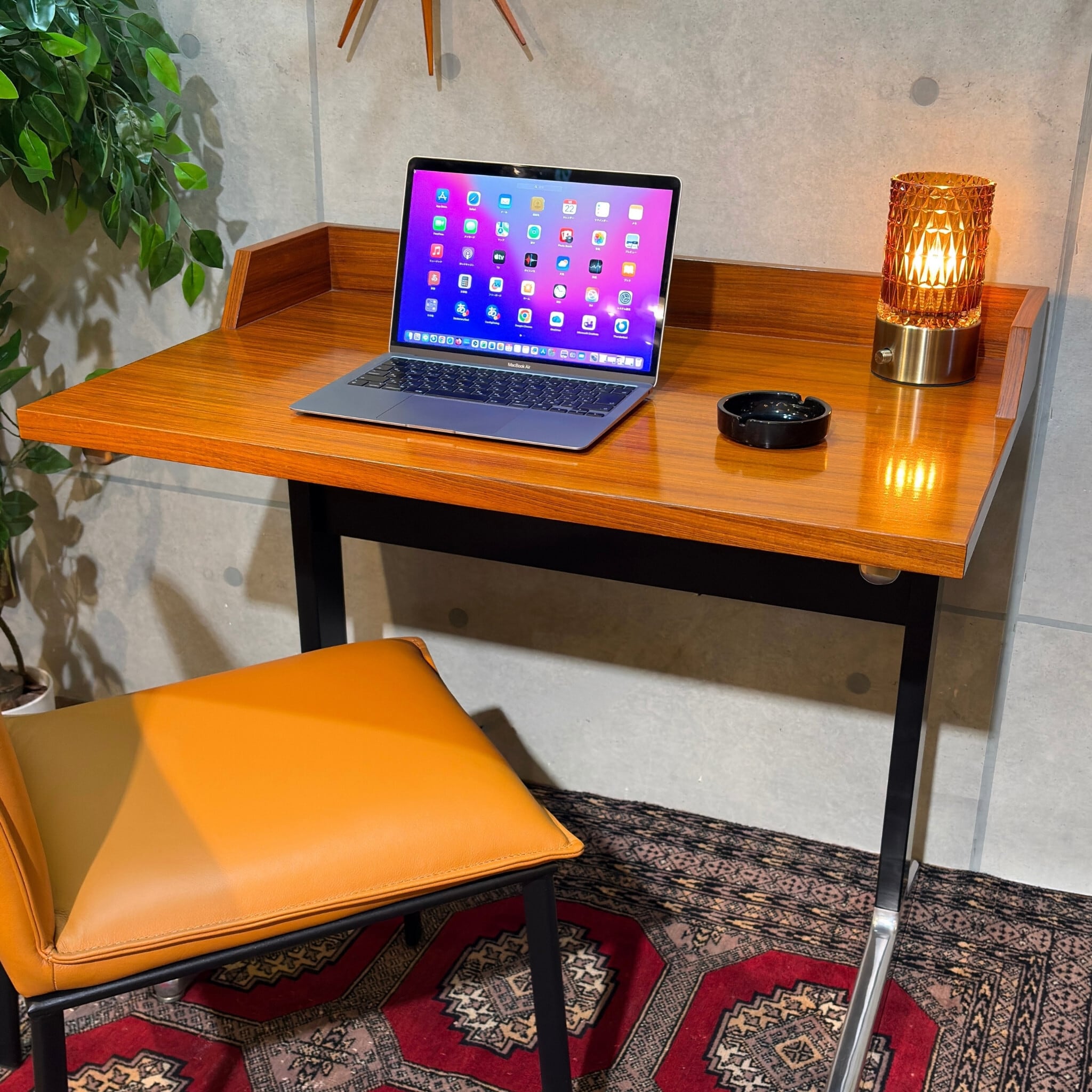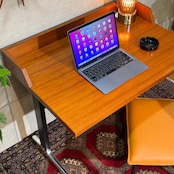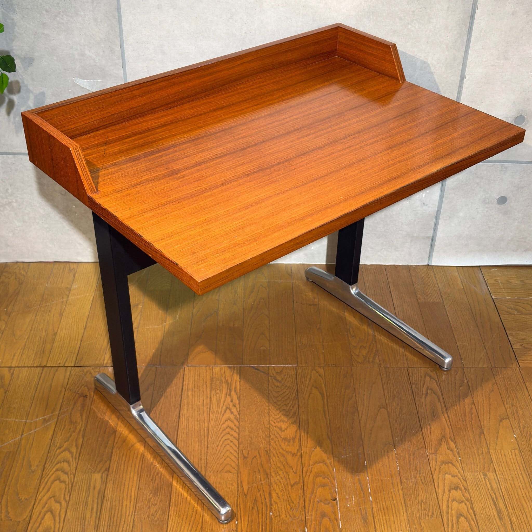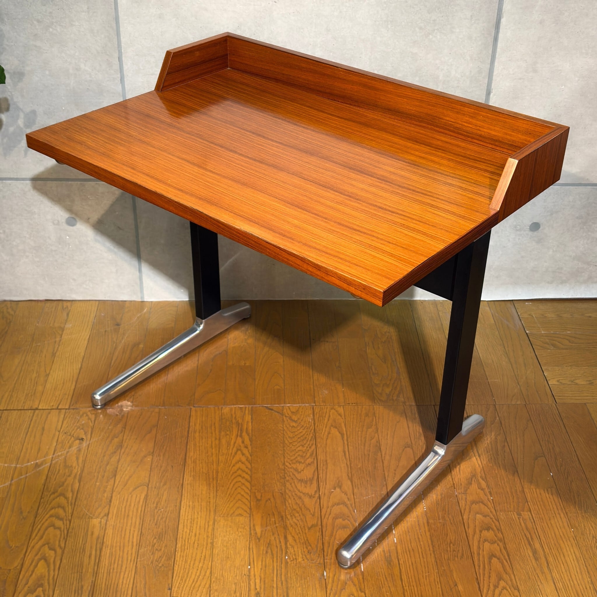 合理性と量産性を軸とするAO1シリーズの中においてこれほど木質表情を前面に押し出した構成は例外的で、通常の執務用というより役職者や来客を想定した空間に設えられる事を前提としたデスクであった可能性がうかがえます。金属脚と木質天板の対比はハーマンミラーが当時模索していた「オフィス家具と居住性の融合」を象徴する構成で、現代の住空間においても書斎やリビングデスクとして自然に取り入れやすい佇まいです。