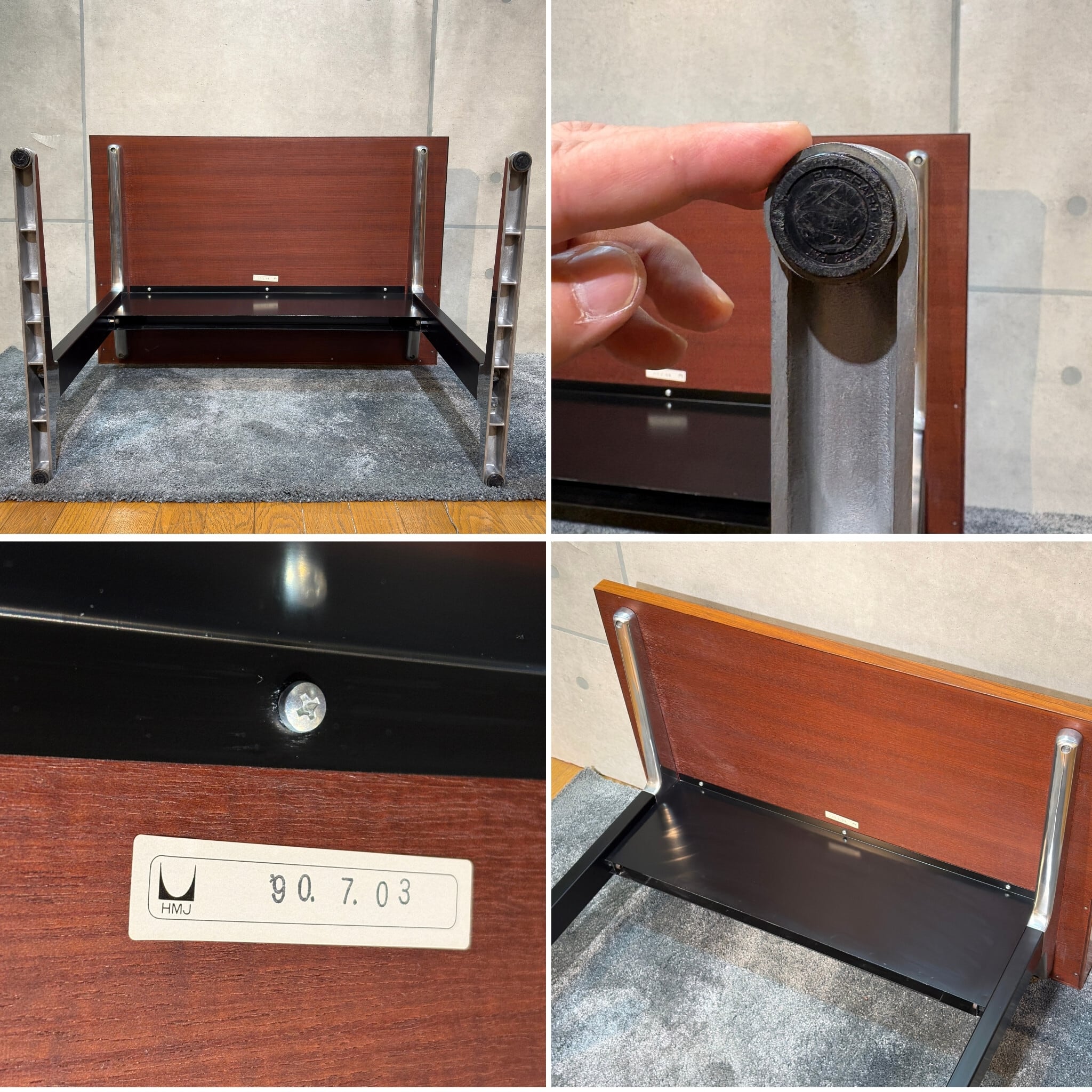 天板および周囲の立ち上がり、側面に至るまで深い色味と直線的な木目を持つ濃色木質突板が用いられており天板全体が同一素材で統一された非常に手間のかかる仕様です。樹種の特定は困難ですがローズウッドを想起させる落ち着いた表情を備えており、当時のハーマンミラーがオフィス家具としての再現性と品質の安定を重視して選定した高級木質突板であったと考えられます。