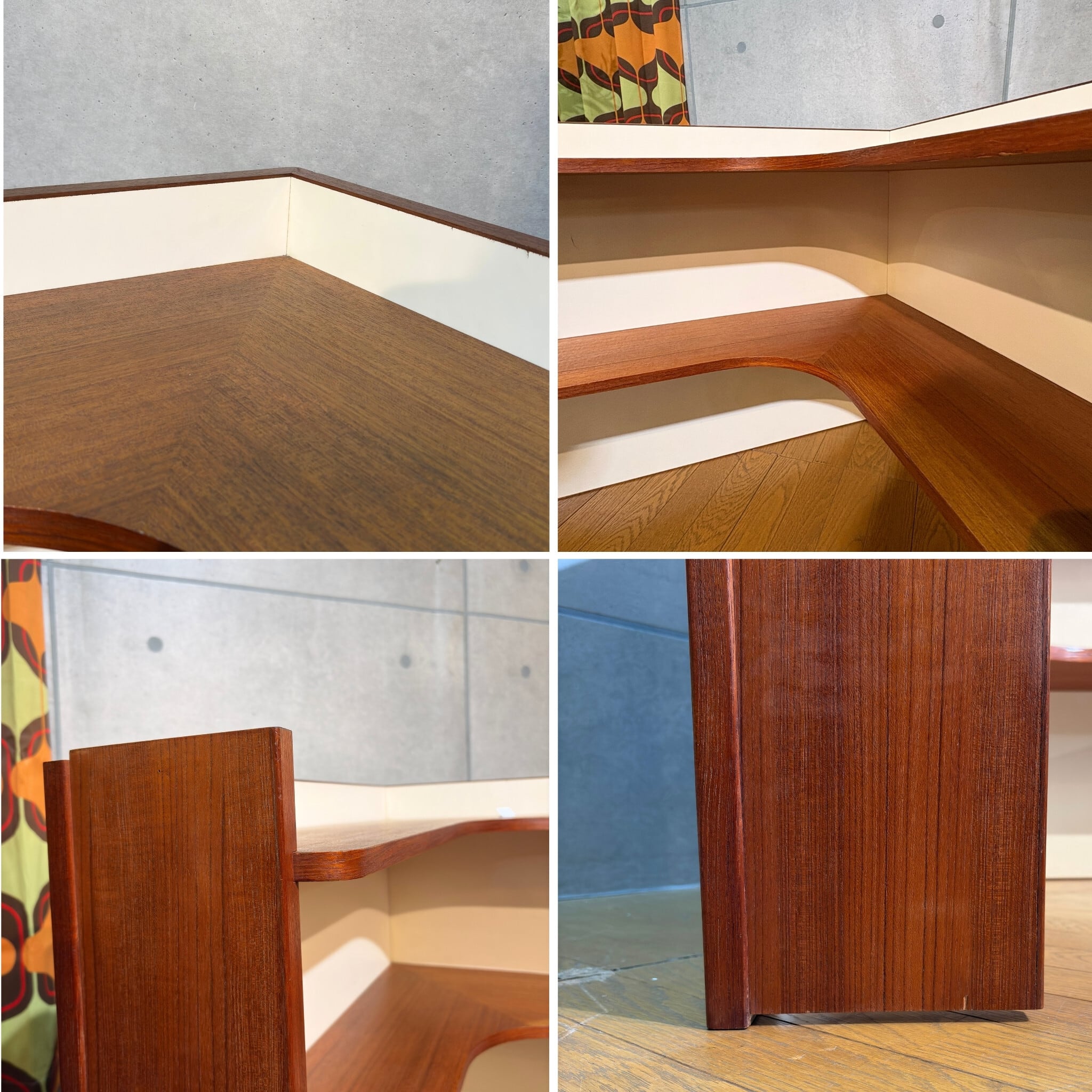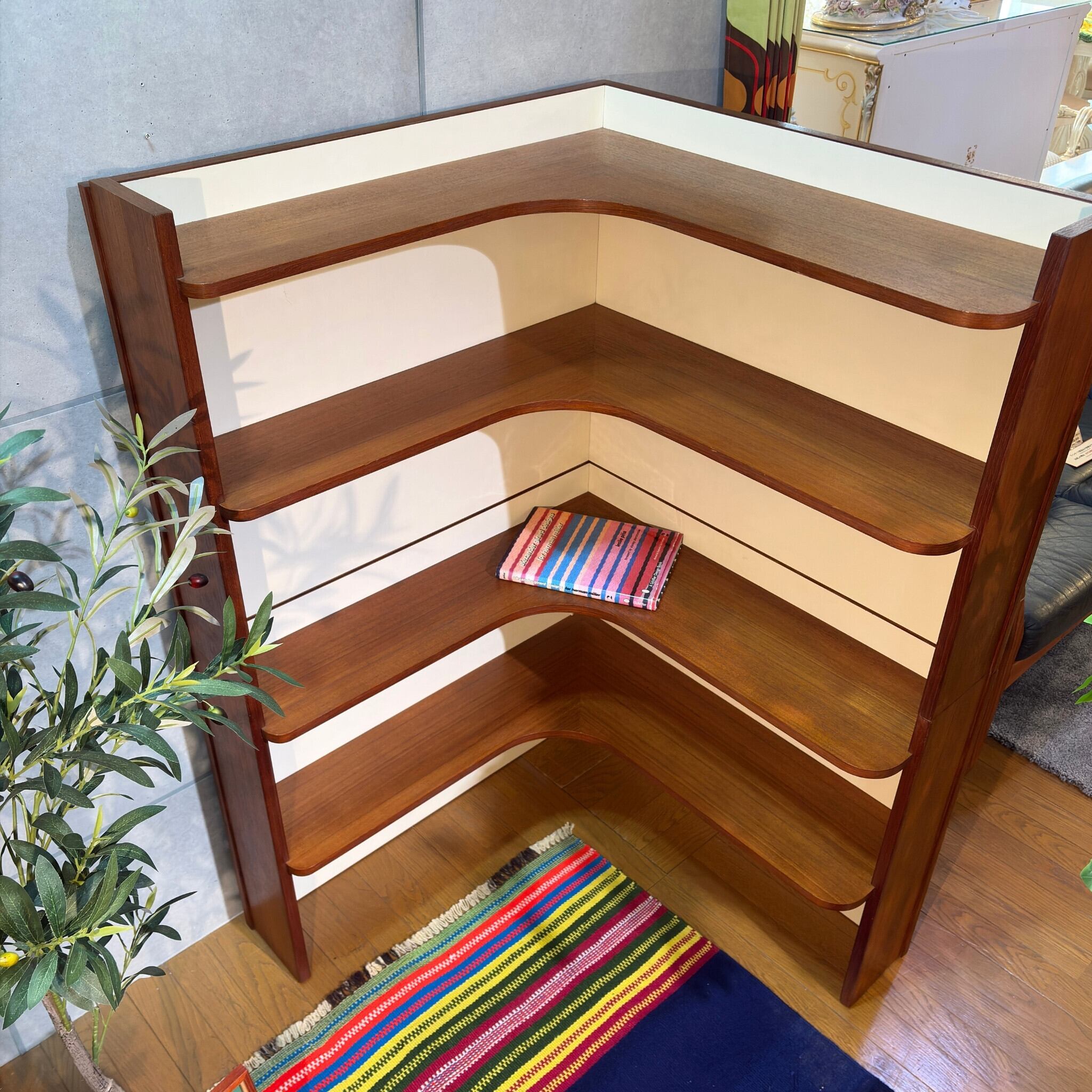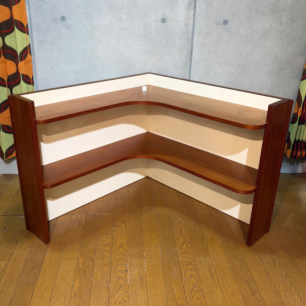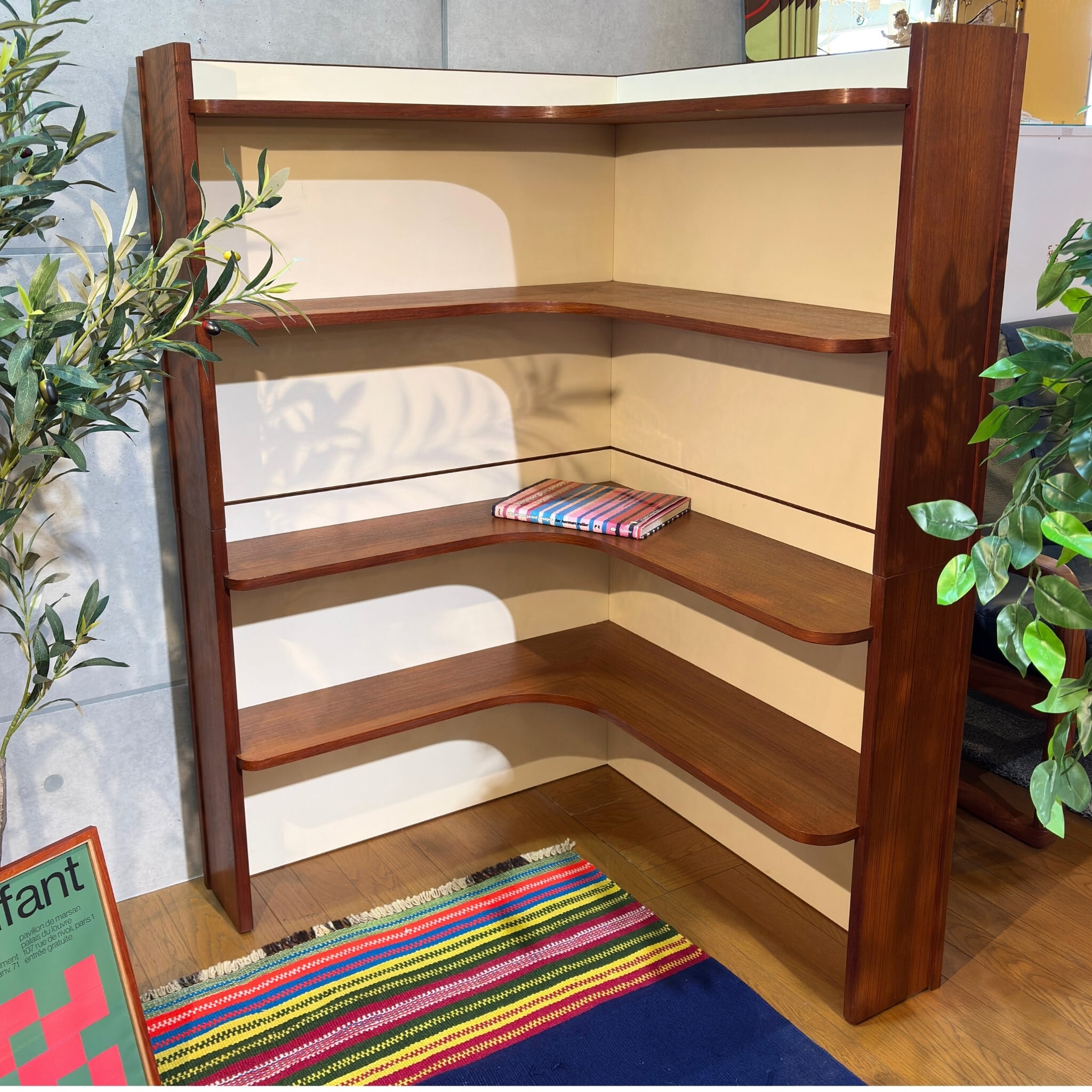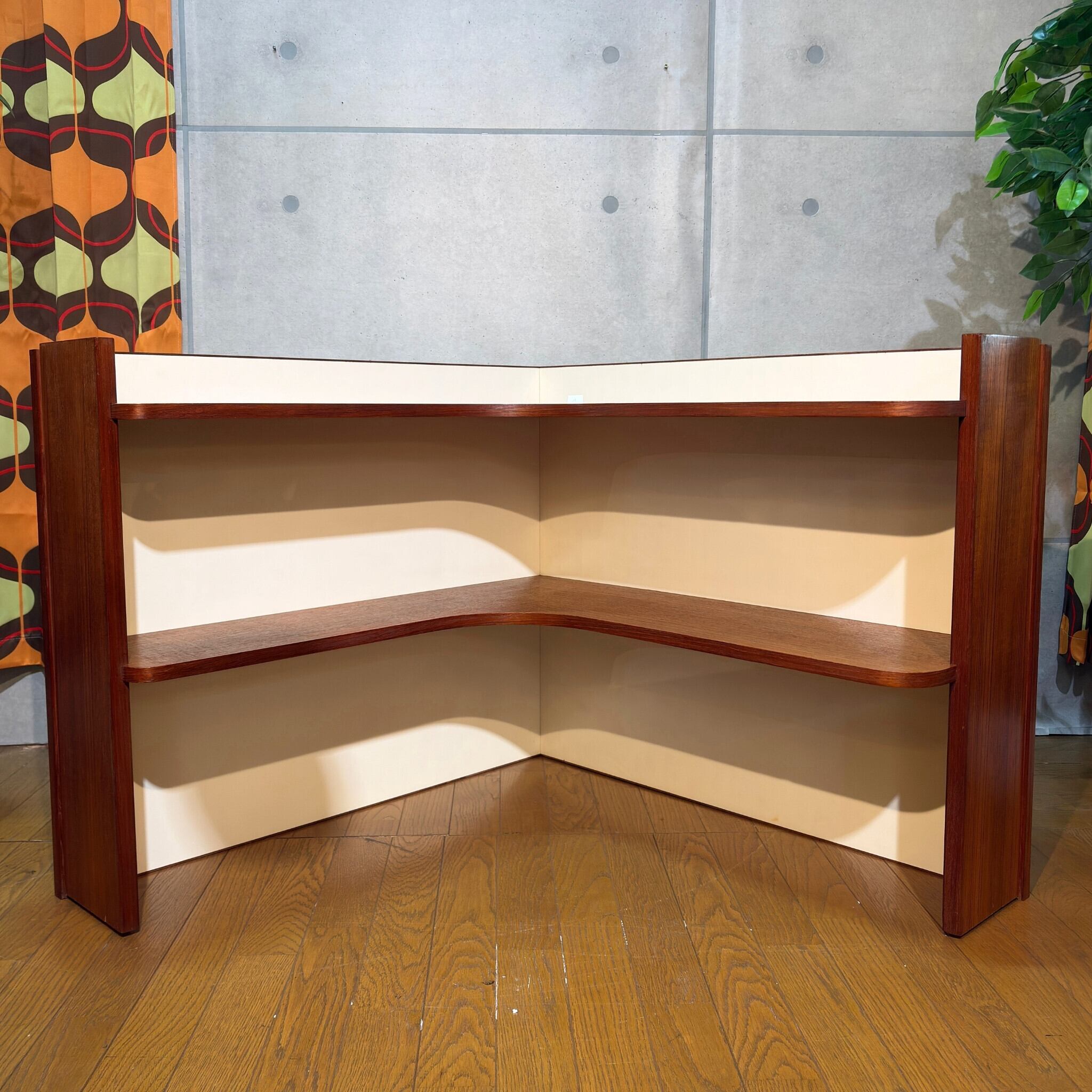 1970年代後半〜80年代初頭頃、日本製のモジュール型コーナーシェルフです。R加工された棚板、外側に金物を見せない箱組構造、白い背板とのコントラストなど、量産家具では成立しない工程が随所に見られます。直線と緩やかな曲線を組み合わせた造形や無駄を削ぎ落とした構成からは当時の北欧デザインを強く意識して作られたことが感じられ、日本の住空間に北欧的なモダンさを取り入れようとした時代背景も読み取れます。