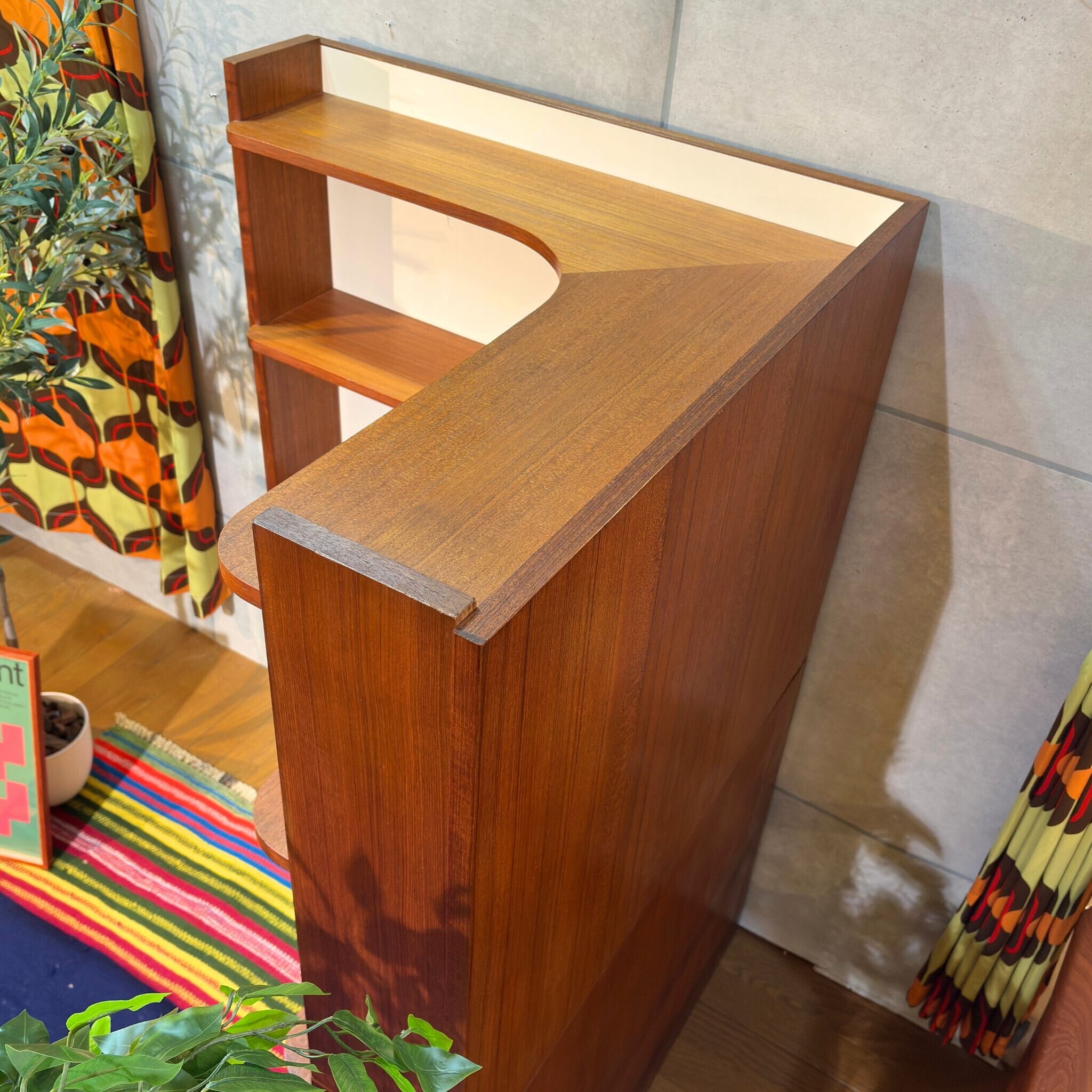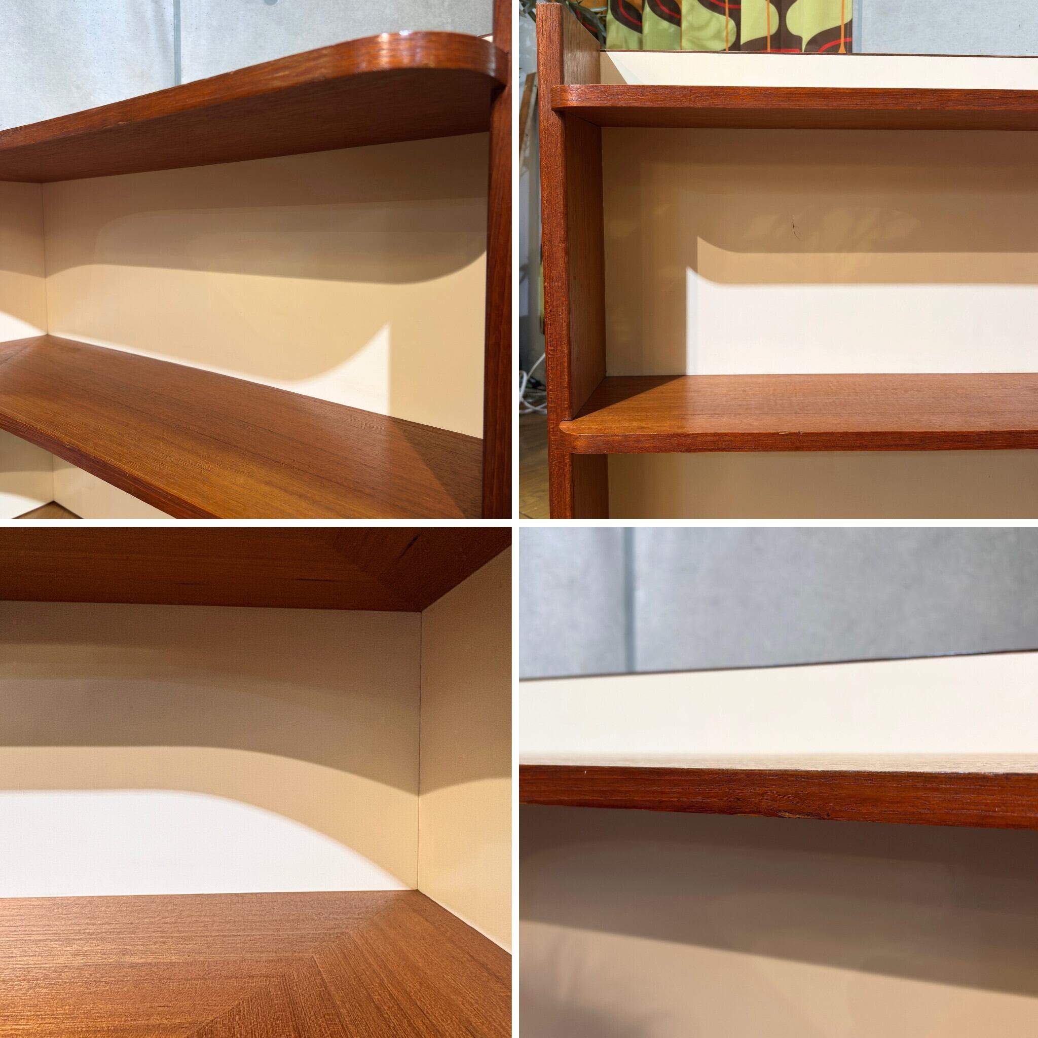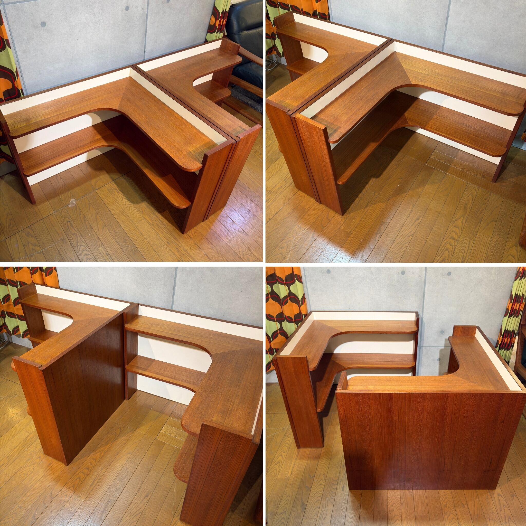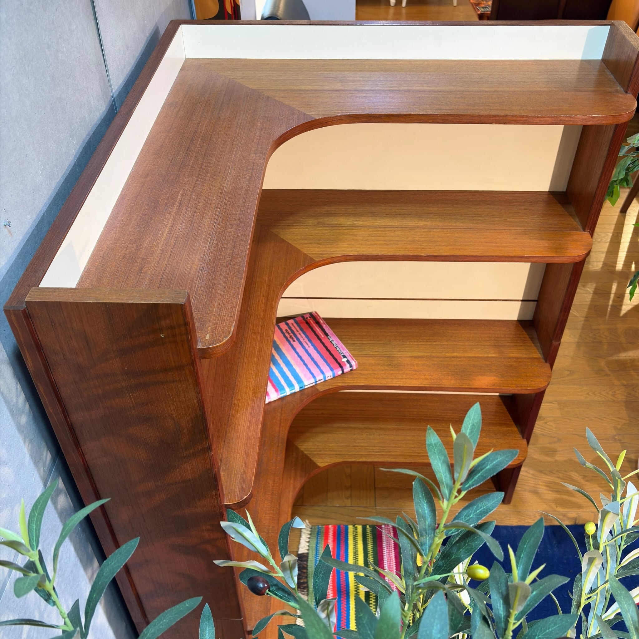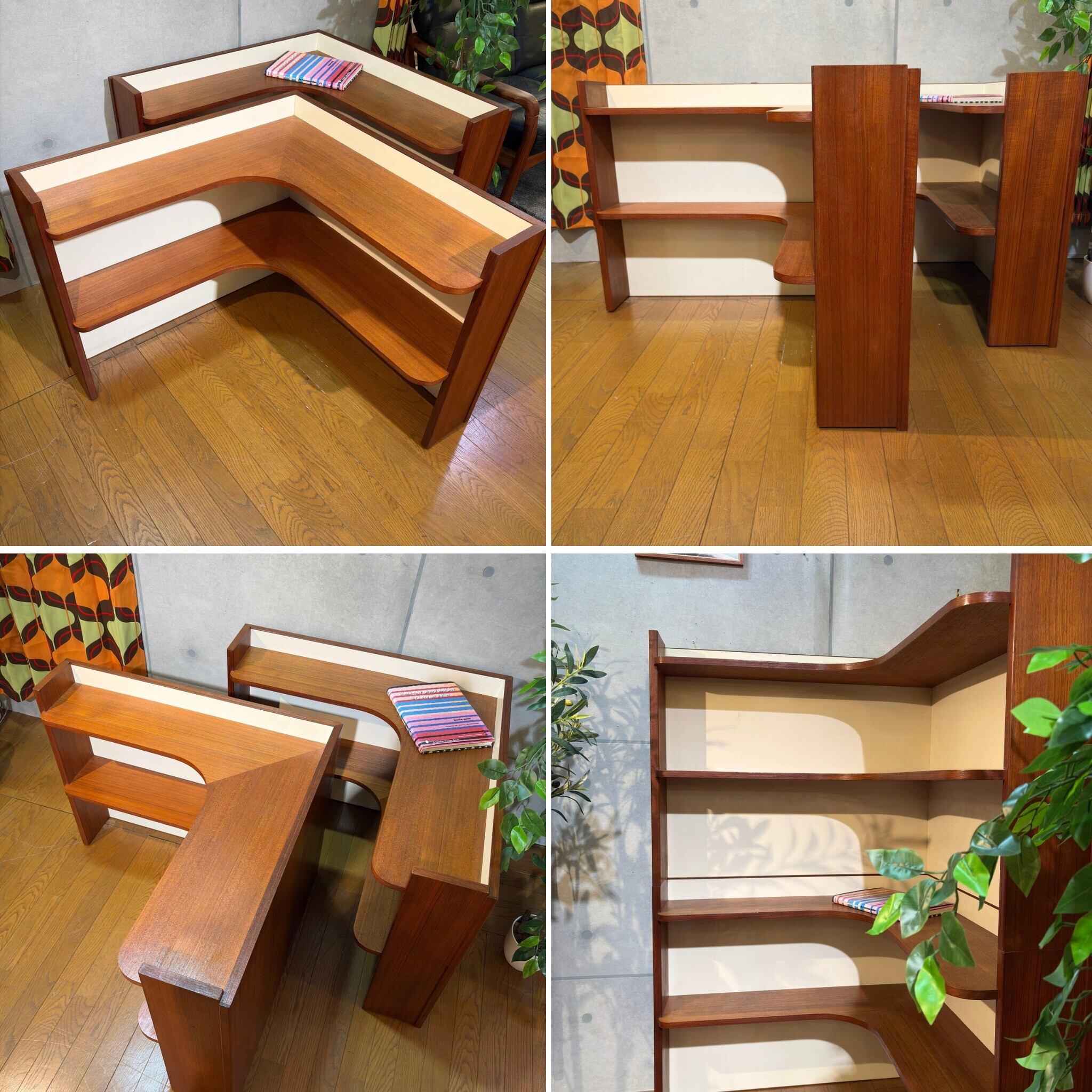 1970年代後半〜80年代初頭頃、日本製のモジュール型コーナーシェルフです。R加工された棚板、外側に金物を見せない箱組構造、白い背板とのコントラストなど、量産家具では成立しない工程が随所に見られます。直線と緩やかな曲線を組み合わせた造形や無駄を削ぎ落とした構成からは当時の北欧デザインを強く意識して作られたことが感じられ、日本の住空間に北欧的なモダンさを取り入れようとした時代背景も読み取れます。