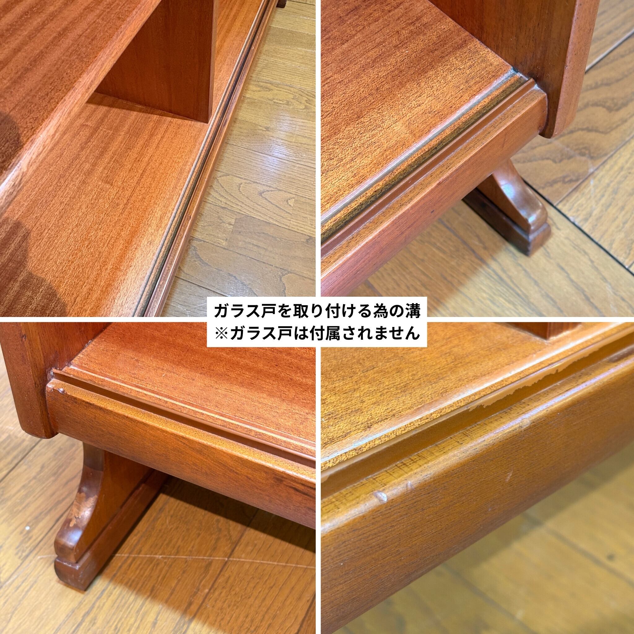 本来は下段にガラス戸(引戸)が付く仕様だったと思われますが仕入れ時点でガラス戸が欠品していました。溝などの名残はありますがオープン棚として販売をさせていただきます。