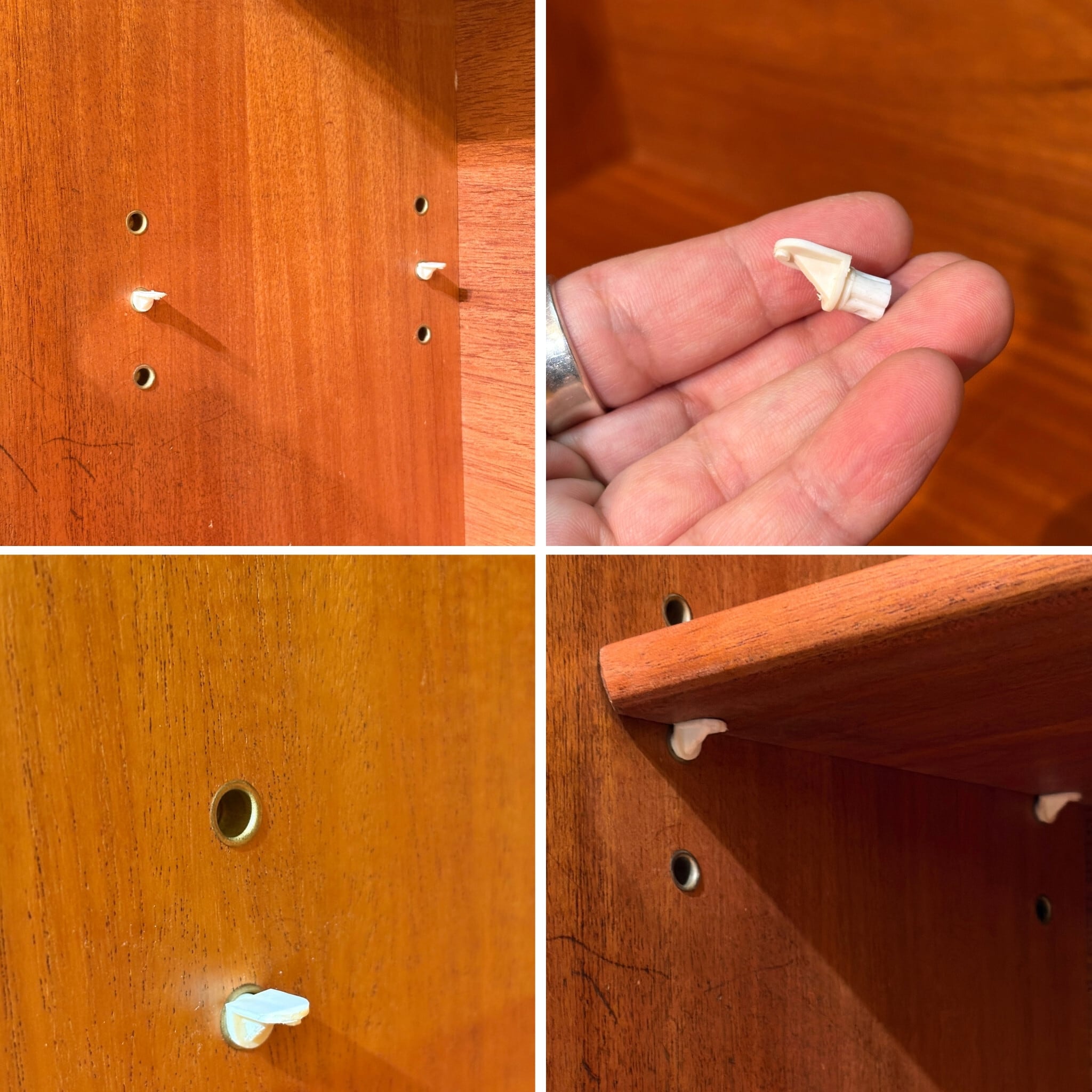 下段 左右の2枚は可動棚となります。棚受けには当時らしい樹脂パーツが使われていて多少の高さ調整が可能です。溝にはめ込んだりするのではなく、棚受けに乗せるだけの構造ですので