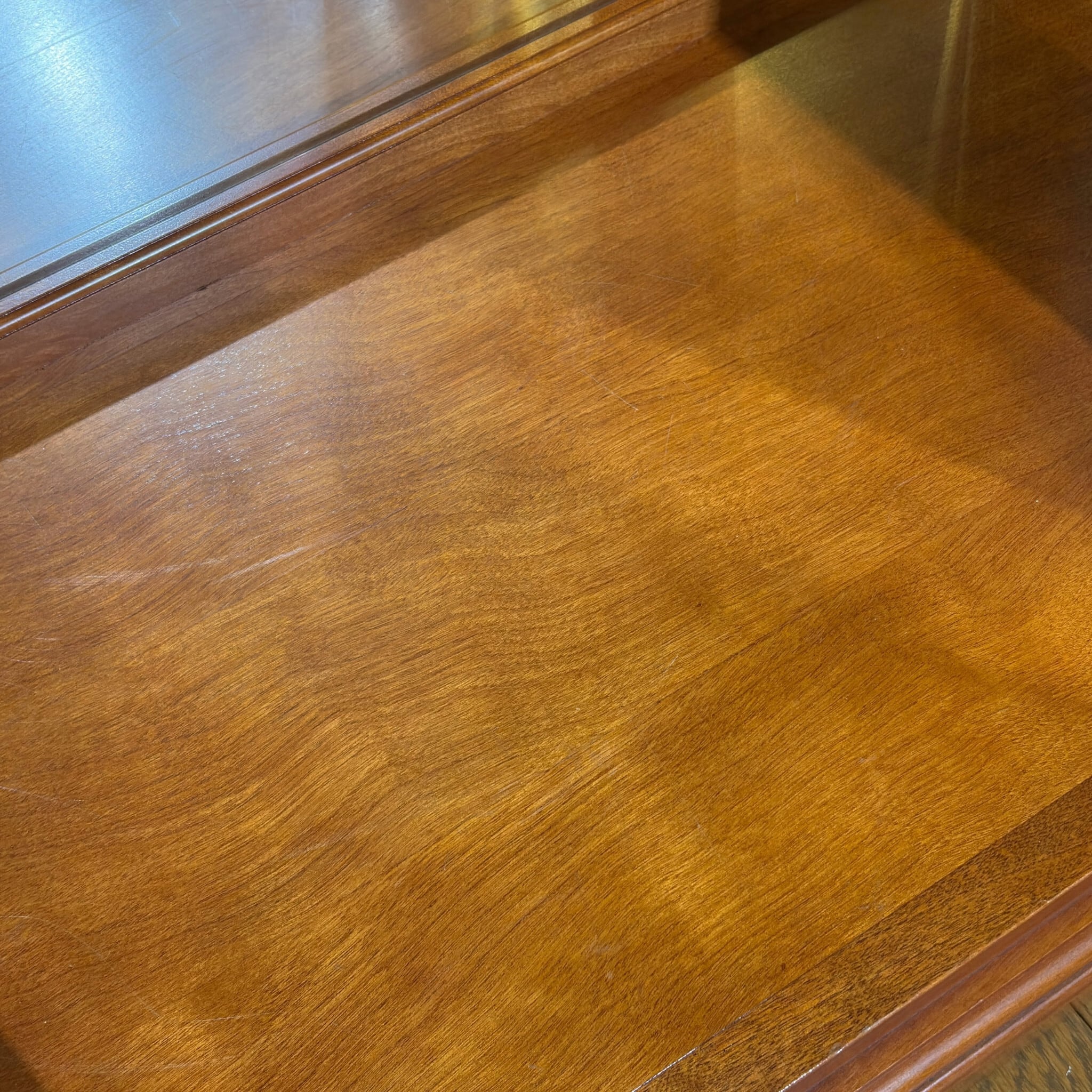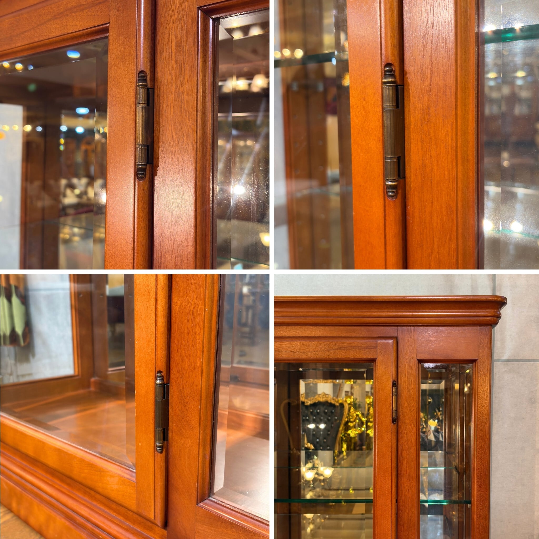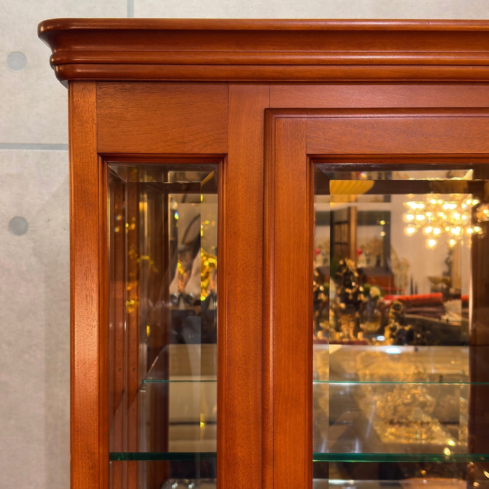 深みのあるチェリー色。三面ガラスの抜け。背面ミラーがつくる奥行き。重厚さを誇る家具ではなく色と光で空間を整える家具。