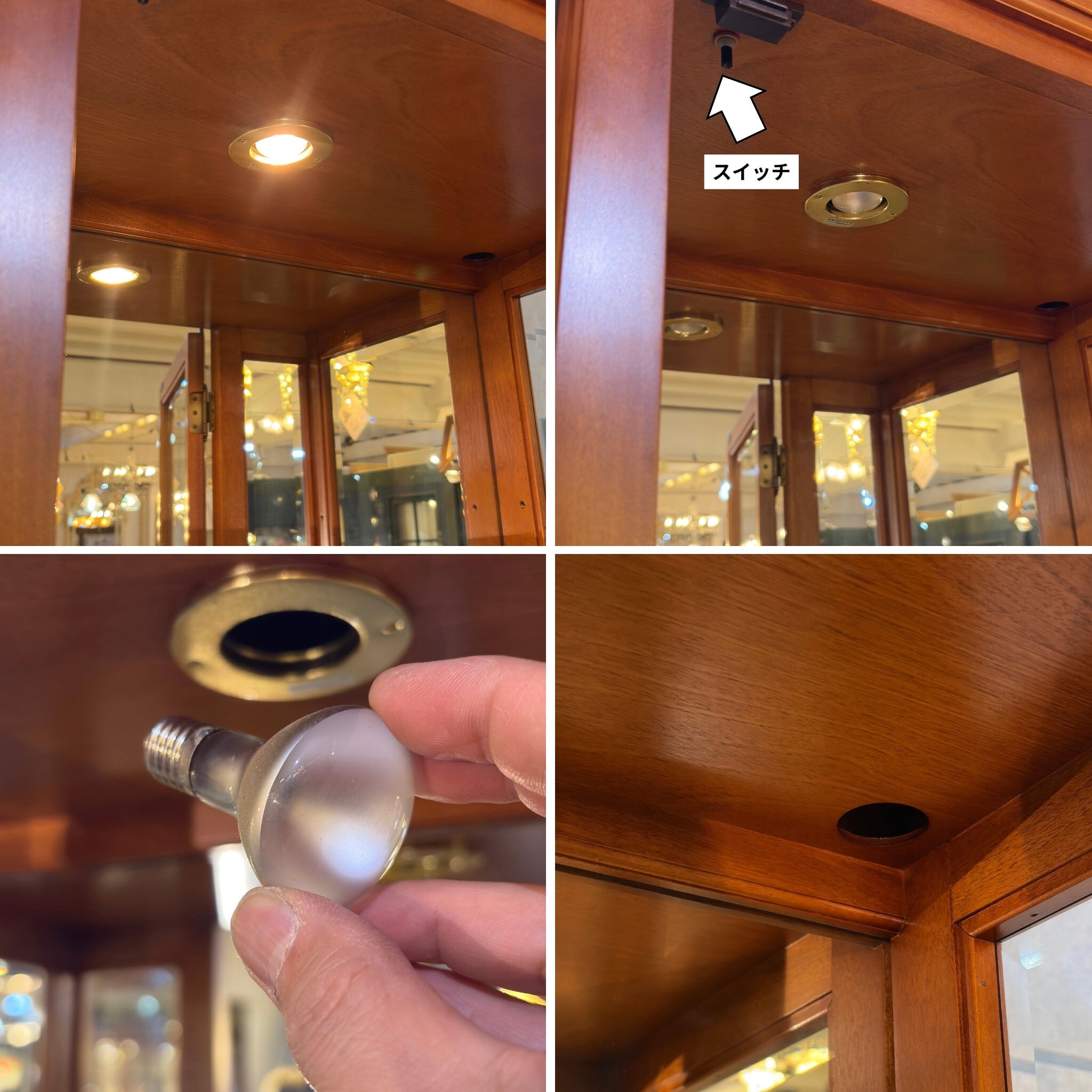 内部にはダウンライトを1灯内蔵。点灯確認済みでスイッチも正常に機能しています。※天面奥 左右の穴は製造時における配線取り回し用に空いているものであり、使用しません。