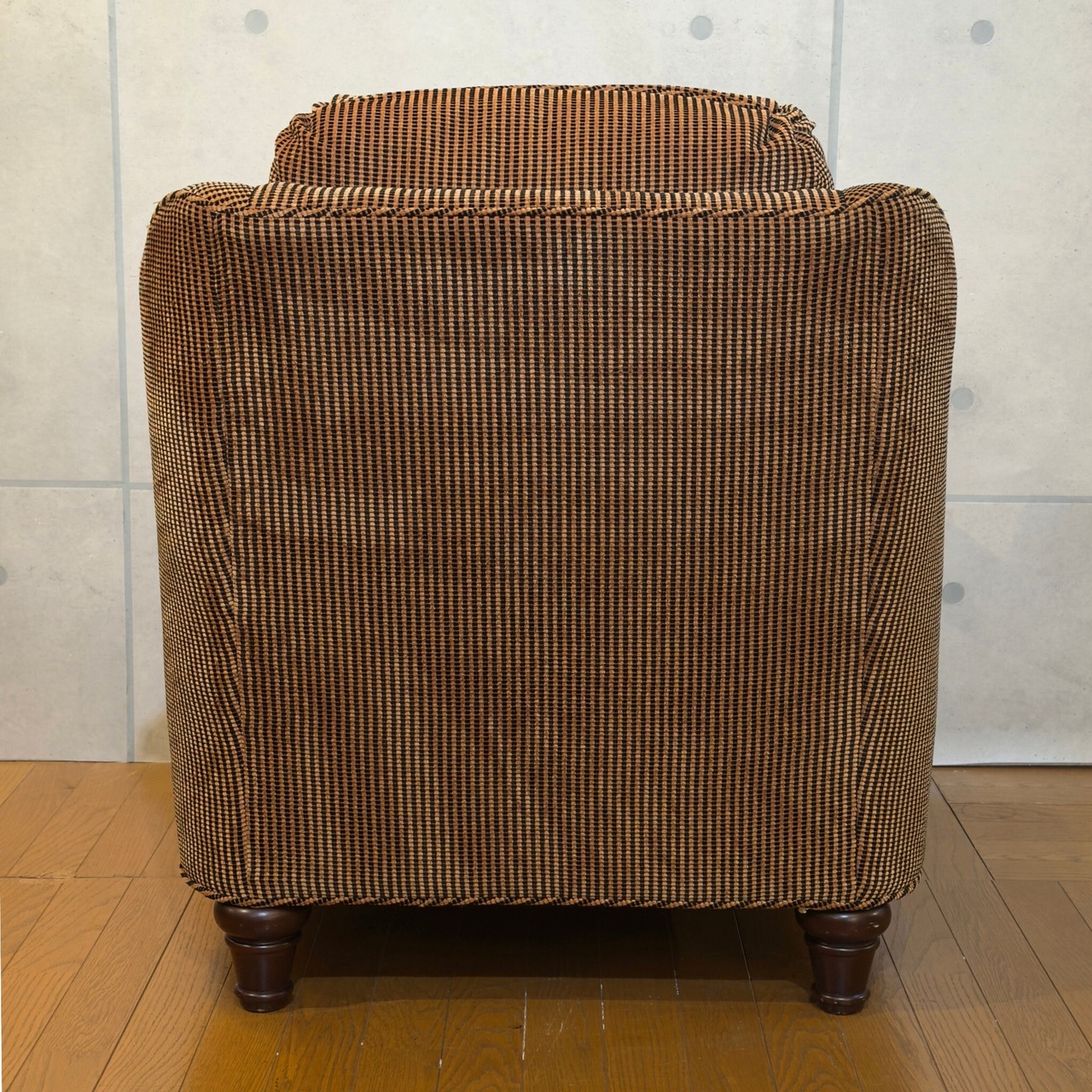 特別大きな1人掛けではありませんが座面と背のクッションにしっかり厚みがあり、硬く押し返すのではなく身体を受け止めるような座り心地です。アメリカやカナダ製ソファの特徴である、ゆったりとした少しやわらかめの快適さを感じられます。