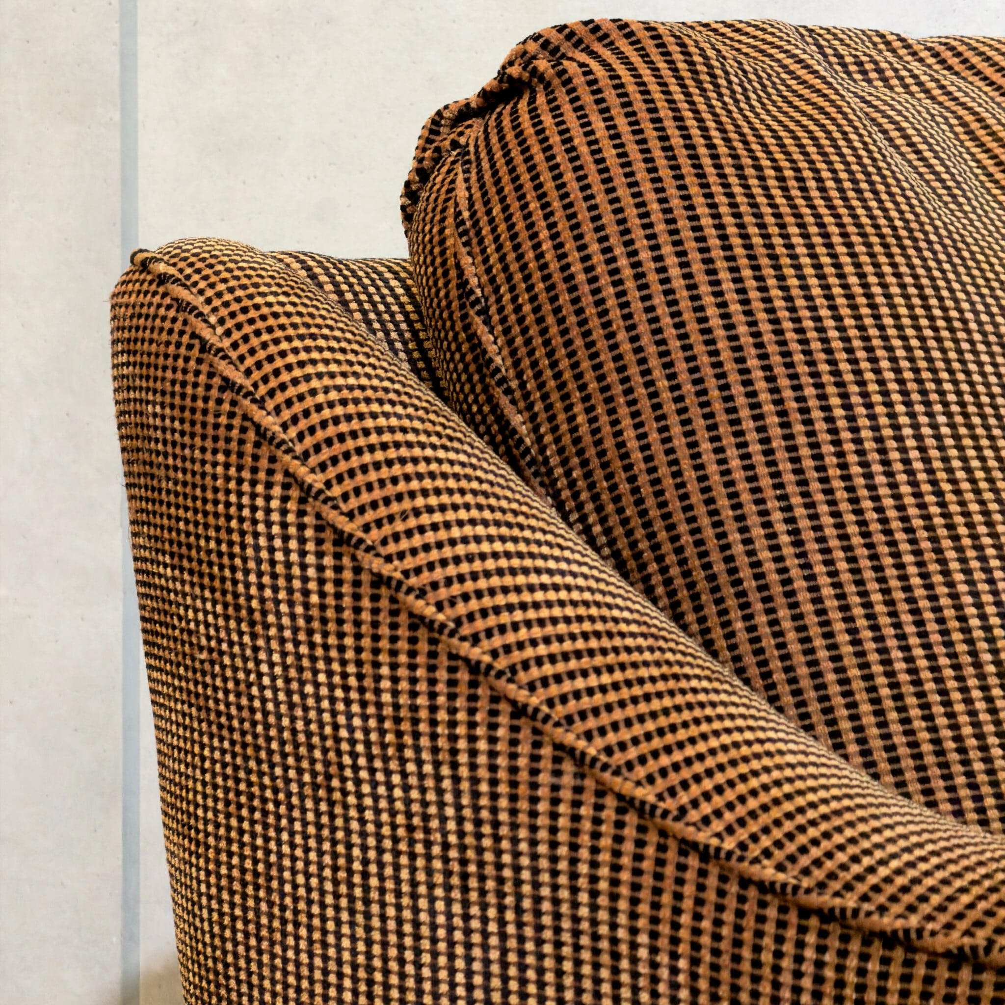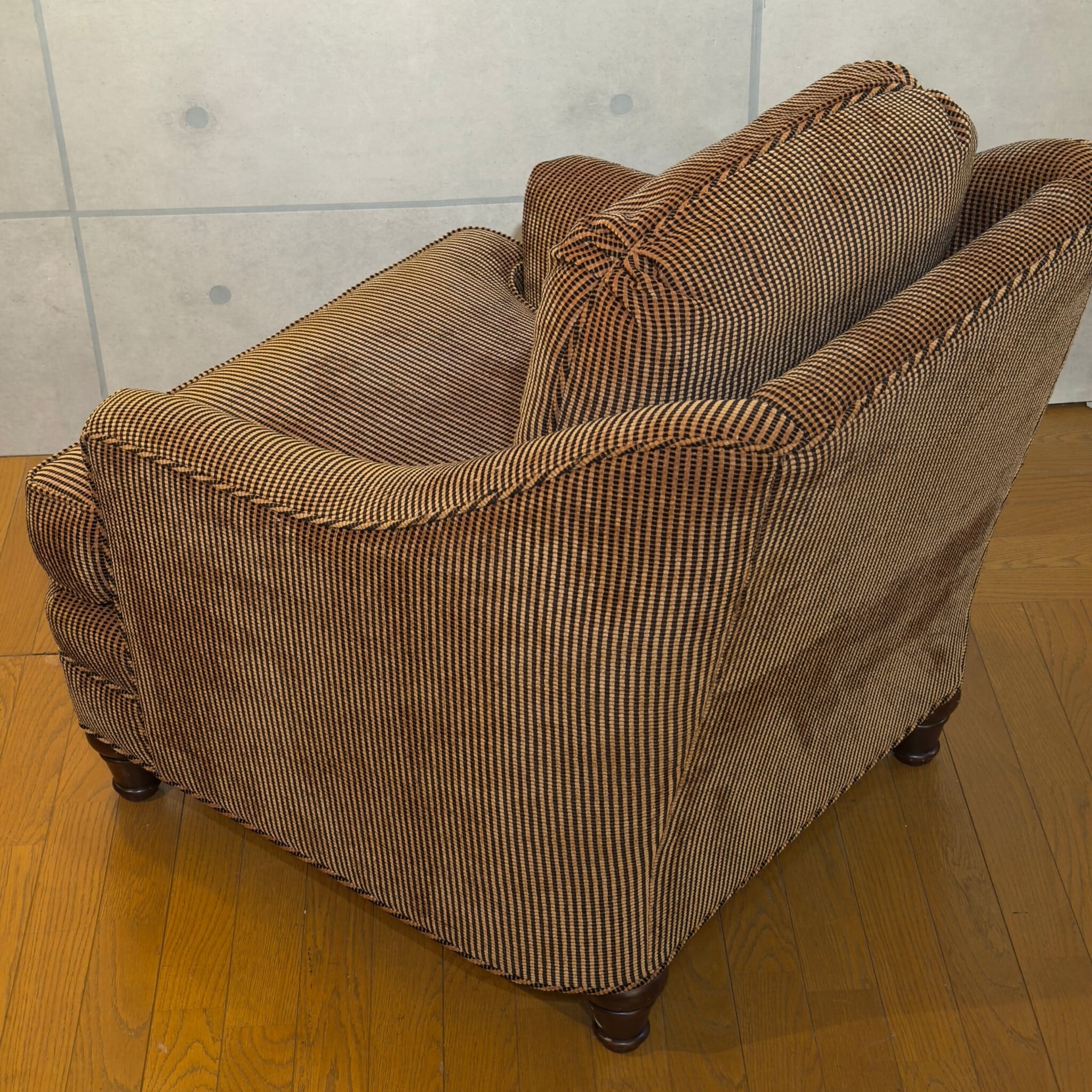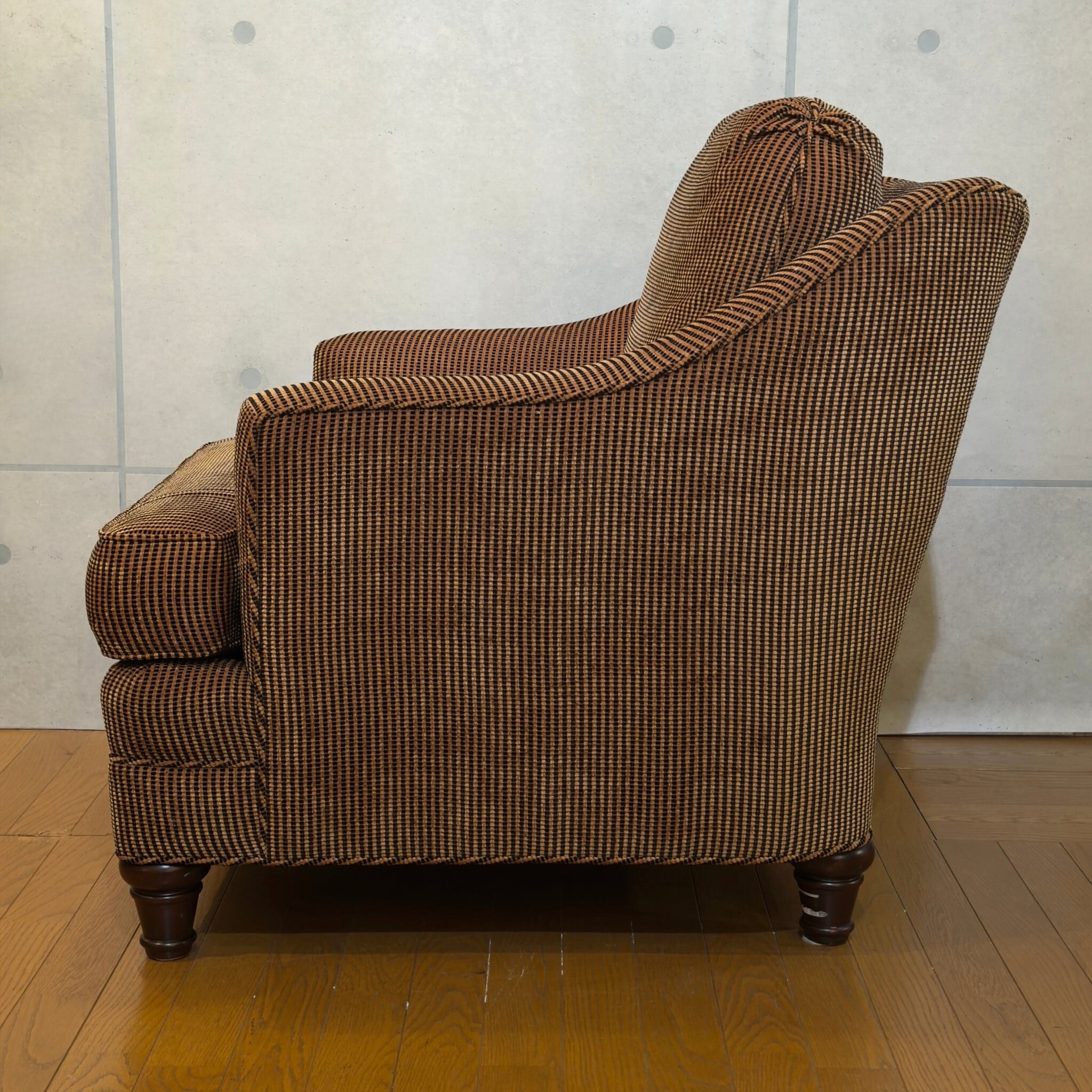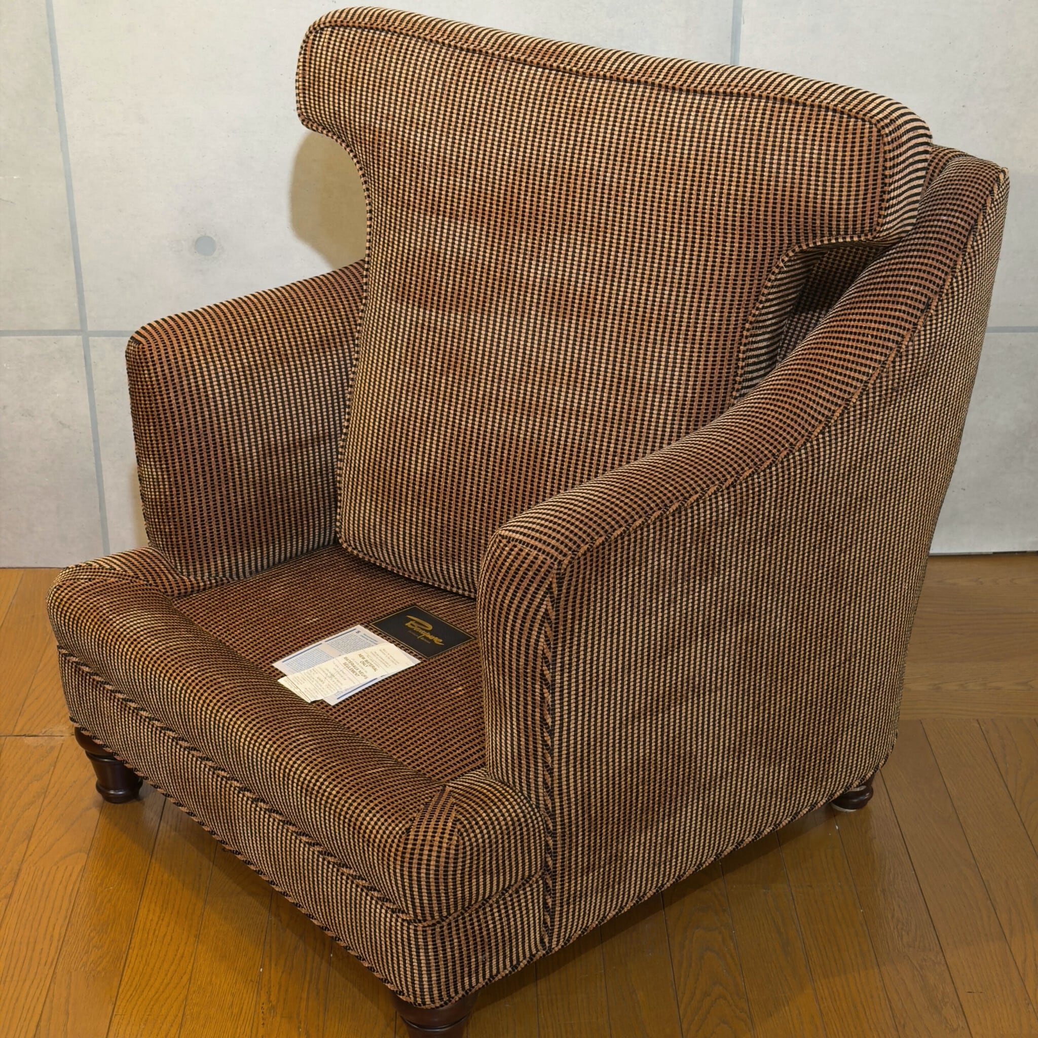 カナダ Barrymore Furniture Galleries の1人掛けソファです。同社は現在も続くソファメーカーで、今回の個体も座面下にメーカーラベルとケアラベルが残っています。日本ではあまり流通していない希少な個体です。