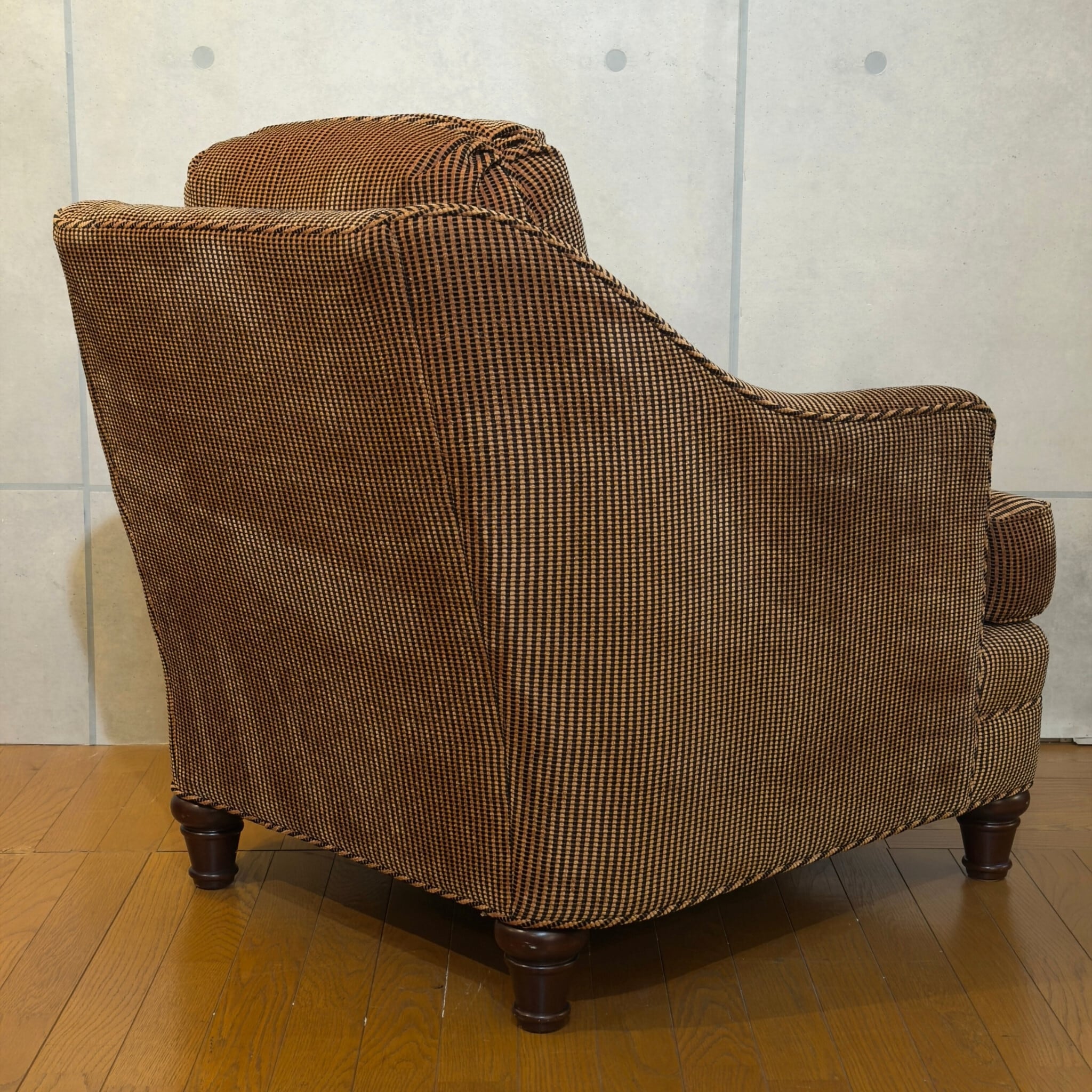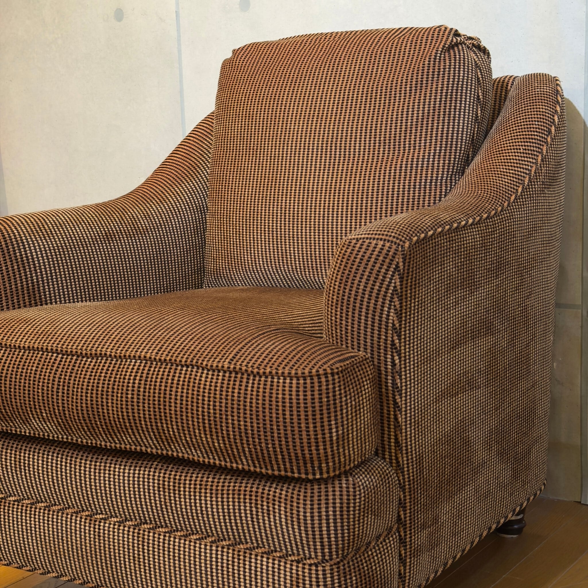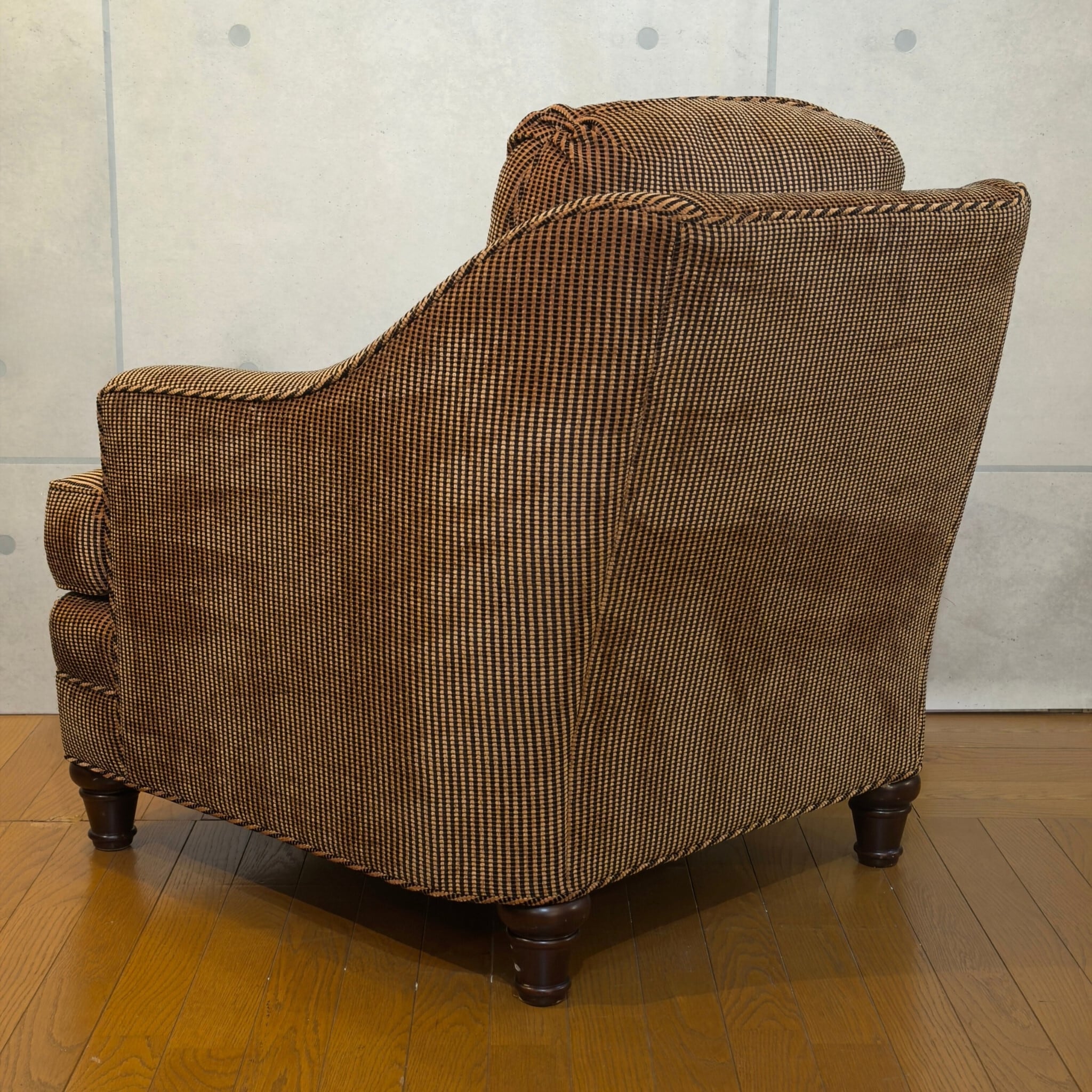 カナダ Barrymore Furniture Galleries の1人掛けソファです。同社は現在も続くソファメーカーで、今回の個体も座面下にメーカーラベルとケアラベルが残っています。日本ではあまり流通していない希少な個体です。