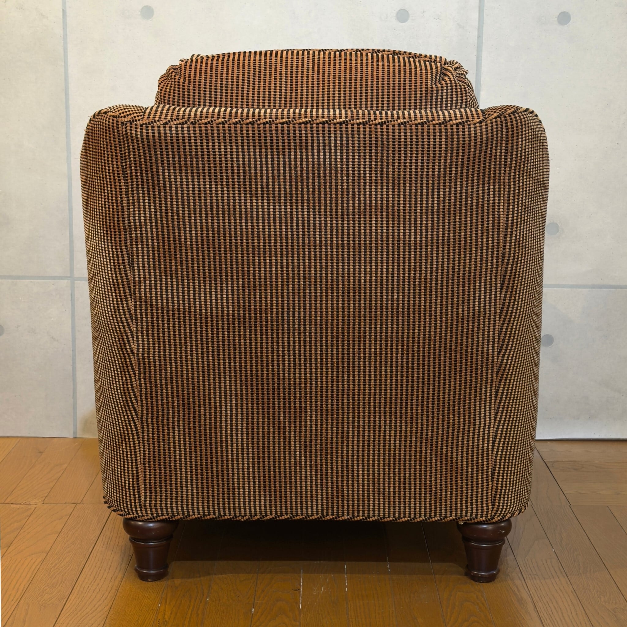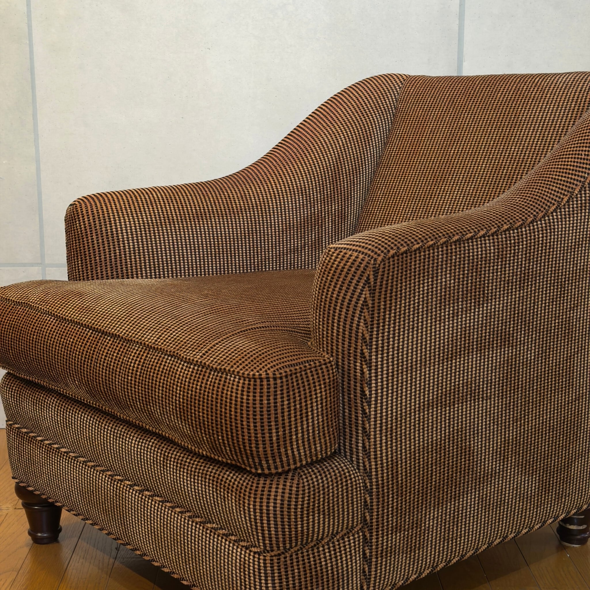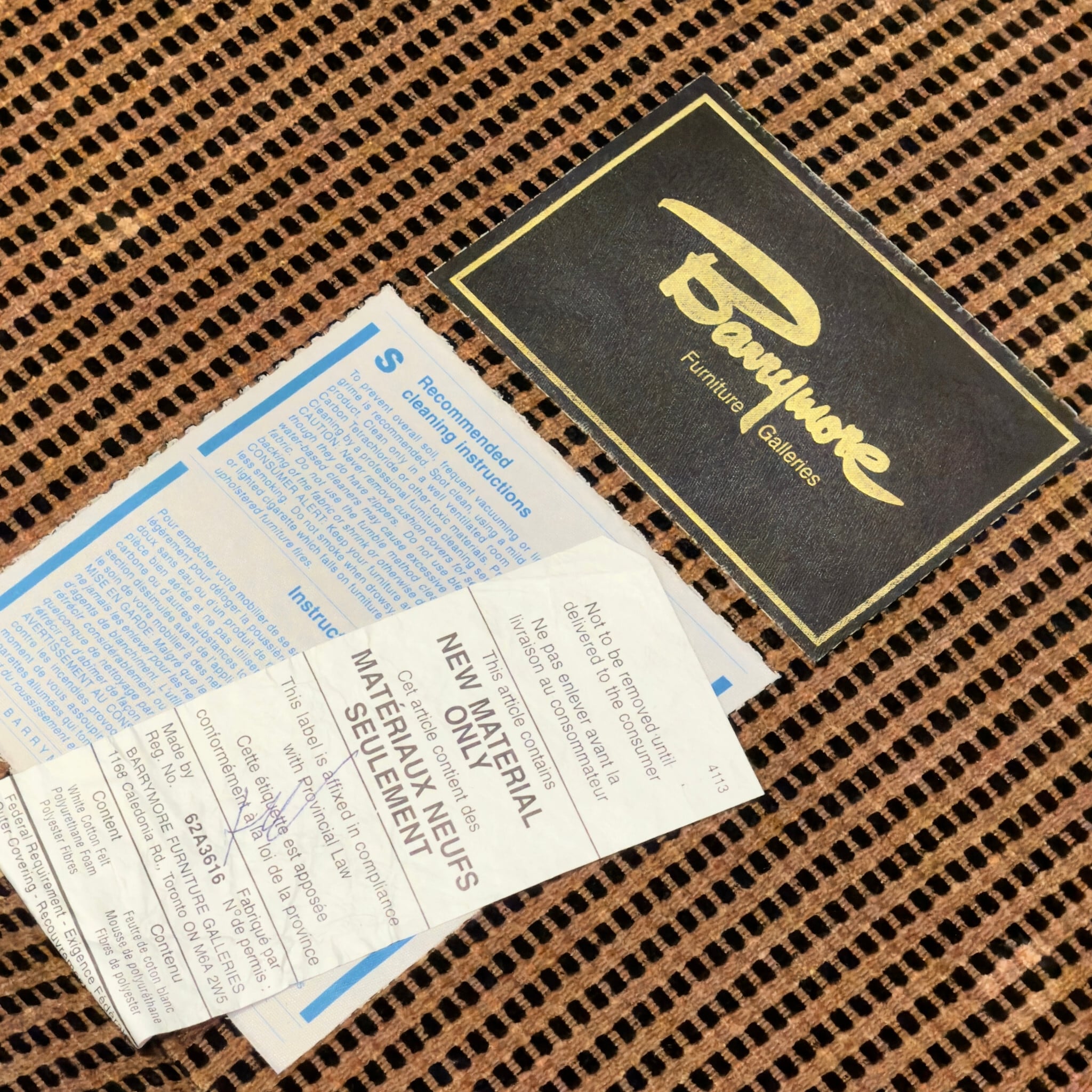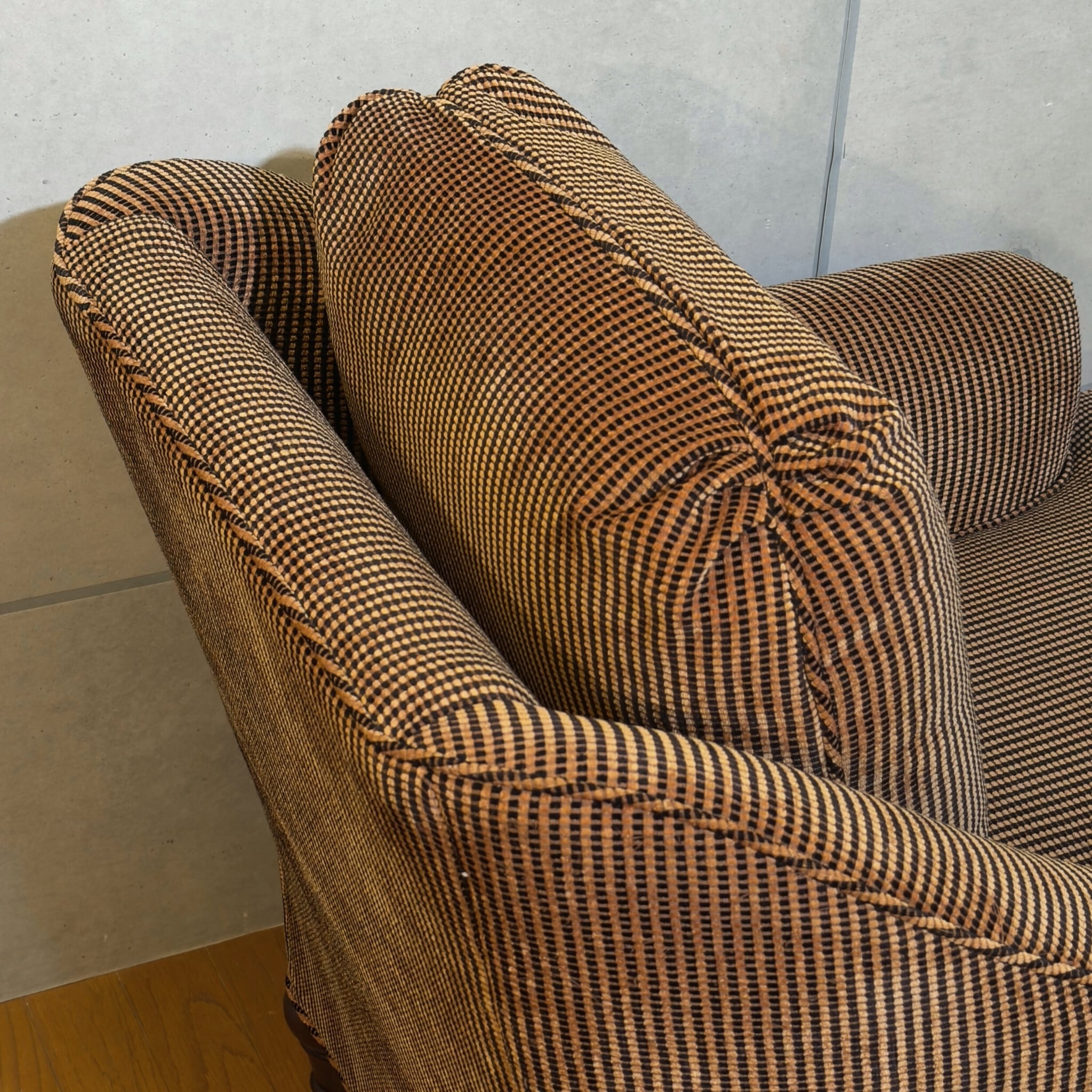 カナダ Barrymore Furniture Galleries の1人掛けソファです。同社は現在も続くソファメーカーで、今回の個体も座面下にメーカーラベルとケアラベルが残っています。日本ではあまり流通していない希少な個体です。
