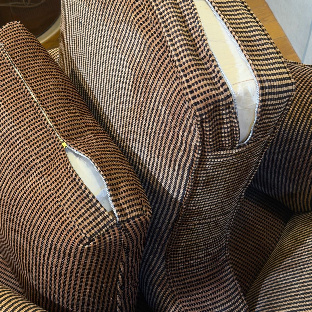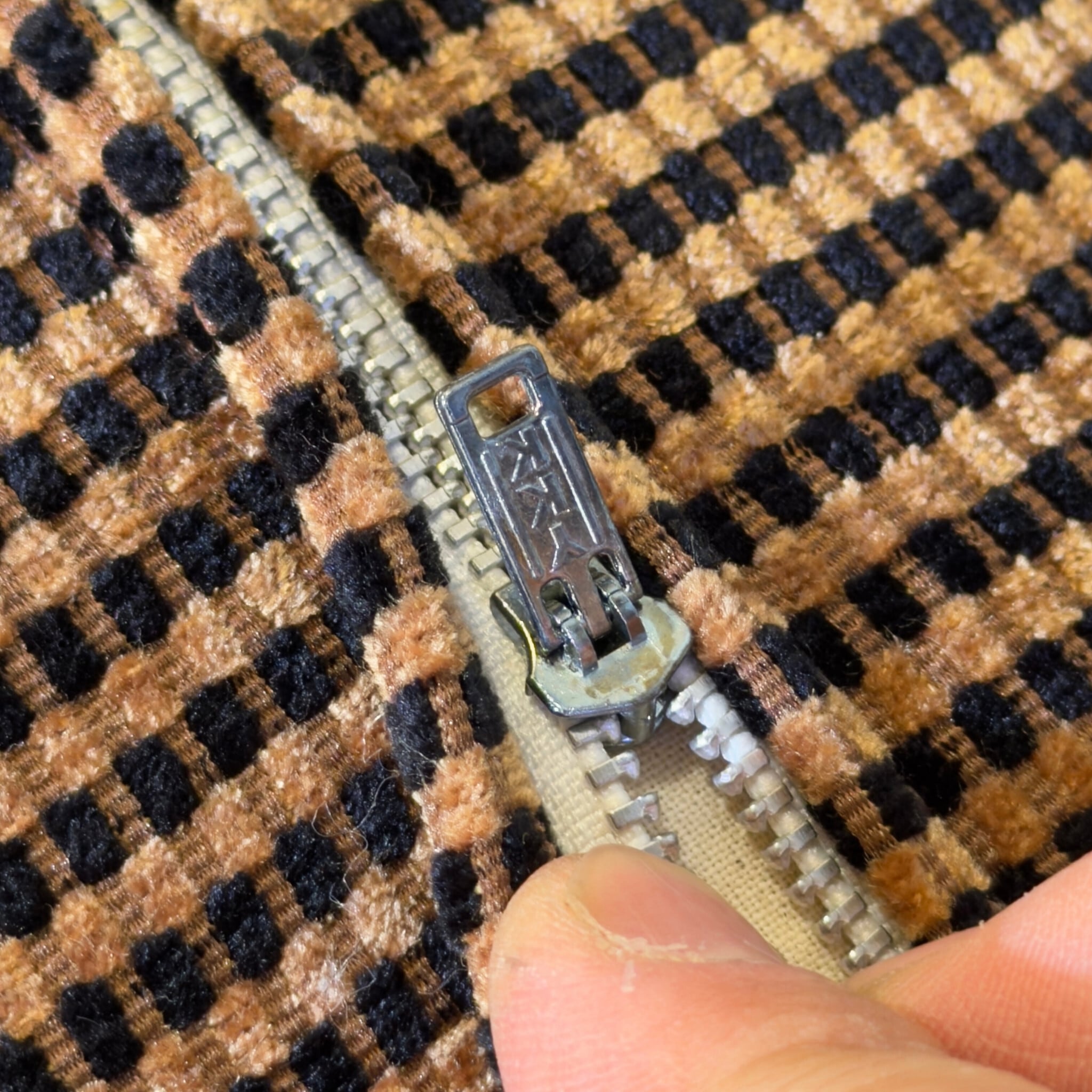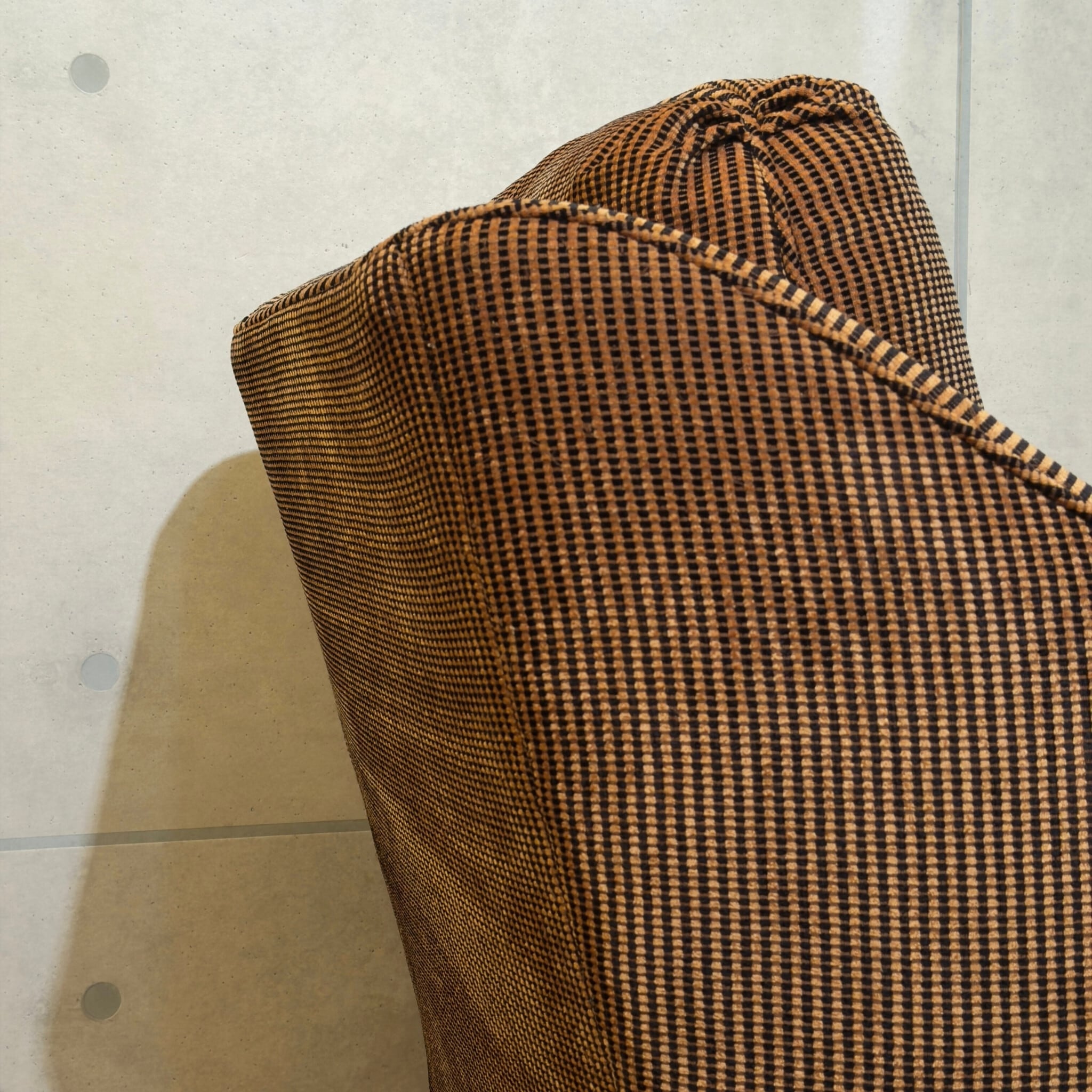 張地もとても印象的です。織りそのものによって細かな柄と凹凸がつくられていて近くで見るほど生地の面白さがあります。ベージュブラウンと黒の反復が小さな陰影を生み、温かみはありながらも甘くなりすぎません。現代の目線で見てもこの生地の雰囲気は十分に格好良いと思います。
