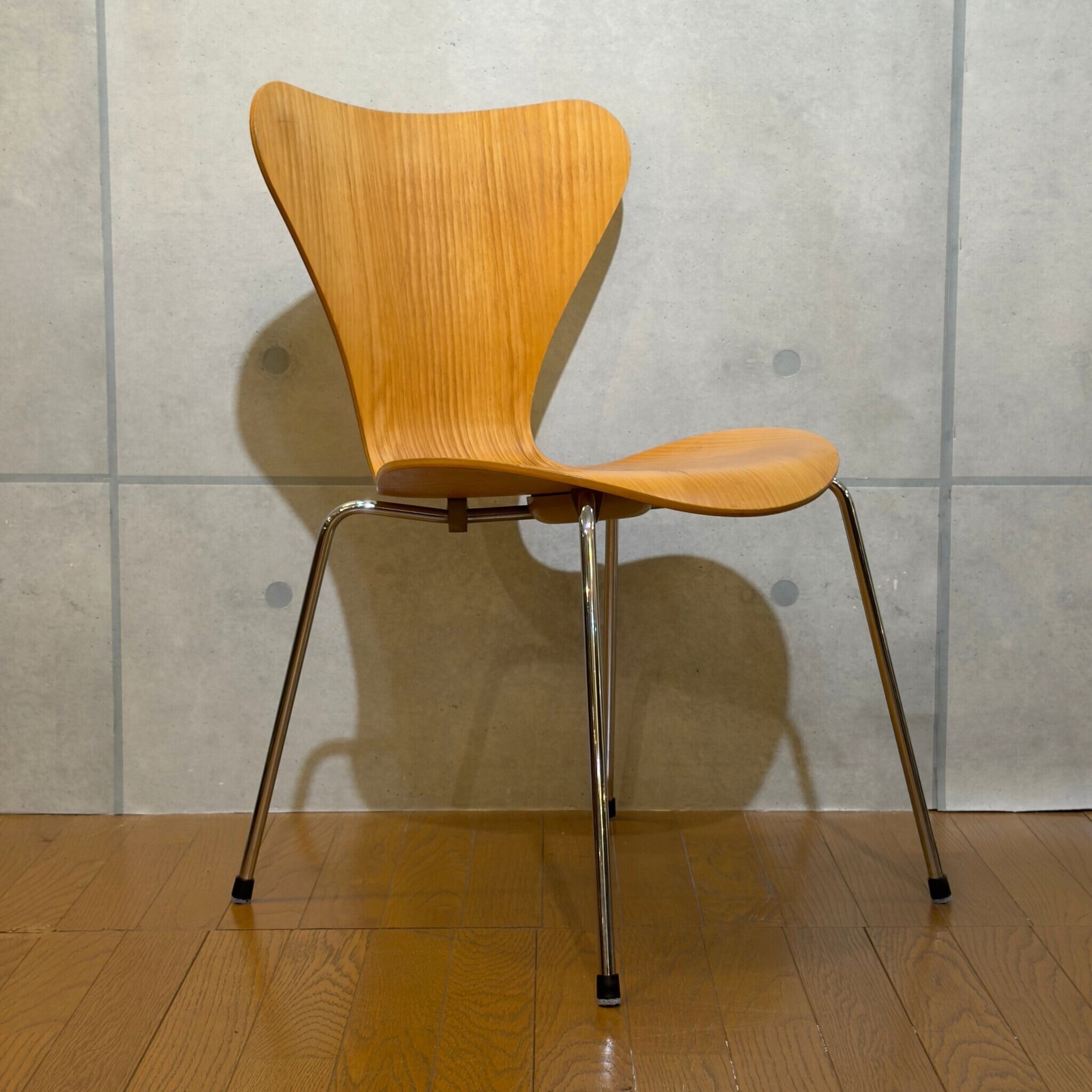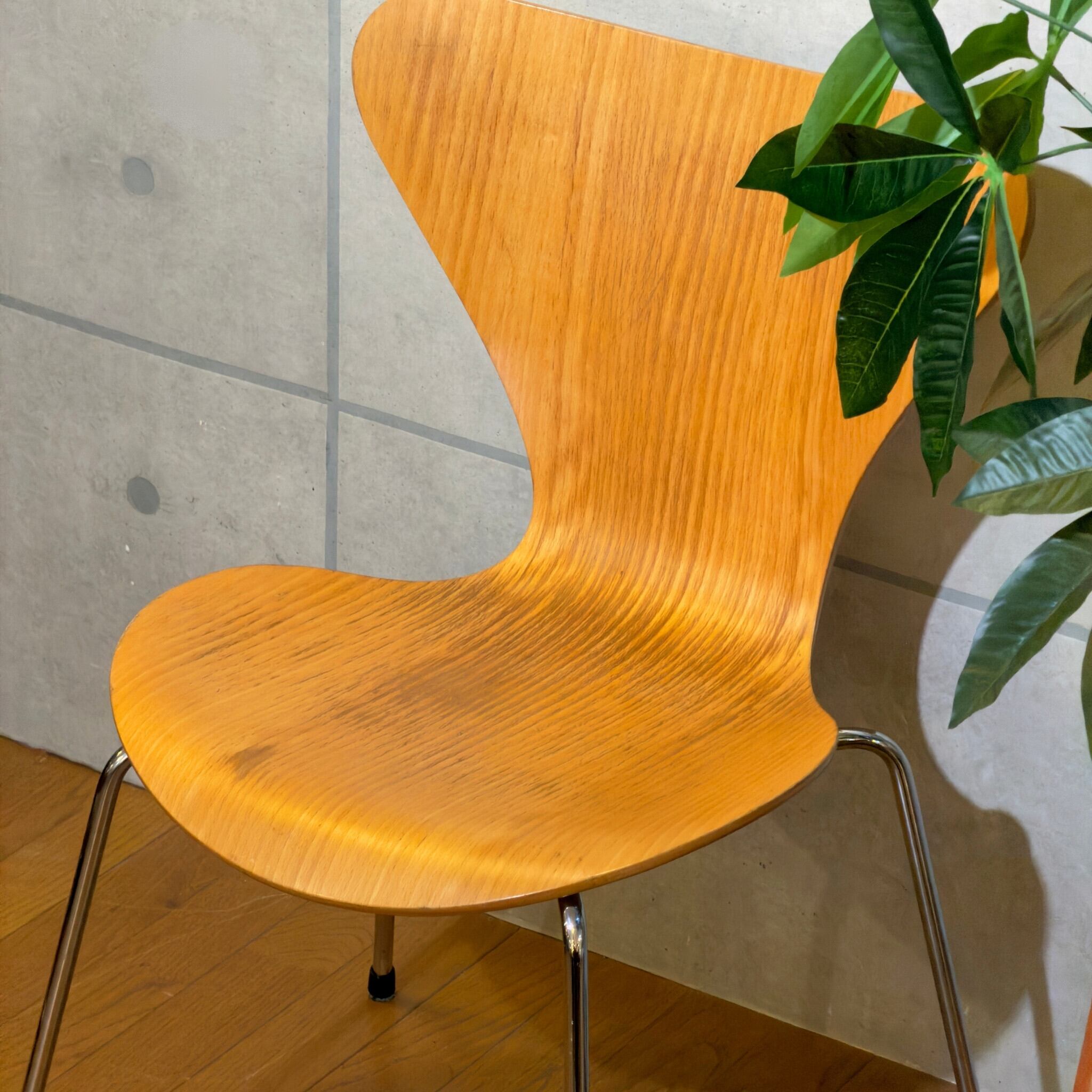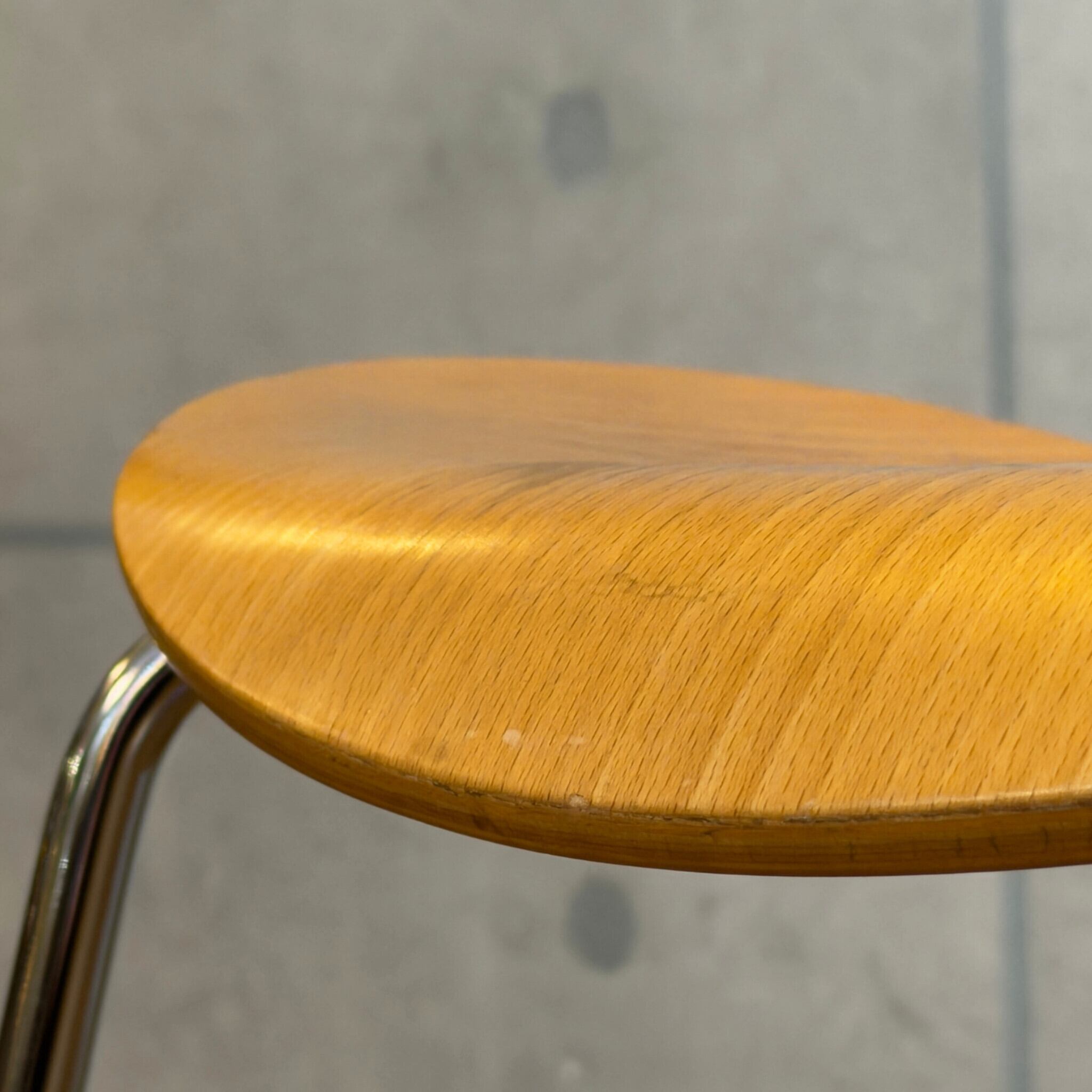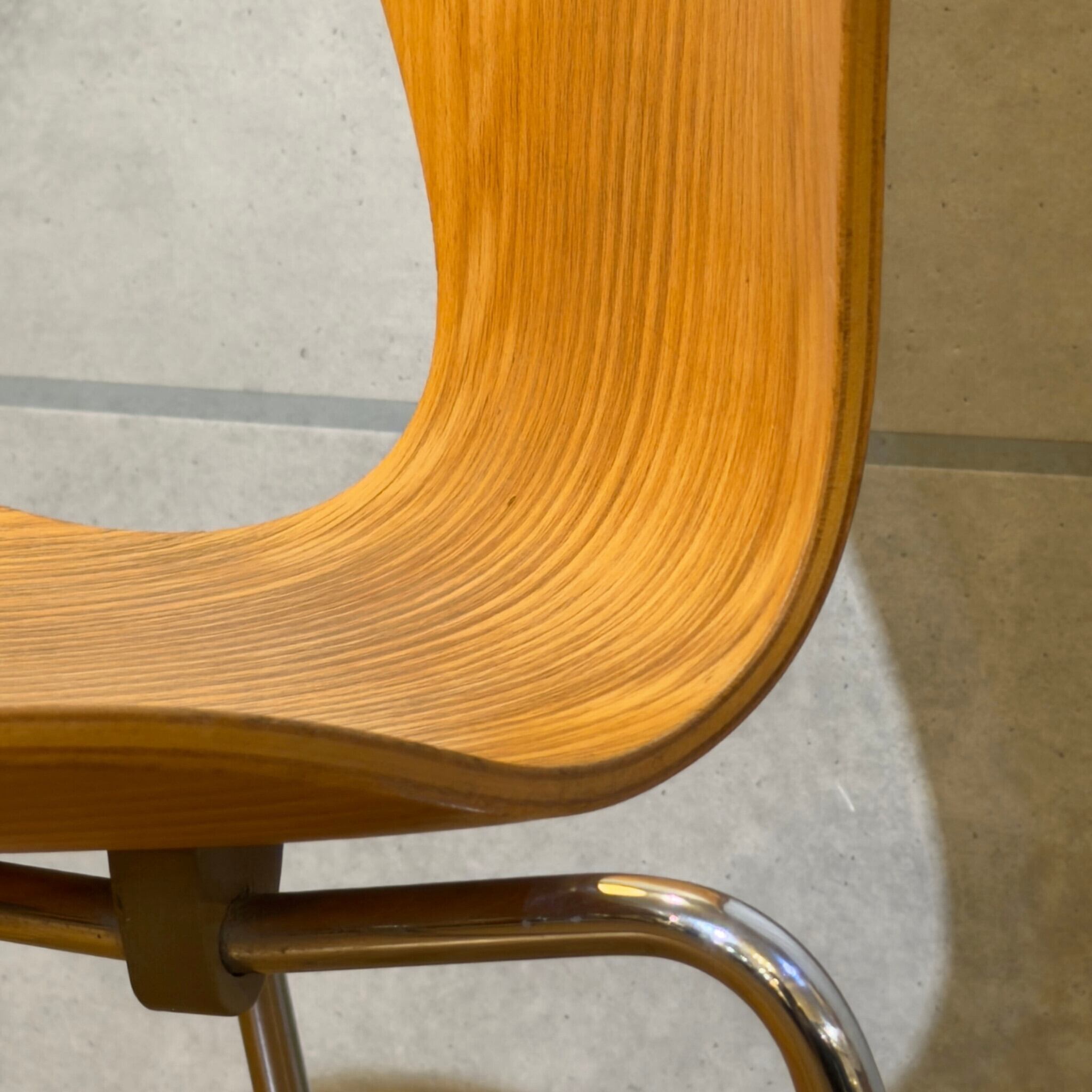 木目を塗りつぶす仕上げではなくオーク突板の表情が見える仕様(クリアラッカー仕上げと思われます)で、クローム脚との組み合わせも軽やかです。背から座まで一枚でつながるラインの美しさはもちろんですが木目の流れが素直に見えて、少し飴色に寄ったトーンが美しいです。明るい木の椅子でありながら軽すぎず、空間の中で浮きにくい印象があります。
